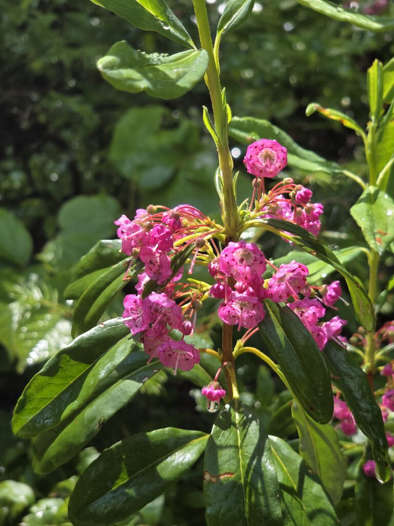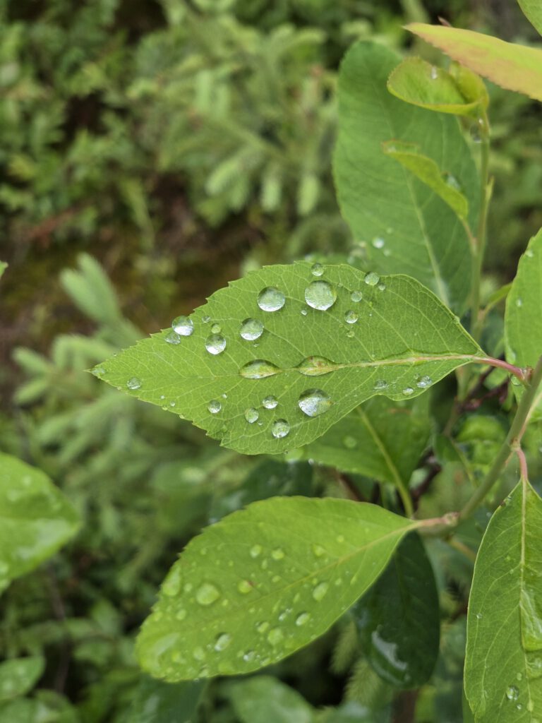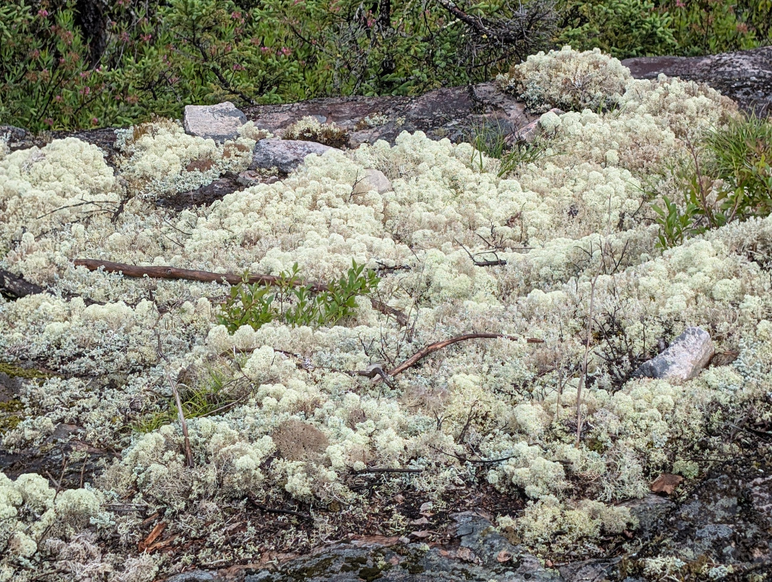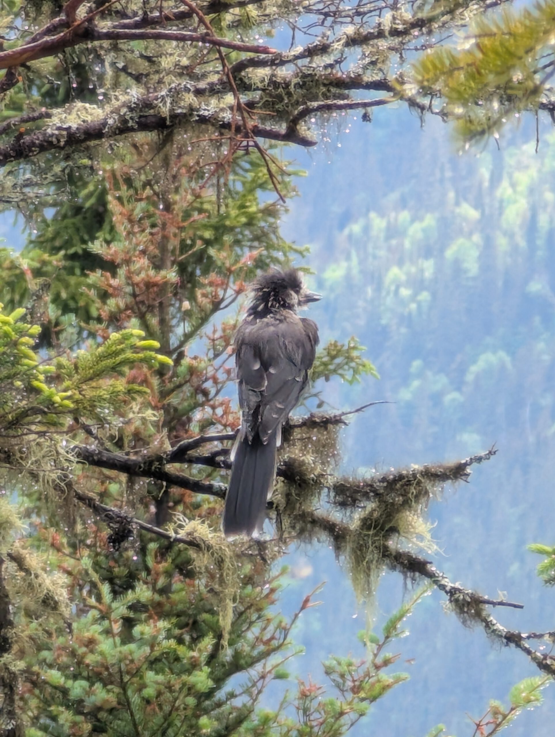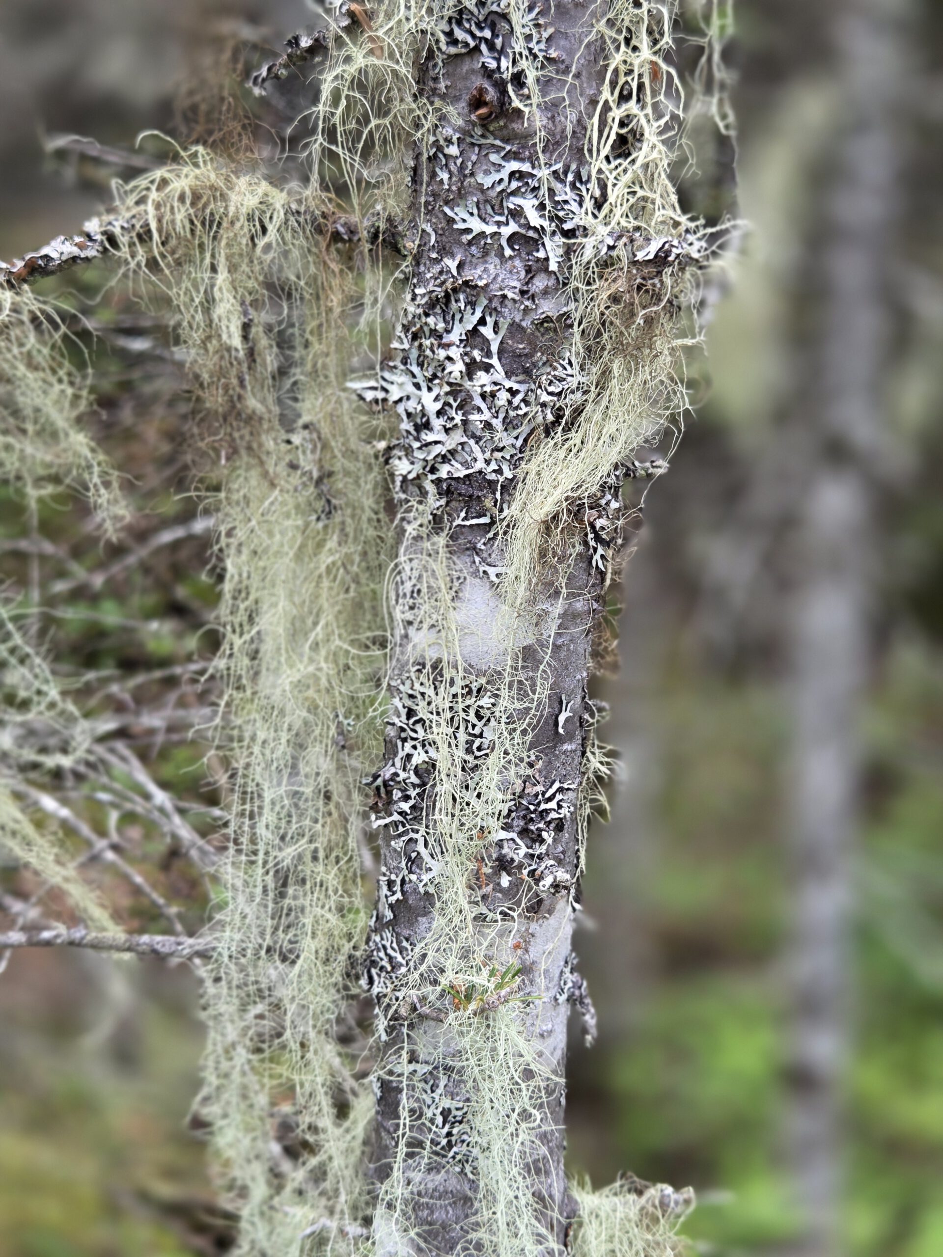 Der Weg selbst führt relativ breit und entspannt durch Mischwald mit vielen Bartflechten, irgendwann geht es bergauf. Und dann fängt es ungefähr bei Kilometer drei an zu regnen. Also nicht zu nieseln, sondern zu schütten. Bei 26 Grad. Der leichte Weg wird zu einer tropischen Wanderung mit vollgesaugten Klamotten. Irgendwann sind zumindest drei von vier klitschnass, bei Kilian hält die Regenjacke am besten. Wir knabbern Müsliriegel, um die Moral einigermaßen oben zu halten. Und irgendwann hört der Regen auf, idealerweise an einem großen Aussichtspunkt.