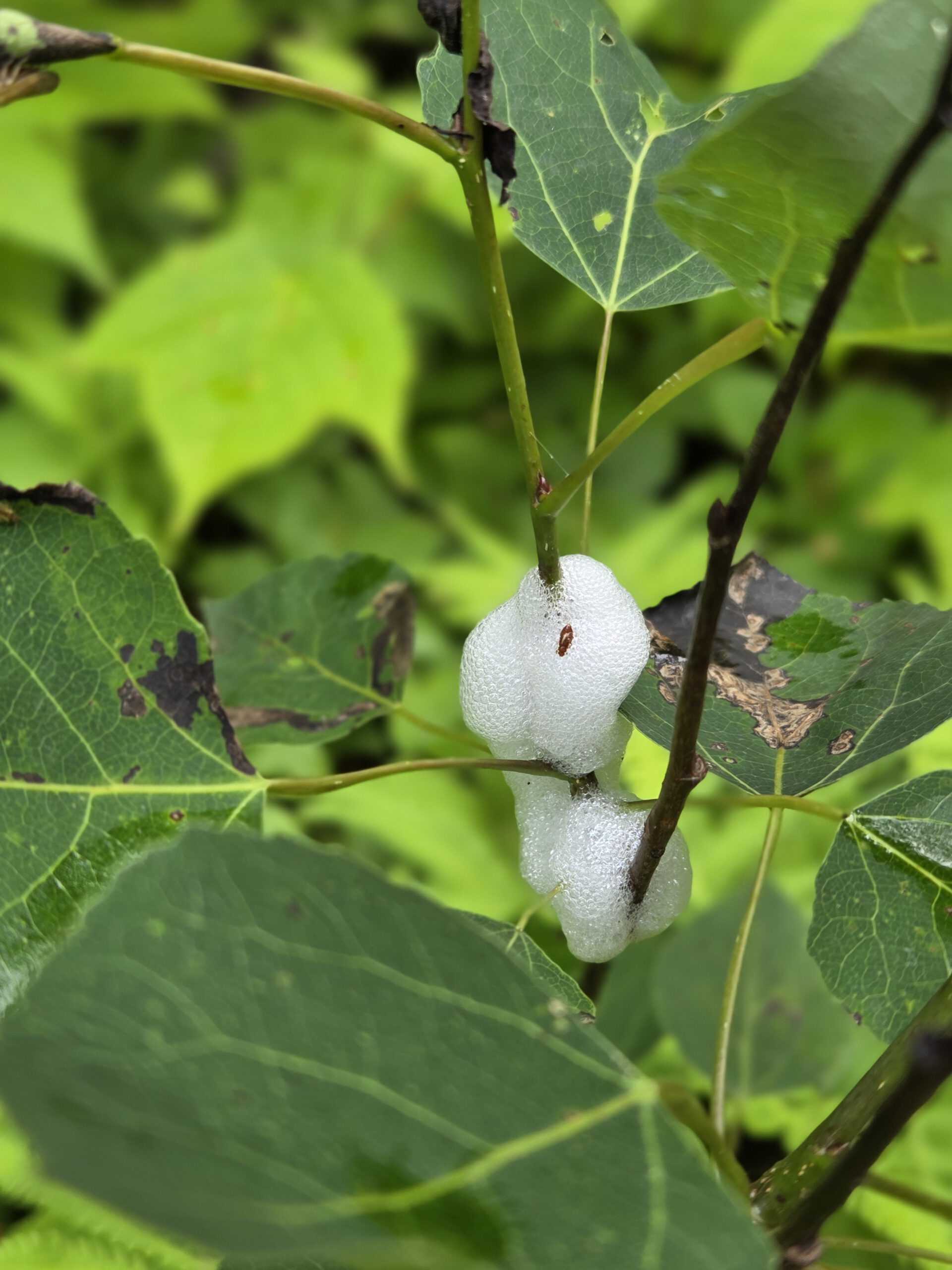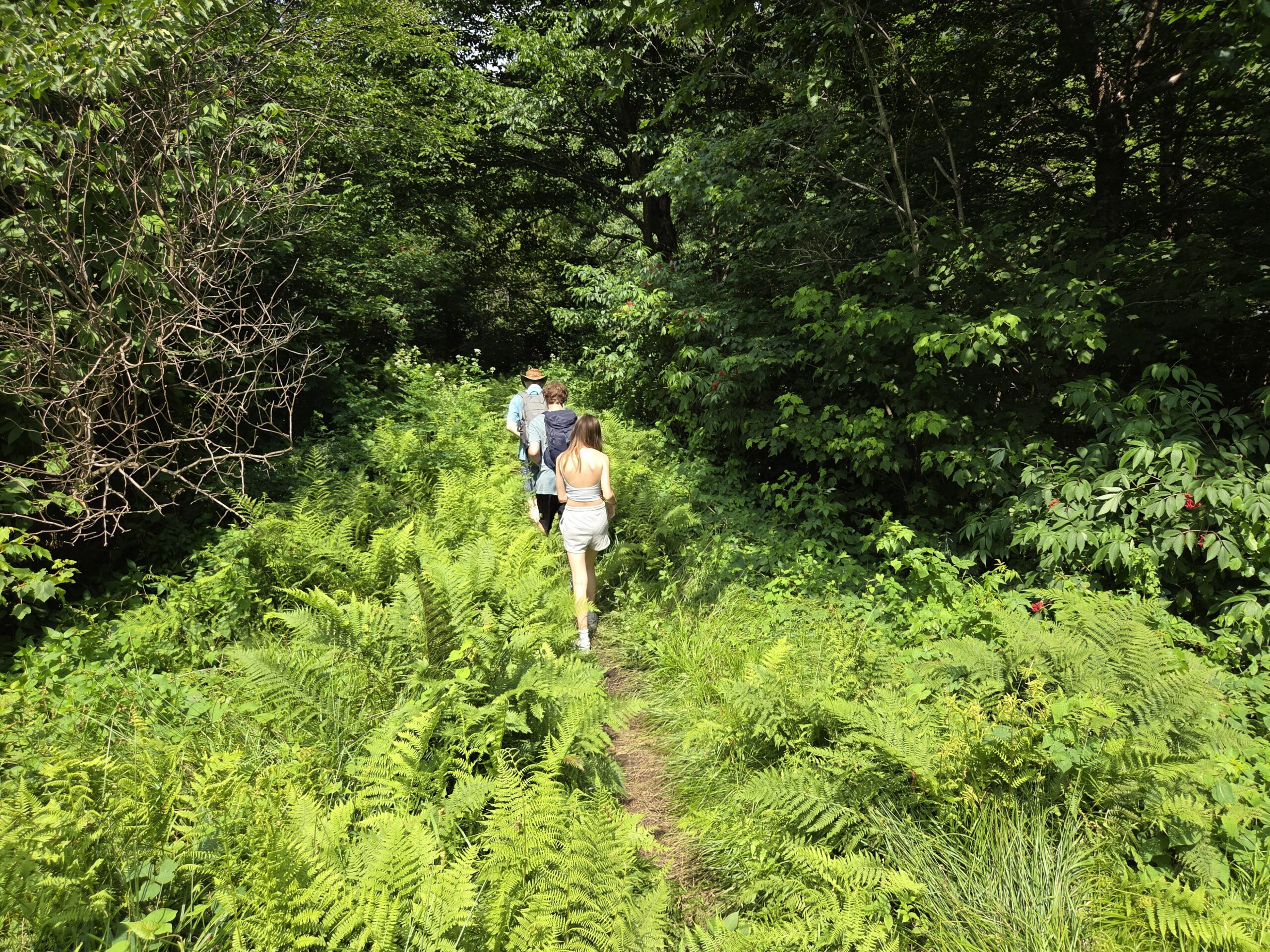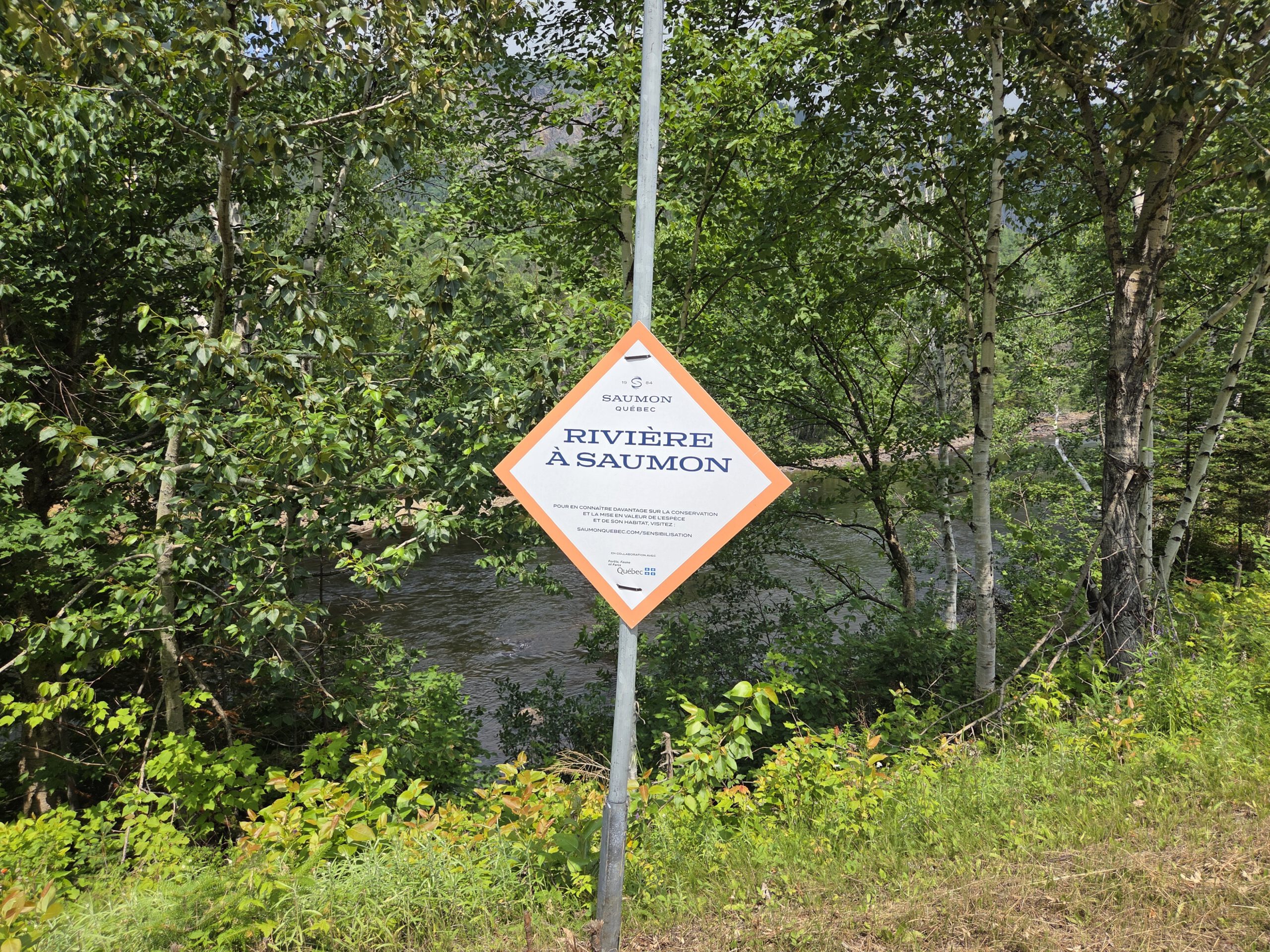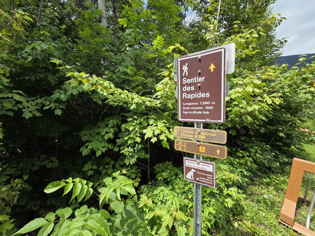 Wir hatten sowieso schon den Weg Les Rapides geplant, 8 Kilometer am Fluss entlang. Und mehr wäre heute auch nicht drin gewesen: 28 bis 30 Grad, hohe Luftfeuchtigkeit. Die Strecke selbst mäandert gemütlich am Wasser entlang, mal schlängelt sie sich durch den Wald, mal geht sie durch hohes Gras. Aber uns läuft der Schweiß. Und wir sehen wieder einen verdächtigen Haufen frischen Kot ...