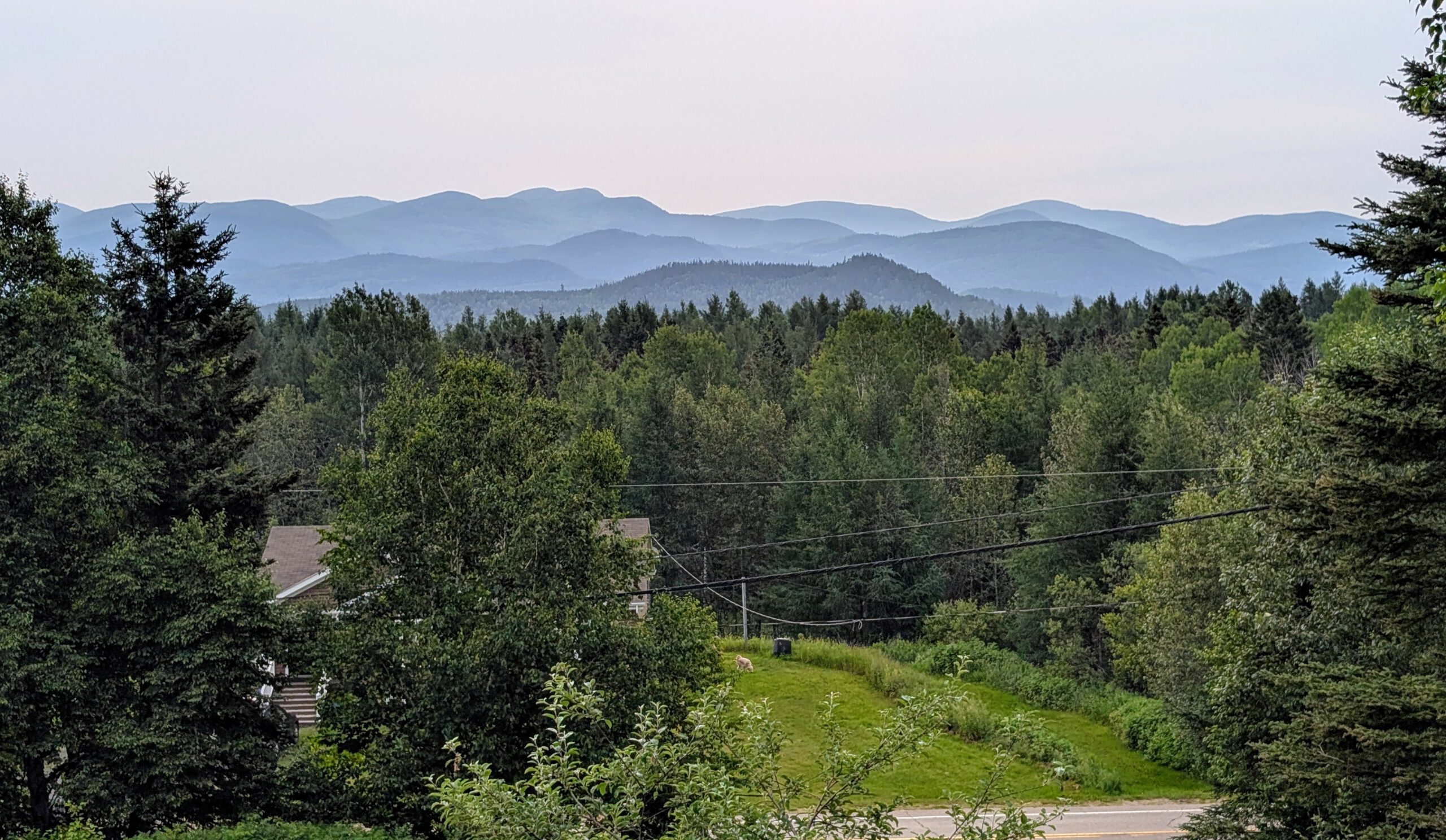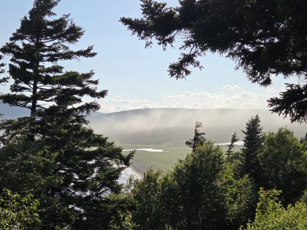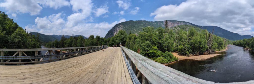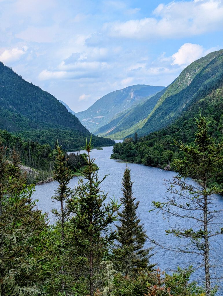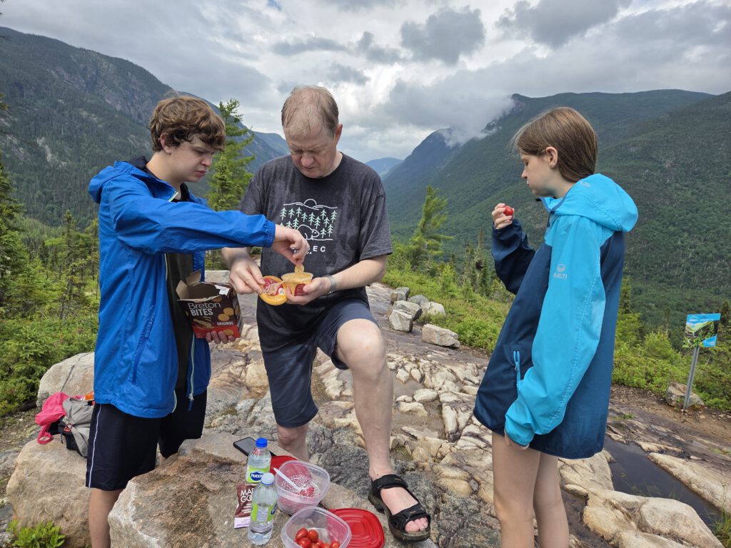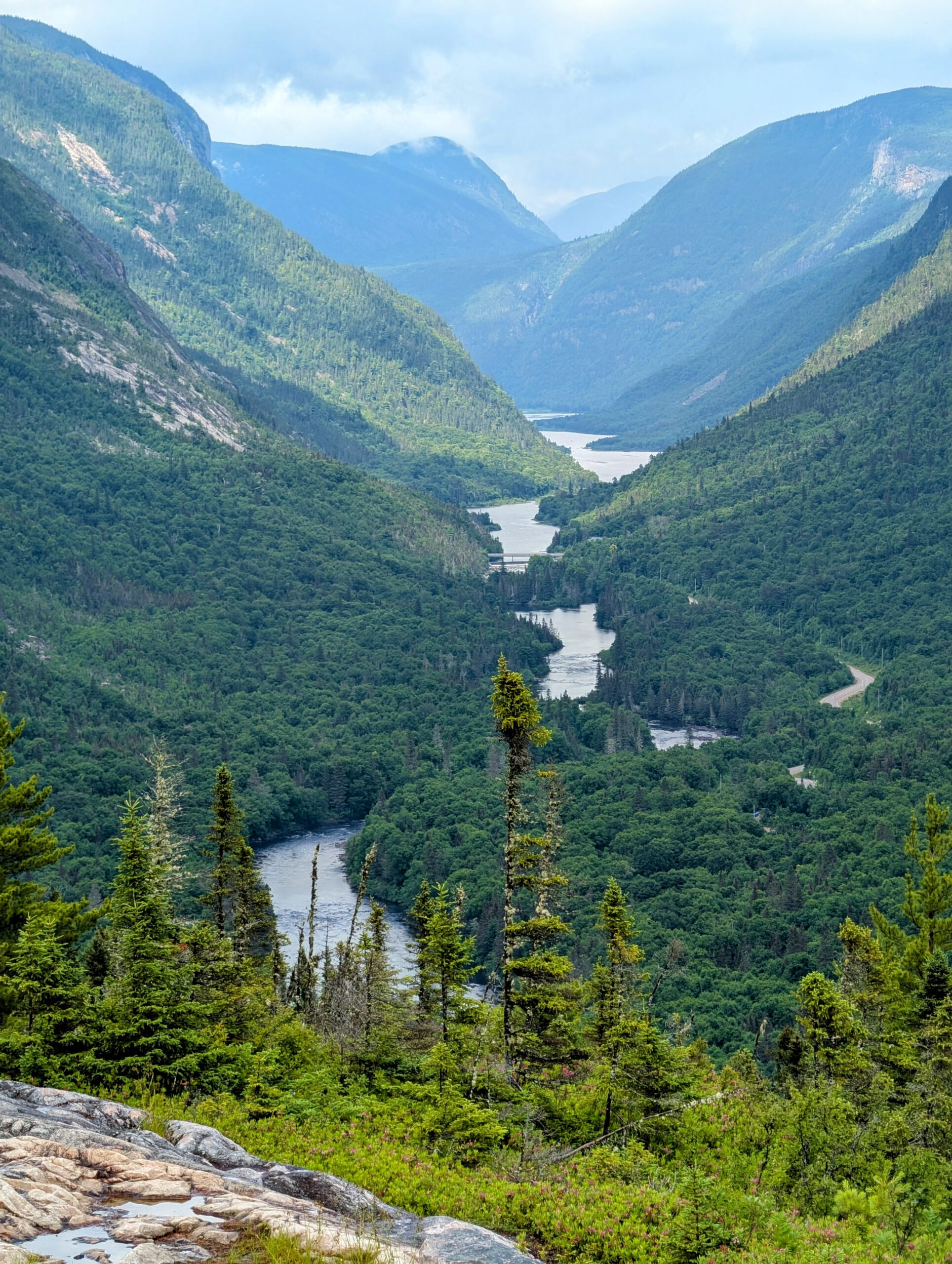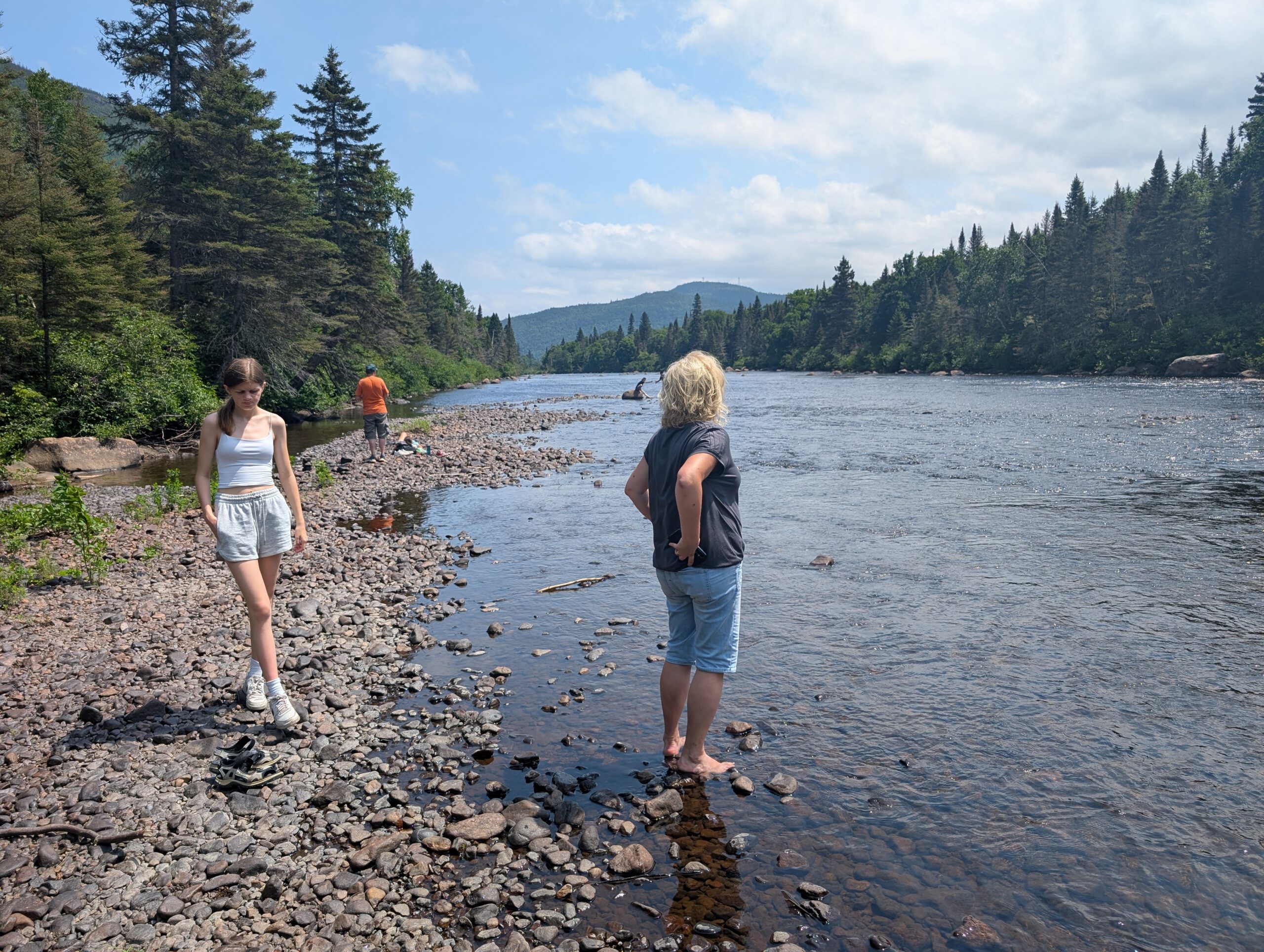 Unterwegs haben wir schon eine Strumpfbandnatter beobachtet, jetzt sind wir unsererseits im Visier eines Vogels (dessen Namen wir noch nicht herausbekommen haben), der wirklich gerne ein paar Cracker abhätte. Wir genießen die Sicht auf den Fluss Malbaie und die Berge. Dann aber schnell weiter, bevor die nächsten Wolken kommen.