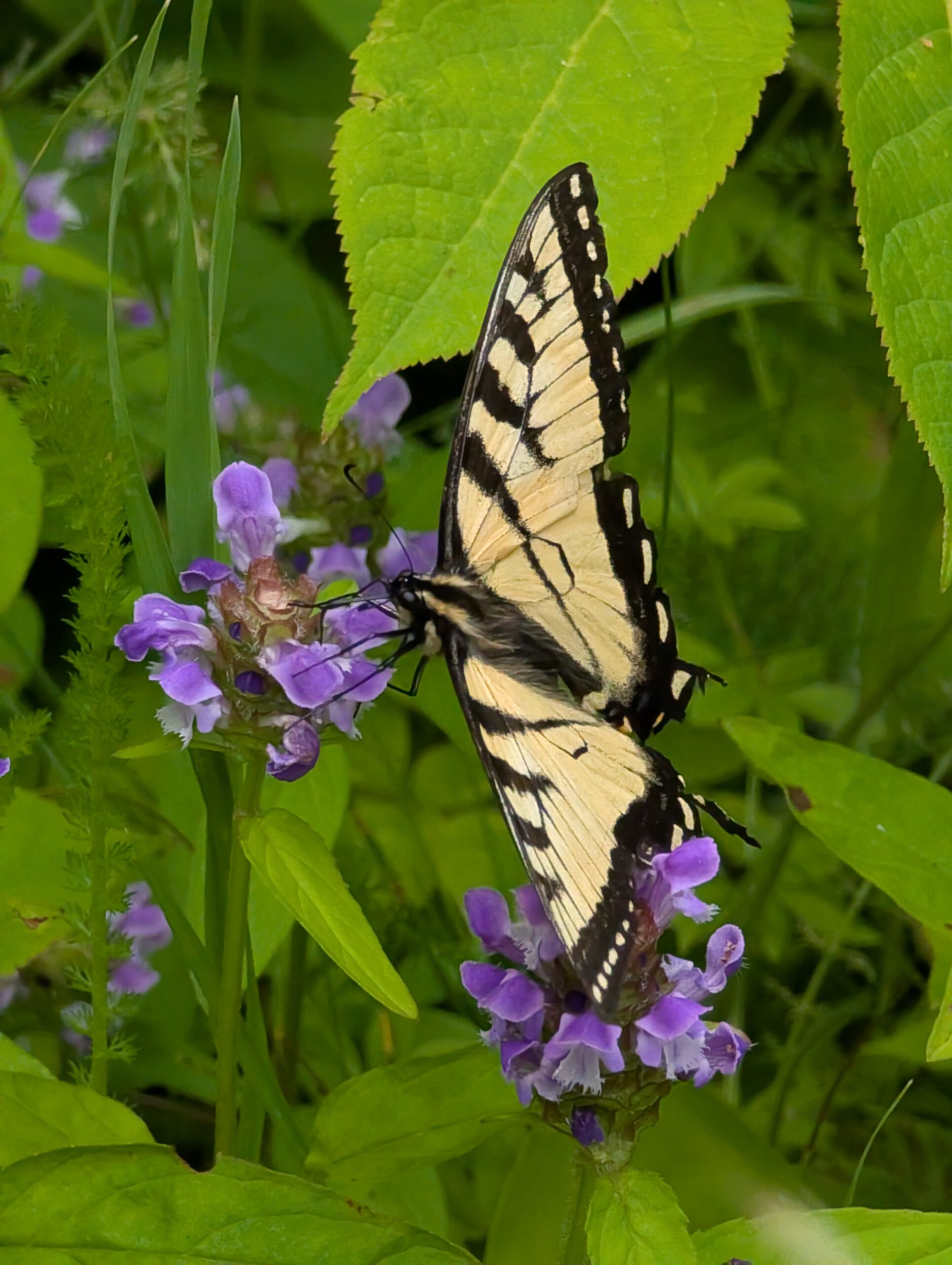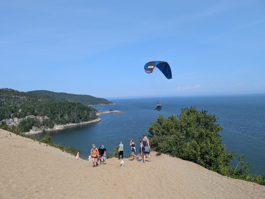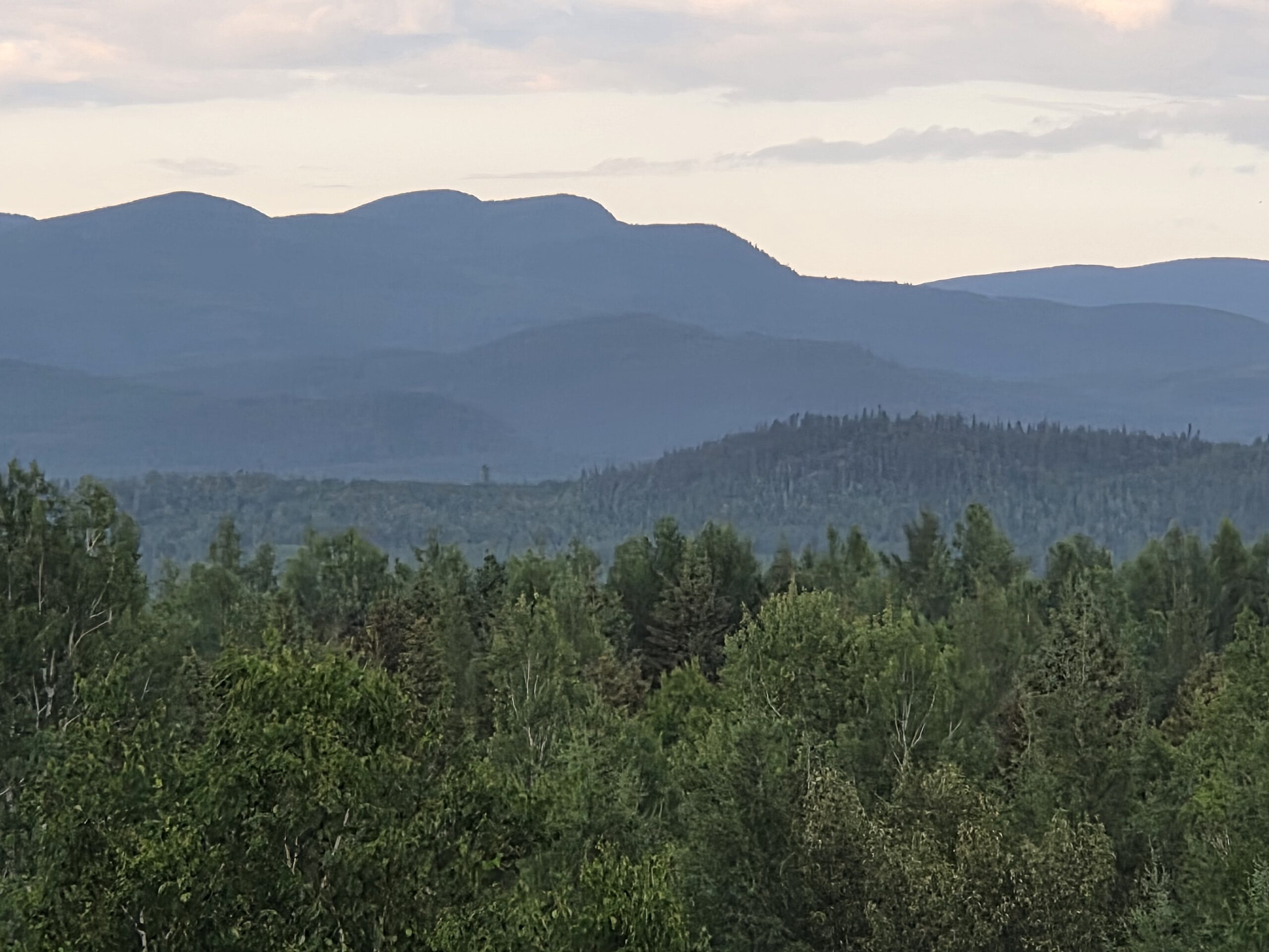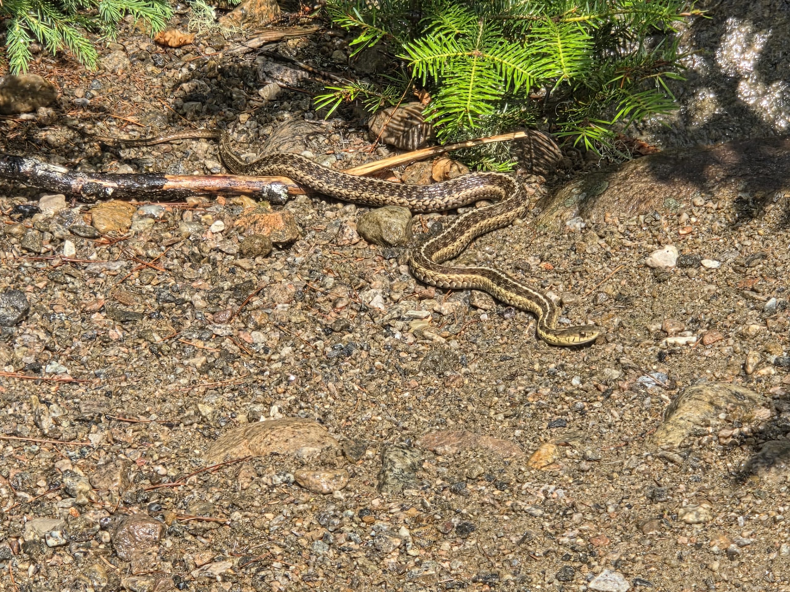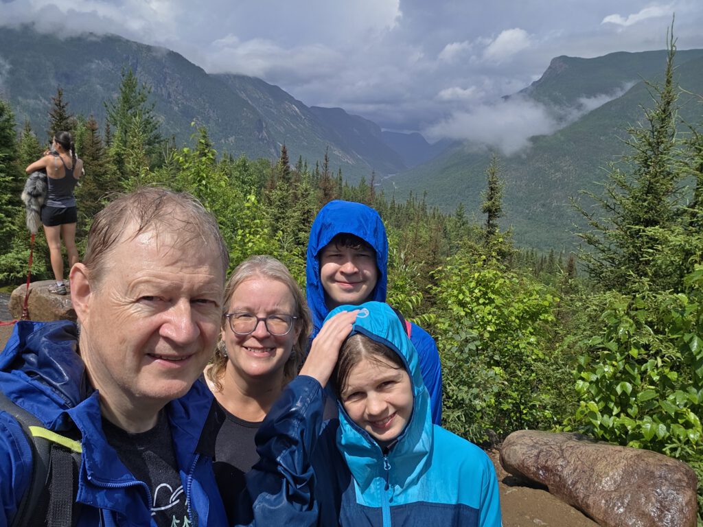 Unterwegs haben wir schon eine Strumpfbandnatter beobachtet, jetzt sind wir unsererseits im Visier eines Vogels (dessen Namen wir noch nicht herausbekommen haben), der wirklich gerne ein paar Cracker abhätte. Wir genießen die Sicht auf den Fluss Malbaie und die Berge. Dann aber schnell weiter, bevor die nächsten Wolken kommen.