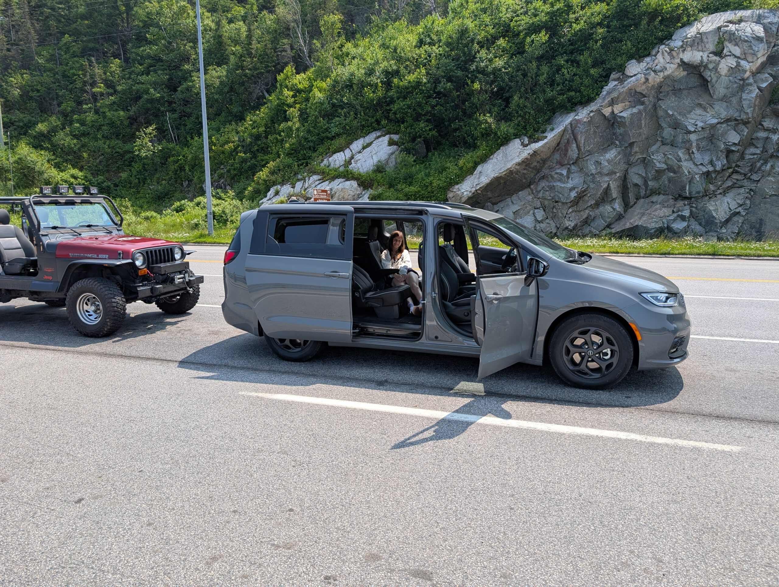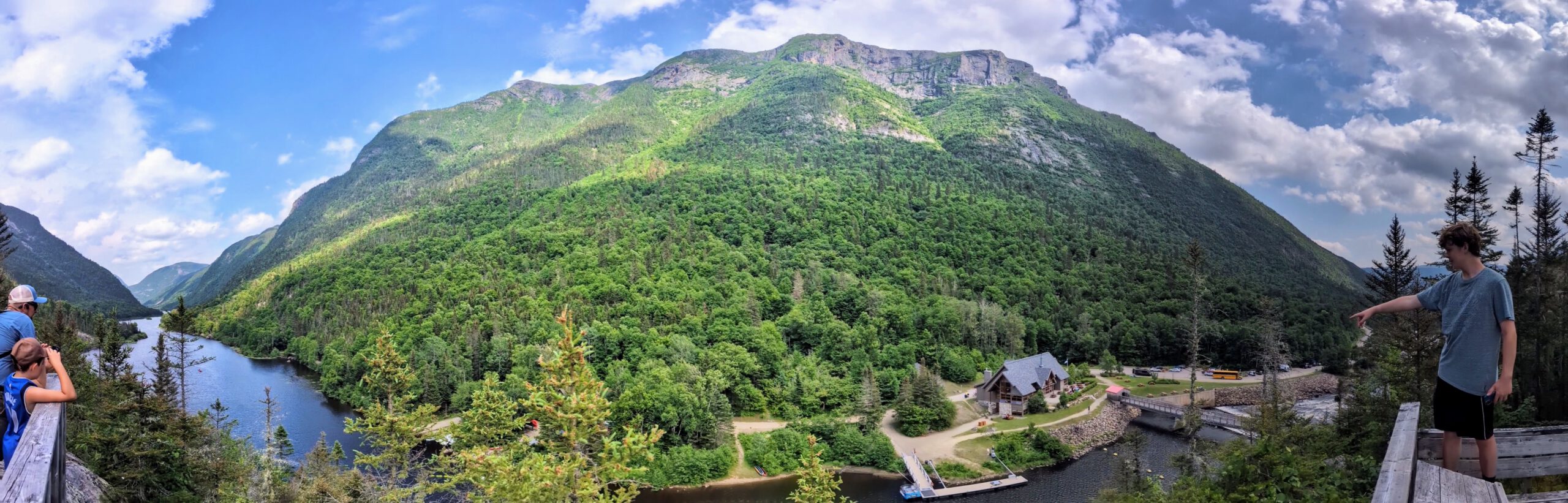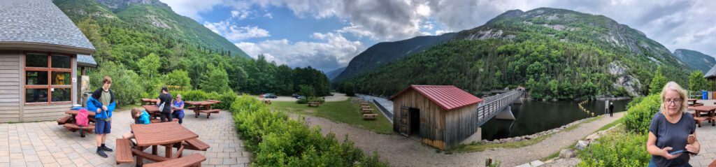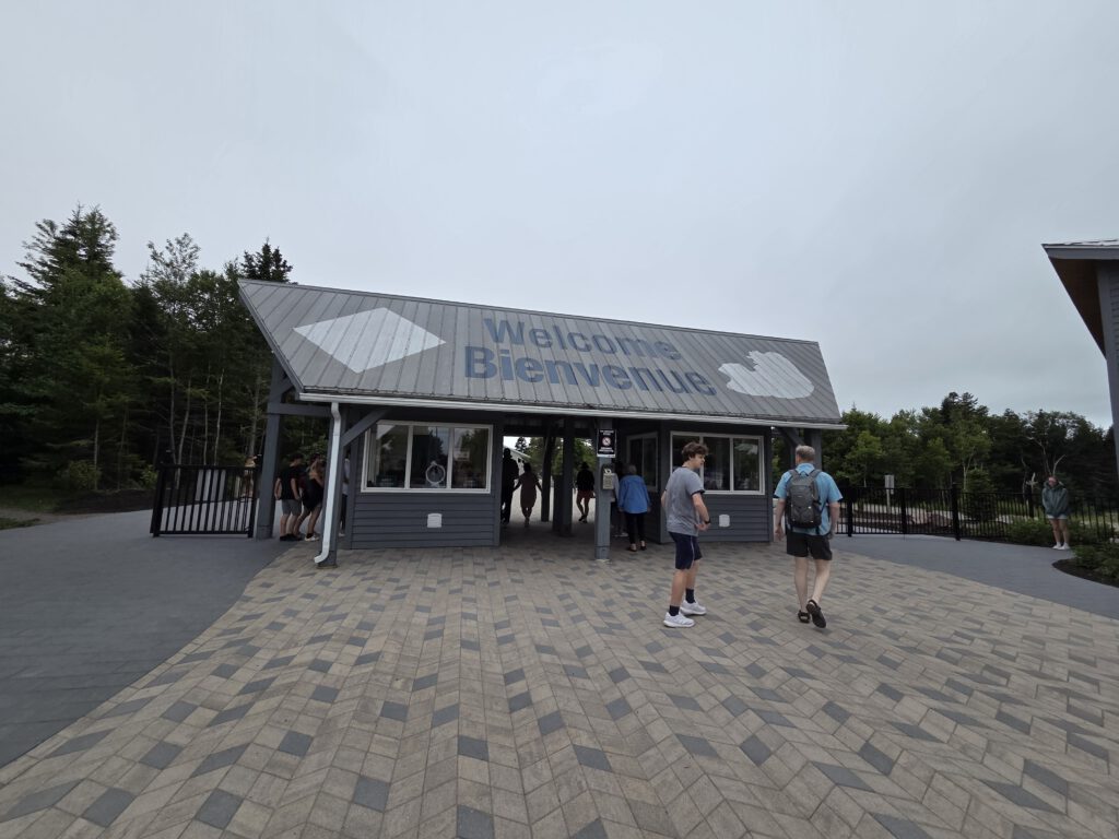 Gut 20 Minuten Fahrt sind es bis zum großen Parkplatz und Infozentrum. Am Straßenrand werden Erdbeeren verkauft. Der Eintritt in den Park ist mit 20 Euro für die beiden Erwachsenen sehr günstig. Während der Sommermonaten ist die Straße gesperrt, alle 10 Minuten fahren amerikanische Schulbusse als Shuttle die Strecke ab und lassen Wanderer wahlweise raus oder lesen Wanderer auf. Schon vorab hatte die Reiseleitung den Weg Le Riverain, knapp 11 Kilometer, ausgeguckt und das ist es auch, was die Frankokanadierin im Infozentrum empfiehlt. Und was meint sie mit Blick auf das Wetter? Ach, kein Problem, geht schon.