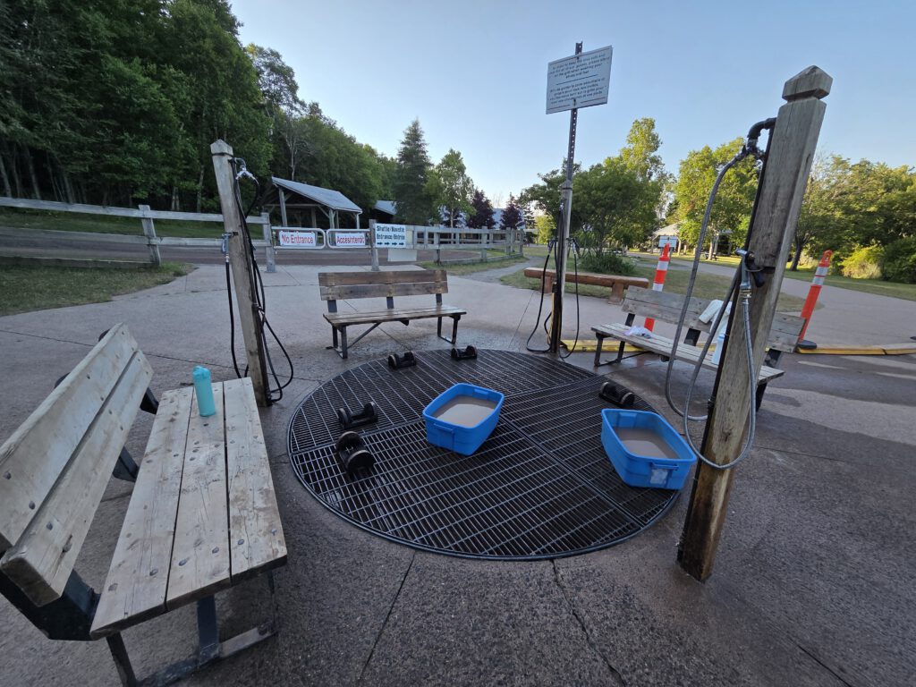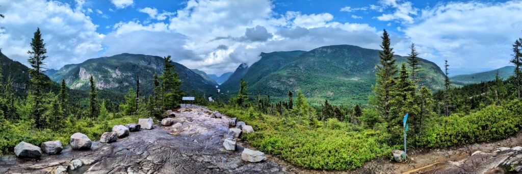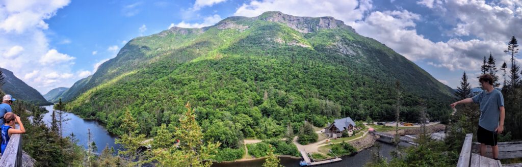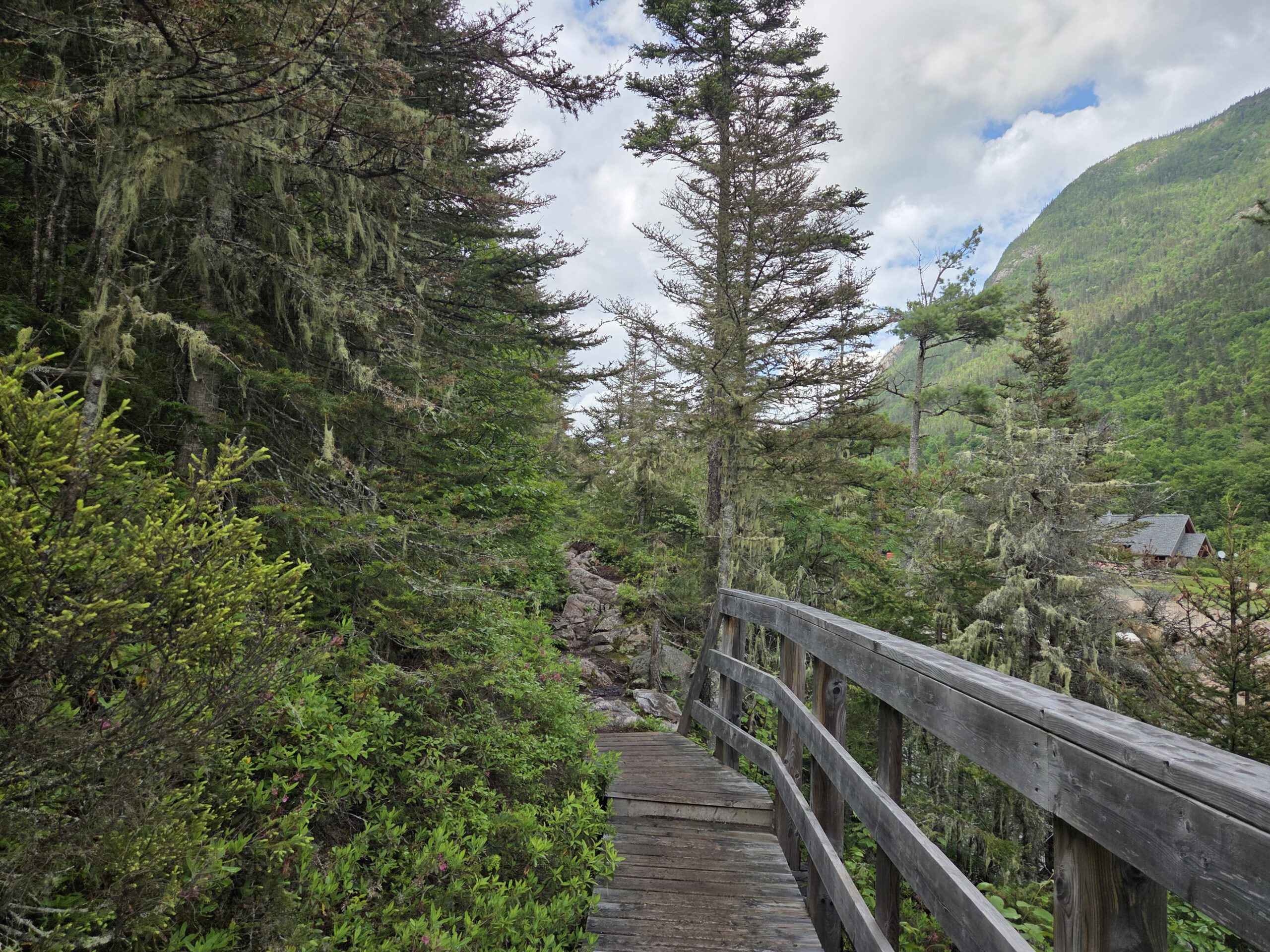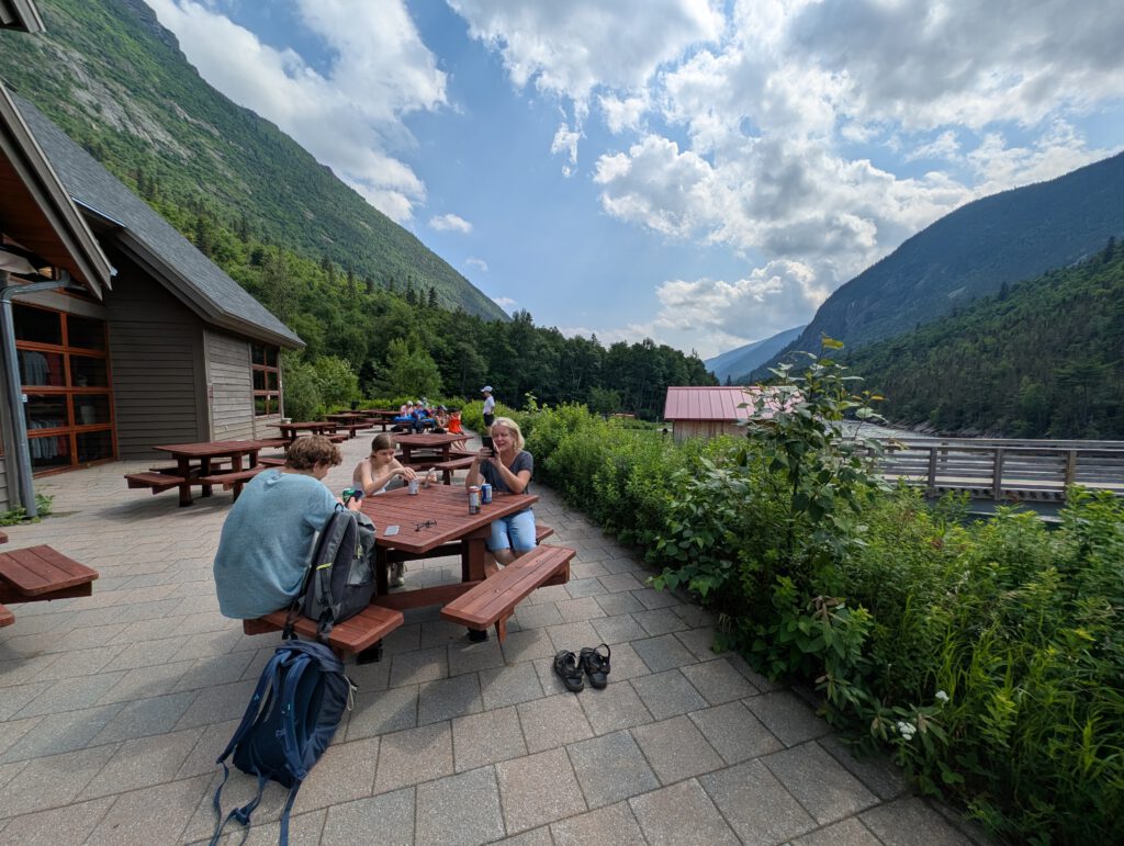 Gut 20 Minuten Fahrt sind es bis zum großen Parkplatz und Infozentrum. Am Straßenrand werden Erdbeeren verkauft. Der Eintritt in den Park ist mit 20 Euro für die beiden Erwachsenen sehr günstig. Während der Sommermonaten ist die Straße gesperrt, alle 10 Minuten fahren amerikanische Schulbusse als Shuttle die Strecke ab und lassen Wanderer wahlweise raus oder lesen Wanderer auf. Schon vorab hatte die Reiseleitung den Weg Le Riverain, knapp 11 Kilometer, ausgeguckt und das ist es auch, was die Frankokanadierin im Infozentrum empfiehlt. Und was meint sie mit Blick auf das Wetter? Ach, kein Problem, geht schon.