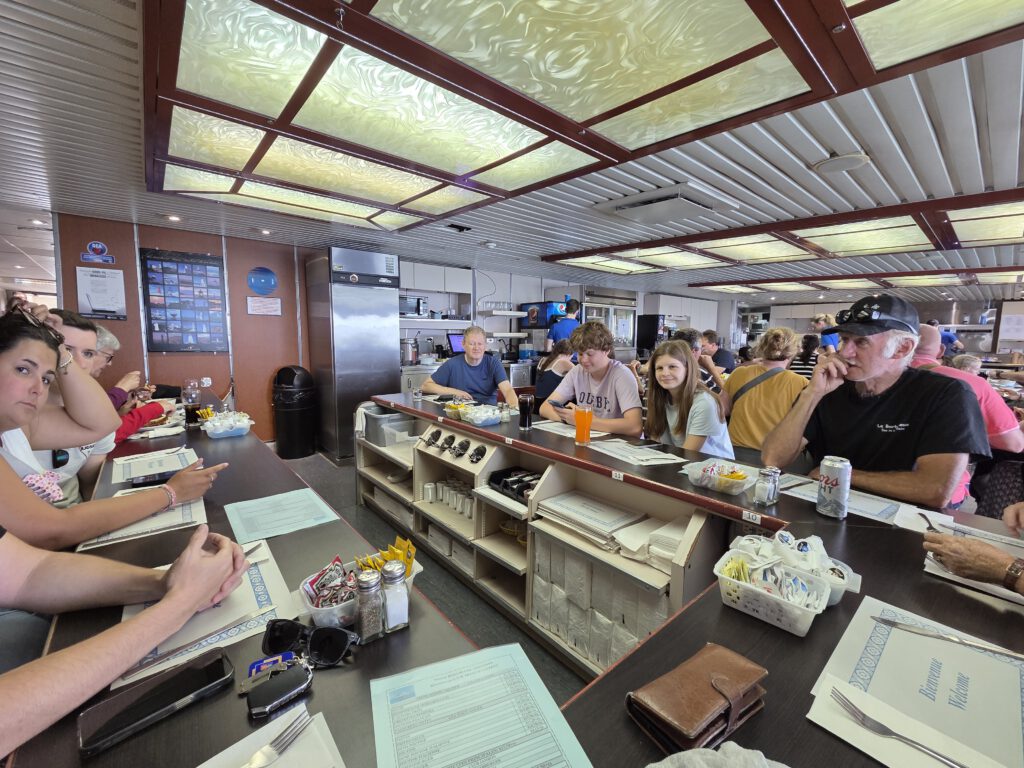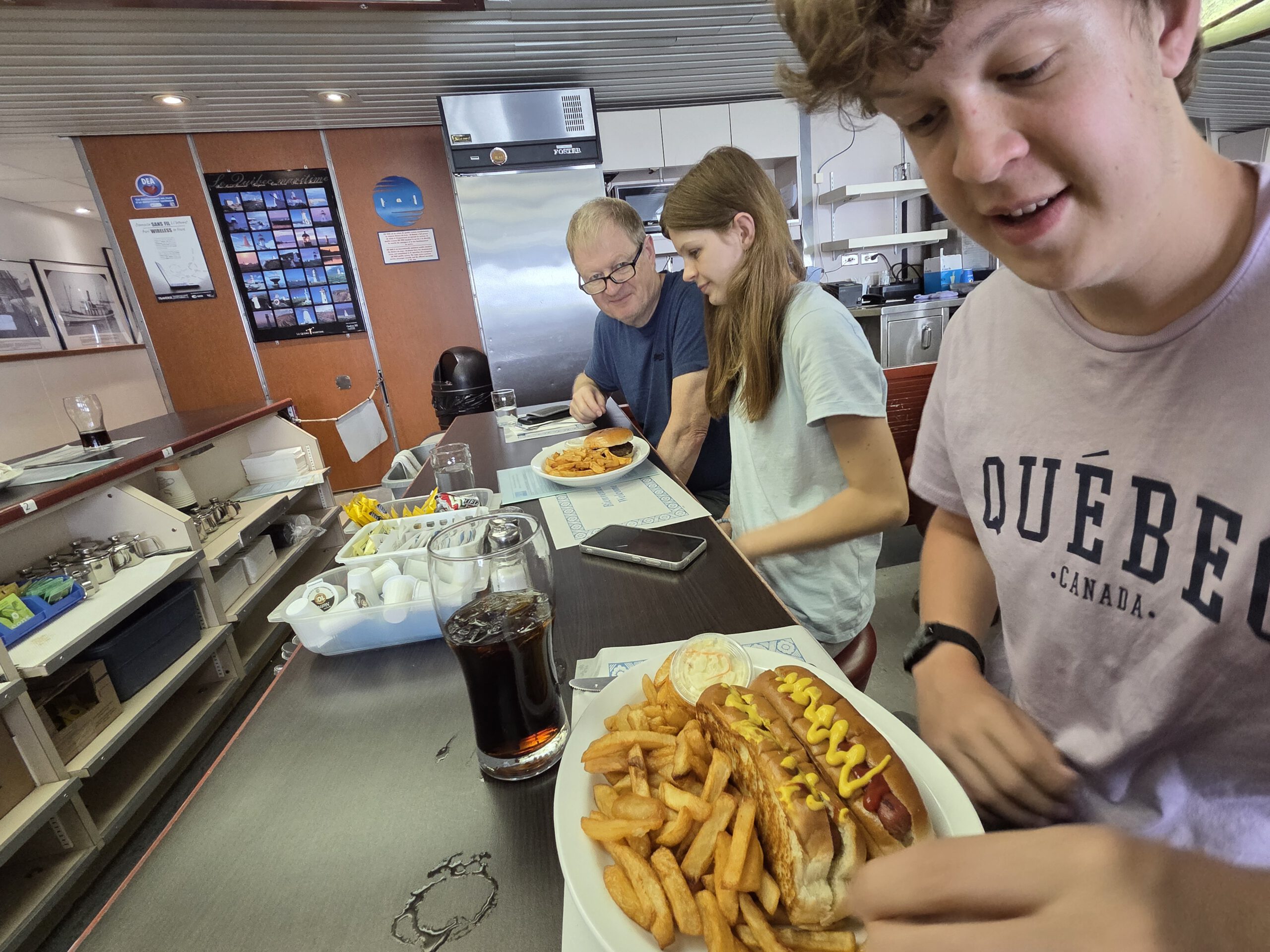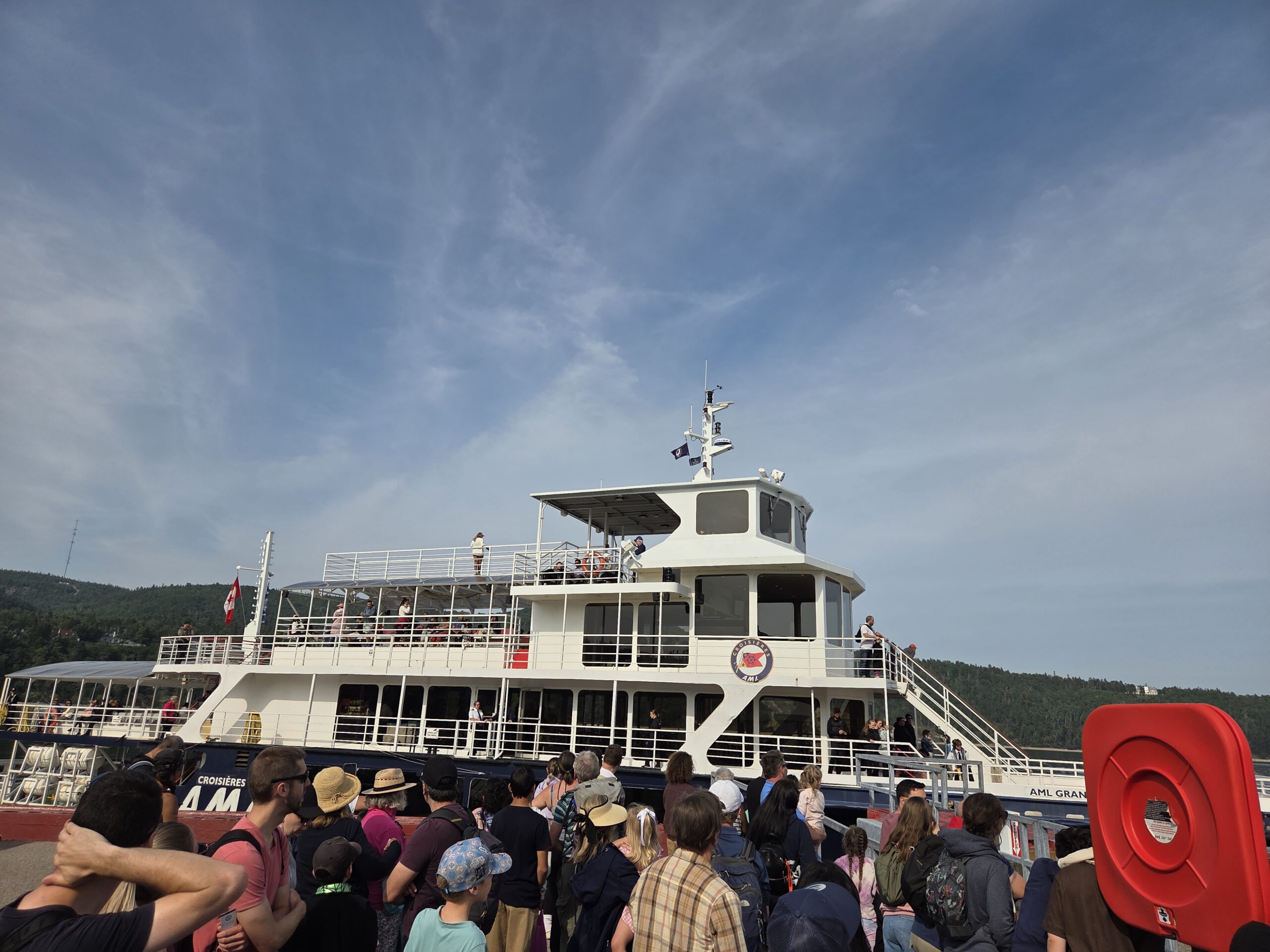 Kurz vor 14 Uhr sind wir endlich auf dem Schiff und sind von der Bordküche optisch begeistert: Der Tisch schlängelt sich durch den Raum, die Angestellten kommen quasi in die Buchten. Sehr nordamerikanisch, sehr cool. Die Fahrt selbst ist unspektakulär, das Wasser ist ruhig. Nur Wale oder Delfine wollen sich keine blicken lassen, nicht mal eine Robbe, so sehnsüchtig wir auch auf den St. Lorenz starren.