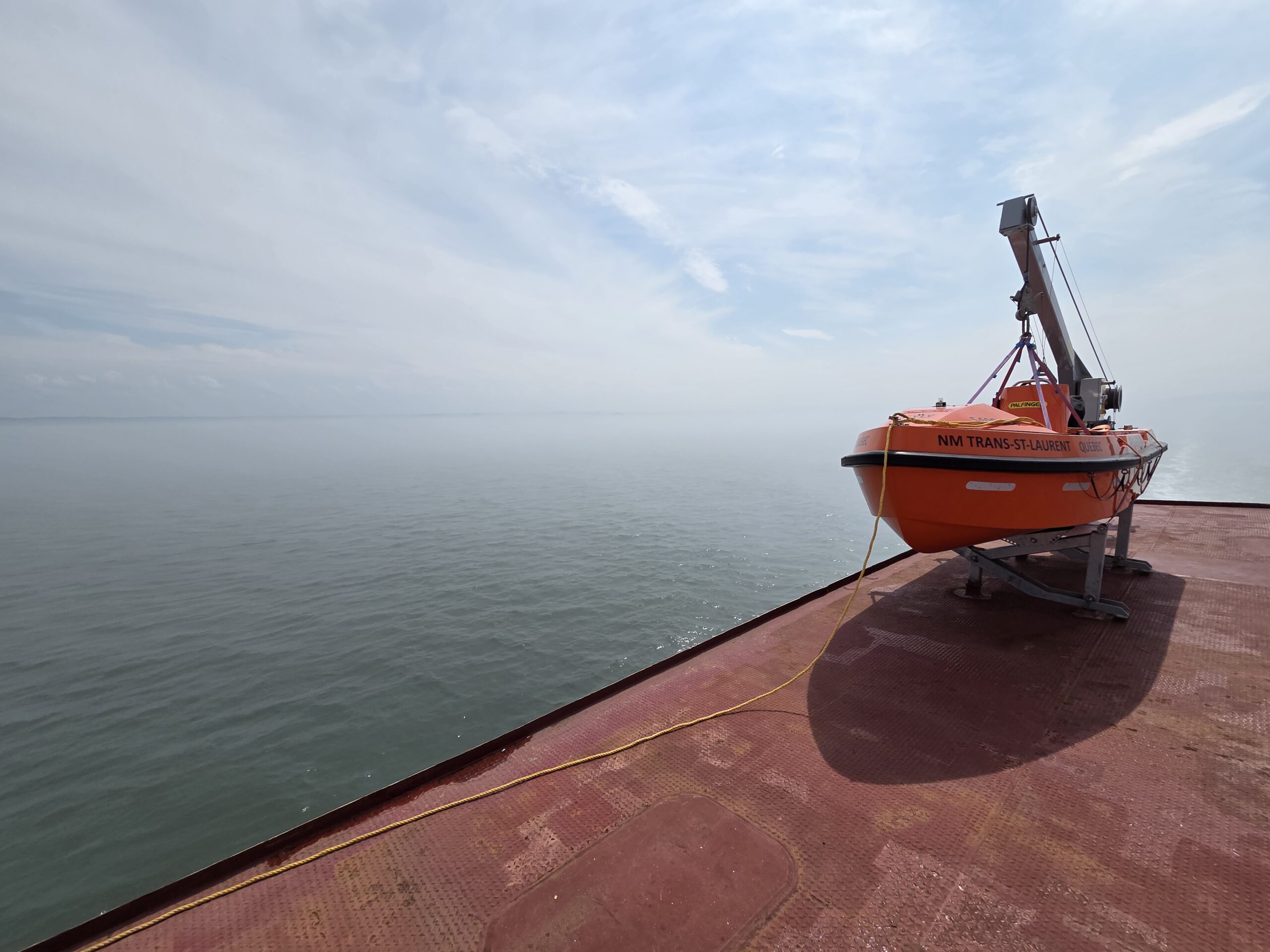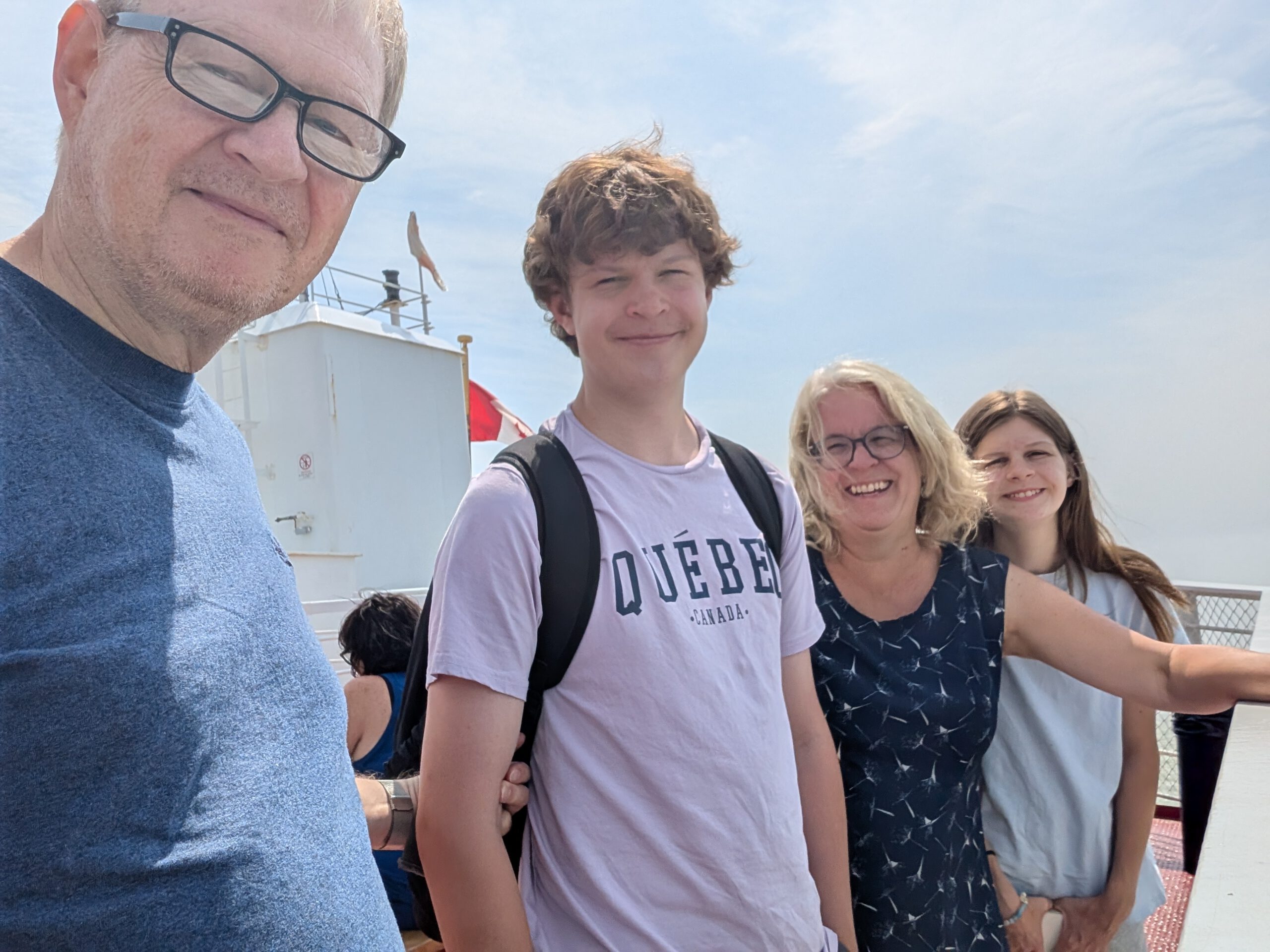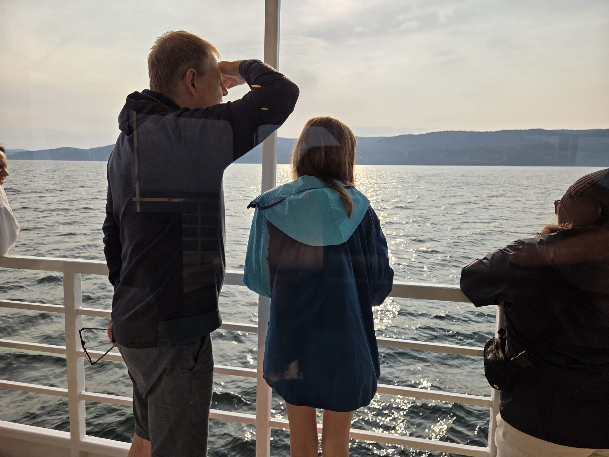 Kurz vor 14 Uhr sind wir endlich auf dem Schiff und sind von der Bordküche optisch begeistert: Der Tisch schlängelt sich durch den Raum, die Angestellten kommen quasi in die Buchten. Sehr nordamerikanisch, sehr cool. Die Fahrt selbst ist unspektakulär, das Wasser ist ruhig. Nur Wale oder Delfine wollen sich keine blicken lassen, nicht mal eine Robbe, so sehnsüchtig wir auch auf den St. Lorenz starren.