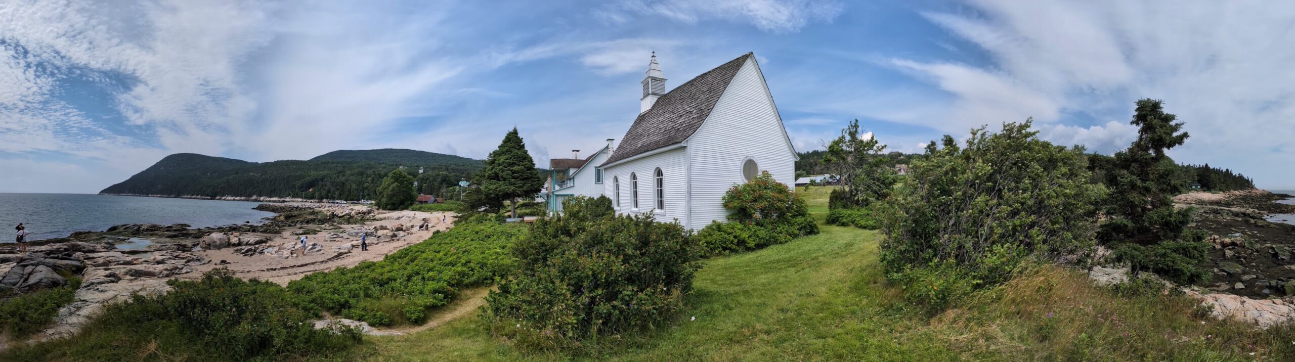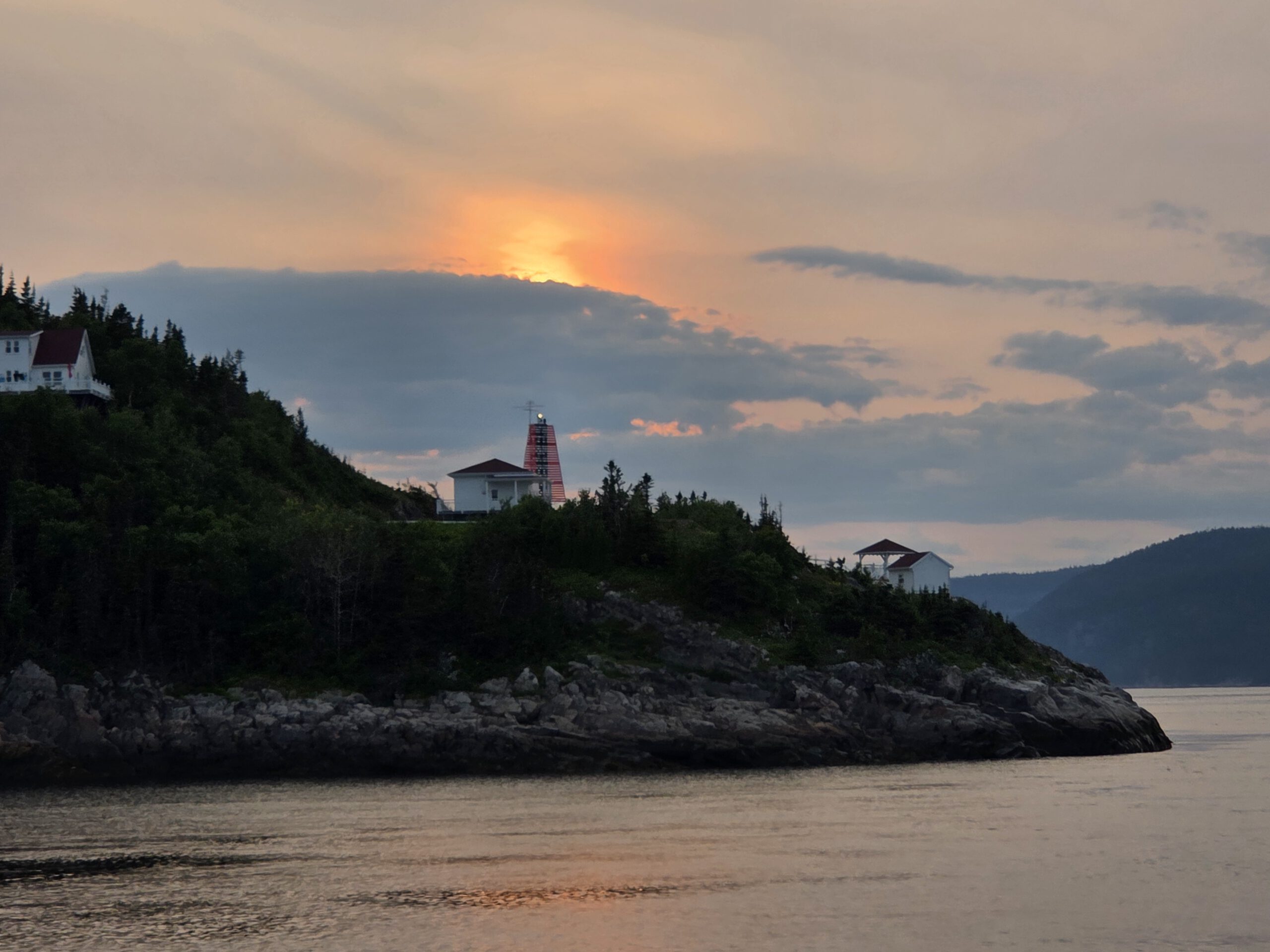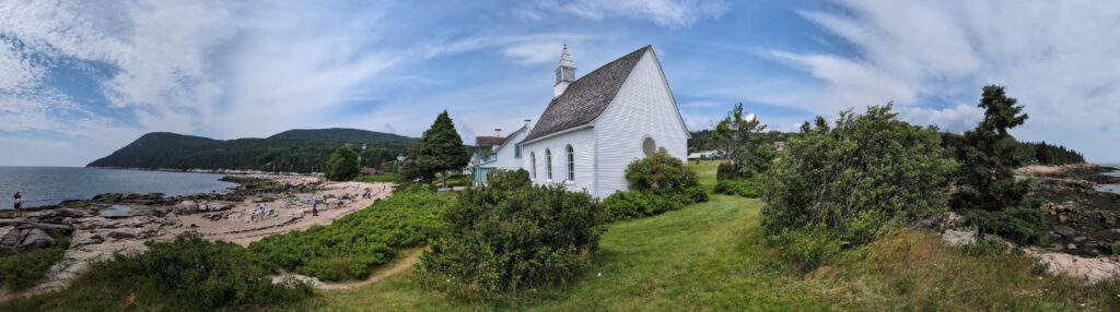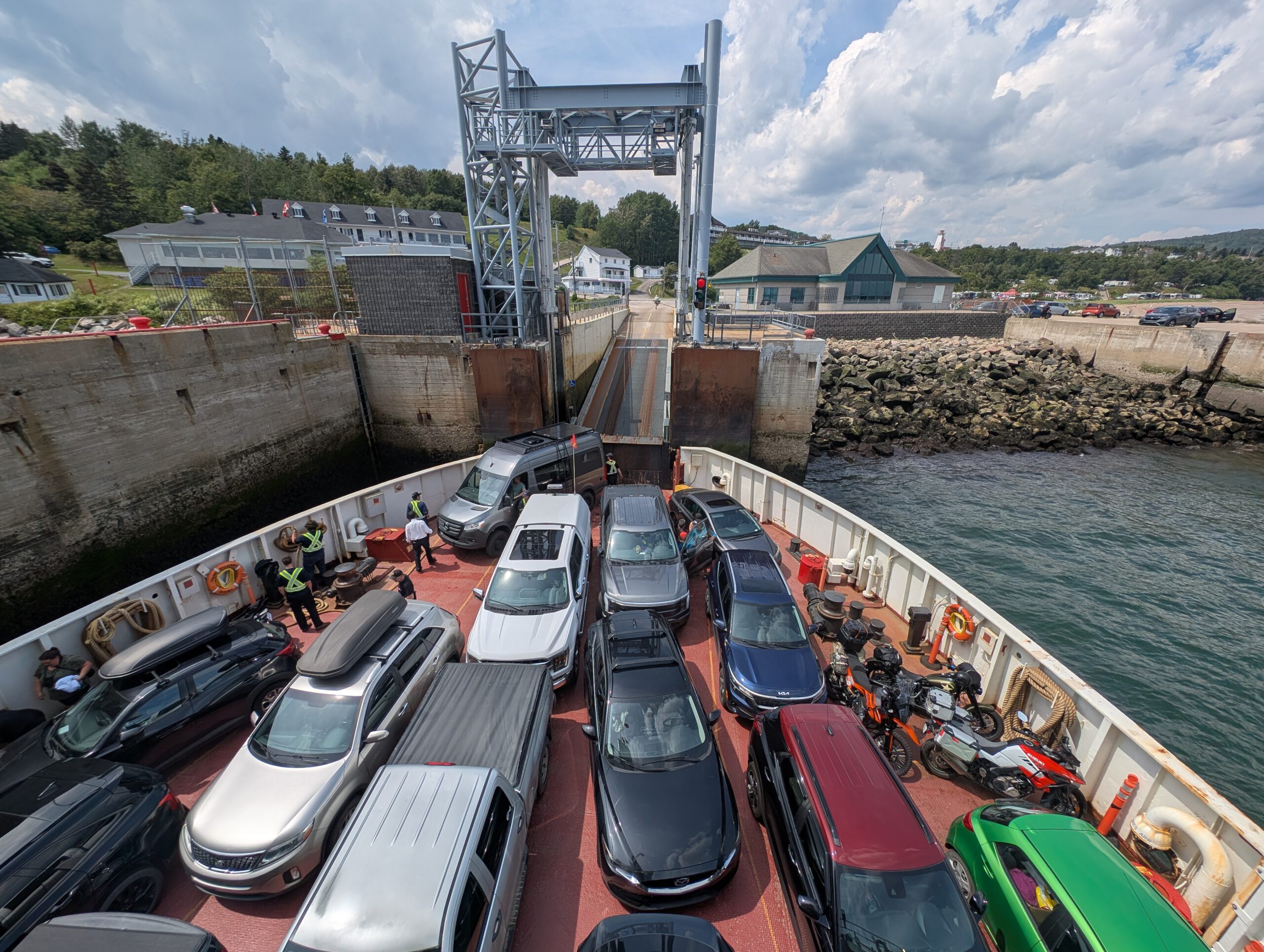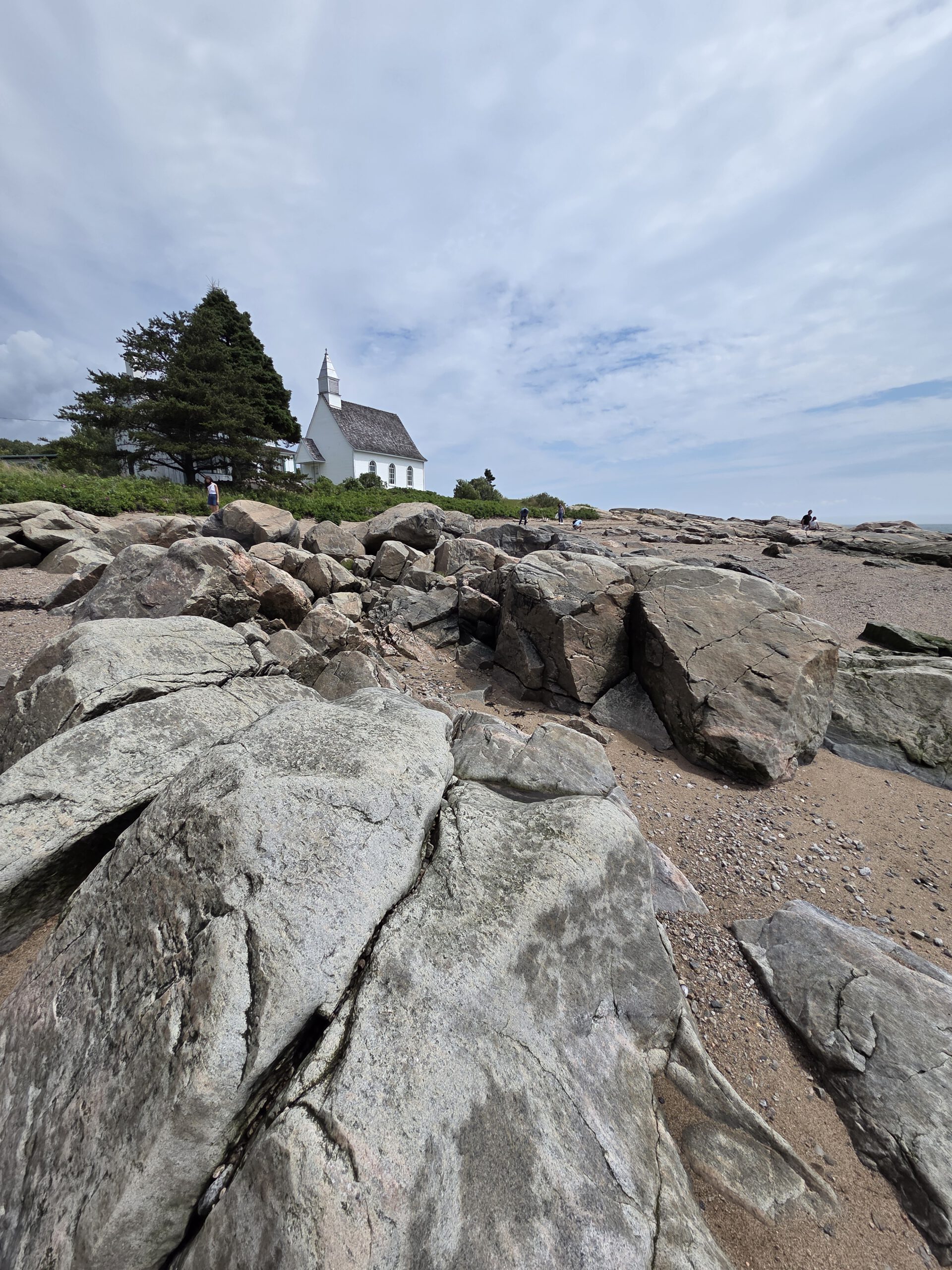 Reisetag, knapp 500 Kilometer liegen vor uns. Dazu müssen wir den Strom kreuzen und den Bundesstaat wechseln. Wir sind um 10.30 Uhr aus dem Ferienhaus und unterwegs zur Fähre. Da noch etwas Zeit bleibt, gibt es einen kleinen Stop am Meer, bei Port-au-Persil. Dort lassen wir uns am Meer, äh Fluss, den Wind um die Nase wehen und verbringen etwas Zeit am kleinen Felsstrand samt Kapelle. Über dem Wasser liegt eine dicke Wolkendecke und wir sind froh, nicht auf dem Walboot zu sein. Dann geht es zur Fähre in Saint-Simeon.