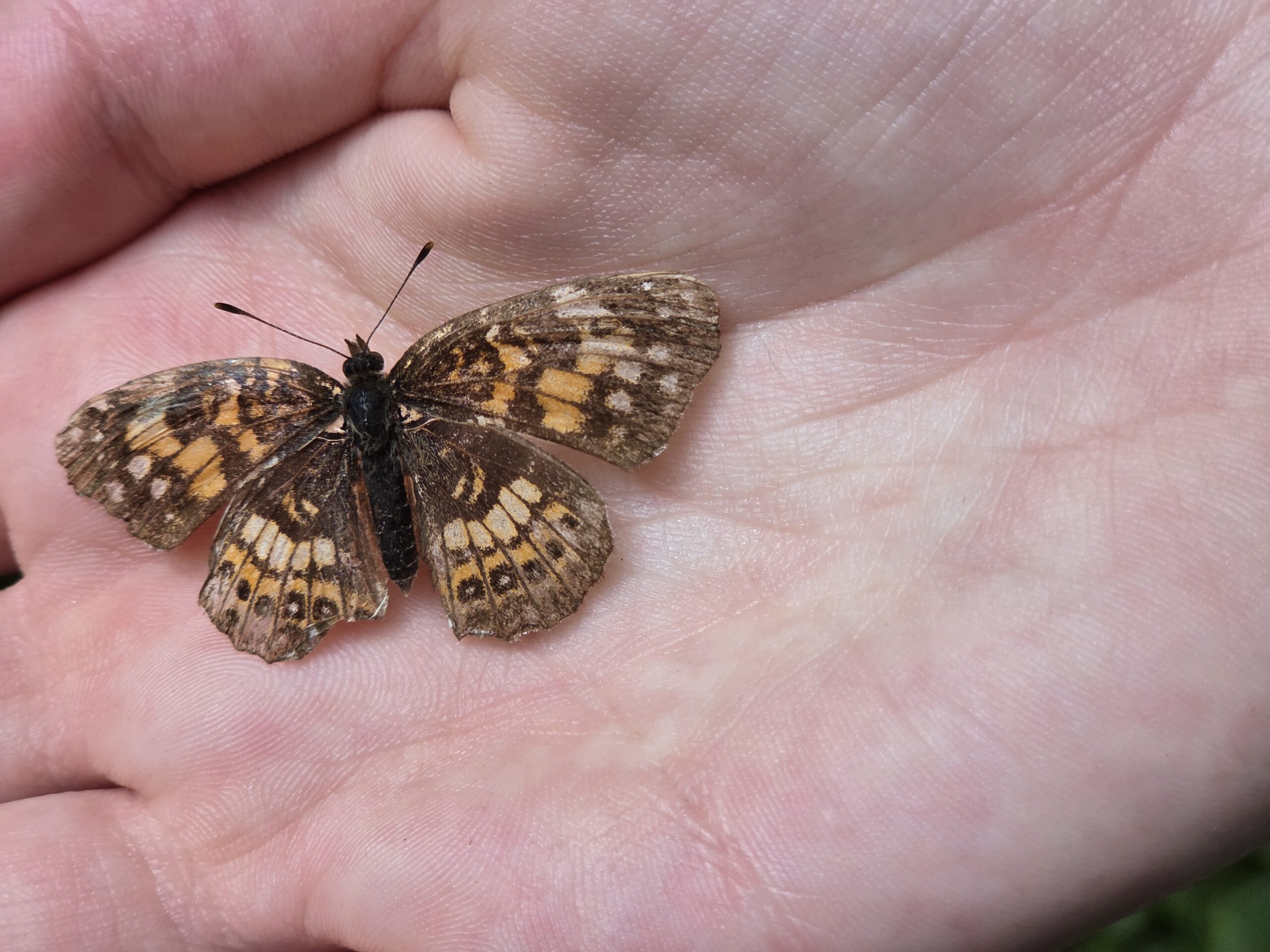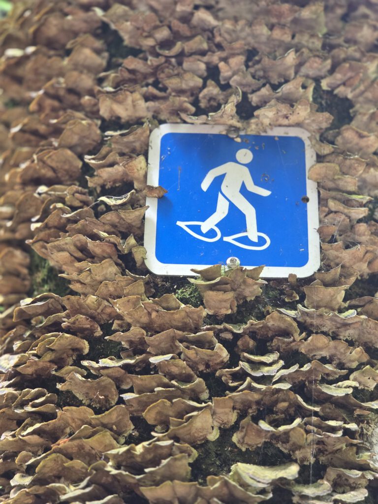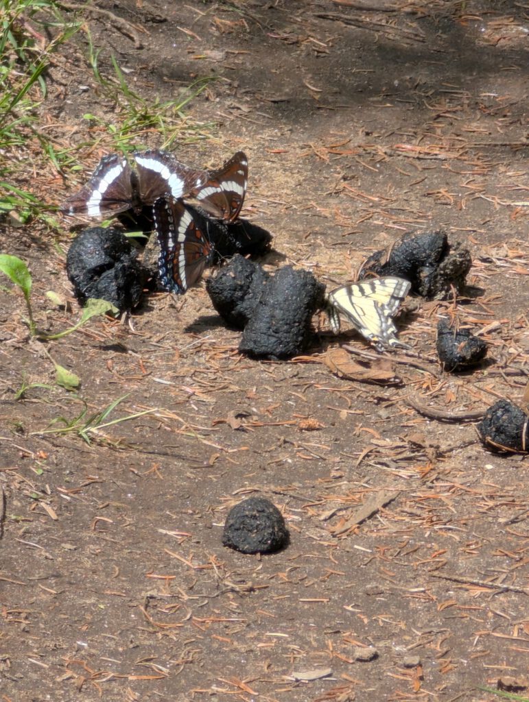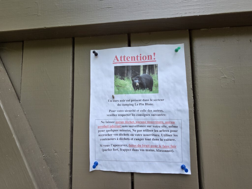 Unterwegs kreuzen wir einen großzügigen Zeltplatz. Jeder Stellplatz mit Feuerstelle und Holzbank, die Fortgeschrittenen haben spezielle Zelte mit Mückenschutz über die Bänke geworfen. Und dann sehen wir an einer Feuerholzsammelstelle ein kleines Schild: Achtung, in diesem Gebiet ist gerade ein Schwarzbär unterwegs, Nahrungsmittel bitte im Auto einschließen. Später am Toilettenhäuschen hängt noch so ein Schild plus ein weiteres mit Verhaltenstipps - aber viel mehr ist nicht. Kein Absperrband, keine großen Warnhinweise. Irgendwie scheint hier niemand davon wirklich beeindruckt. Gerald und Kilian sehen die Lage auch eher cool, selbst als der zweite verdächtige Kothaufen mitten auf dem Weg auftaucht. Louisa und Nicole unterhalten sich wieder etwas lauter ...