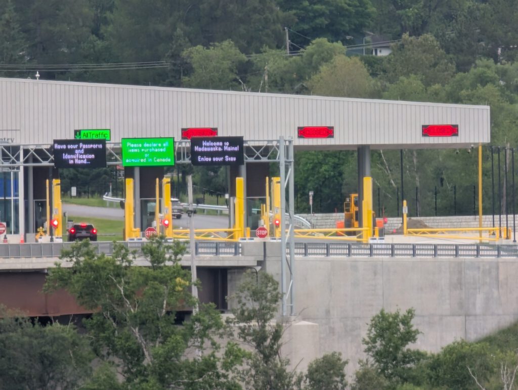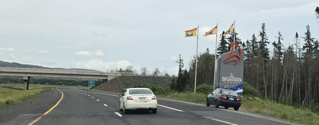 Mit einer Stunde Verspätung kommen wir am anderen Ufer an. Eigentlich wollten wir noch etwas am Fluss entlang fahren, doch das Auto-Navi leitet uns auf die Route, die wir meiden wollten - weil langweilig lange durch den Wald. Aber es ist besser so, denn diese Strecke ist kürzer. Und wir sind nicht nur später dran, als geplant: An der Grenze zum Bundesstaat New Brunswick wechselt die Zeitzone und uns wird noch eine Stunde geklaut.