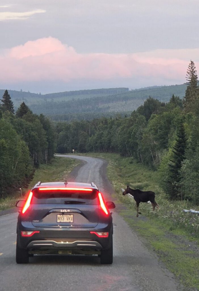 Dann geht es 145 Kilometer durch ein Waldgebiet. Keine Parkbuchten, keine Nothaltesäulen, gelegentlich kann man vereinzelt Häuser im Wald erahnen. Und dann kreuzt erst der erste große Elch majestätisch die Straße, etwas 200 Meter vor uns. Später steht ein junger Elch neben dem Straßenrand, bevor er auf die andere Seite eilt. Dann kommt ein paar Kilometer weiter noch ein Reh, dazu geht die Sonne flammend hinter den Bäumen unter.