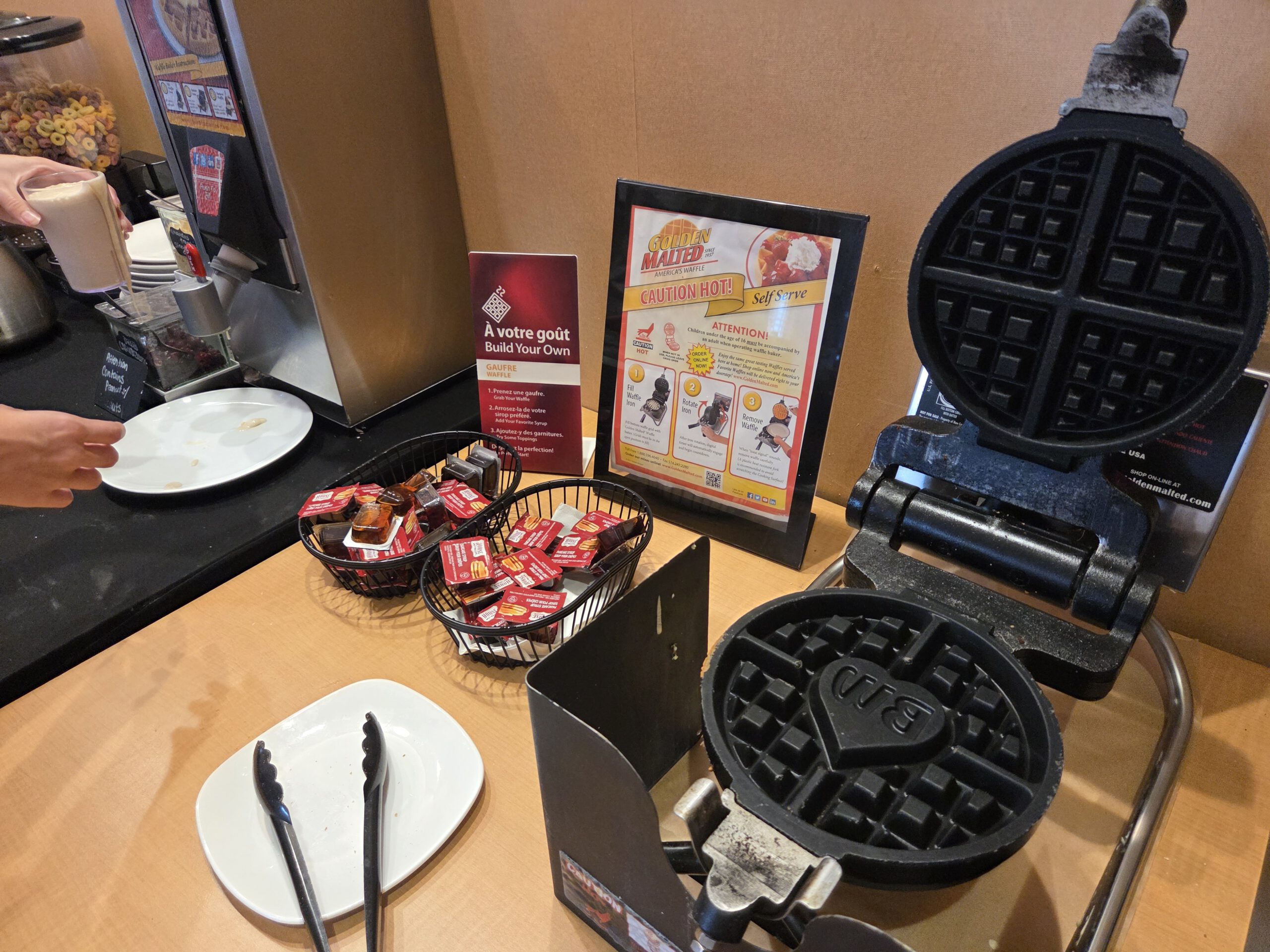 Die Betten im Best Western sind bequem, auf dem Flur gäbe es Automaten für Getränke und Snacks, sogar Waschmaschine und Trockner stehen bereit. Für den Pool bleibt leider keine Zeit. Das Frühstück ist inklusive. Attraktion ist ein Waffelautomat, in den man ein Becherchen Teig kippt und bald eine sehr dicke Waffel mit den Buchstaben BW, also dem Hotellogo, bekommt. Dazu Ahornsirup satt.