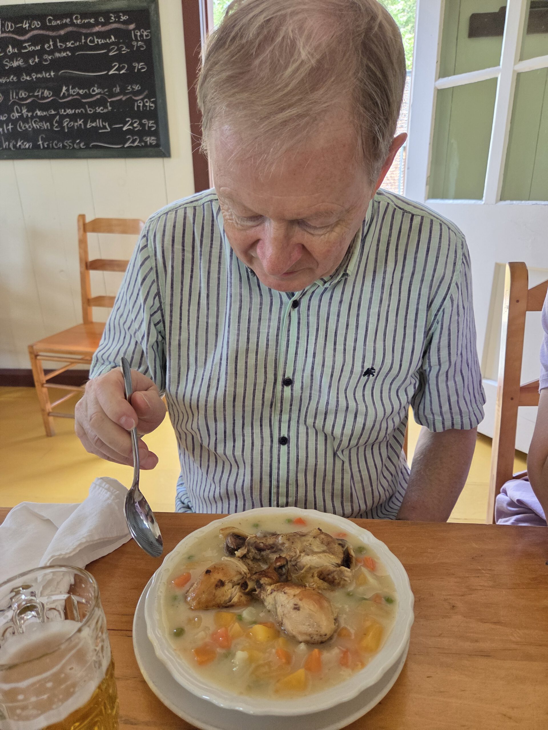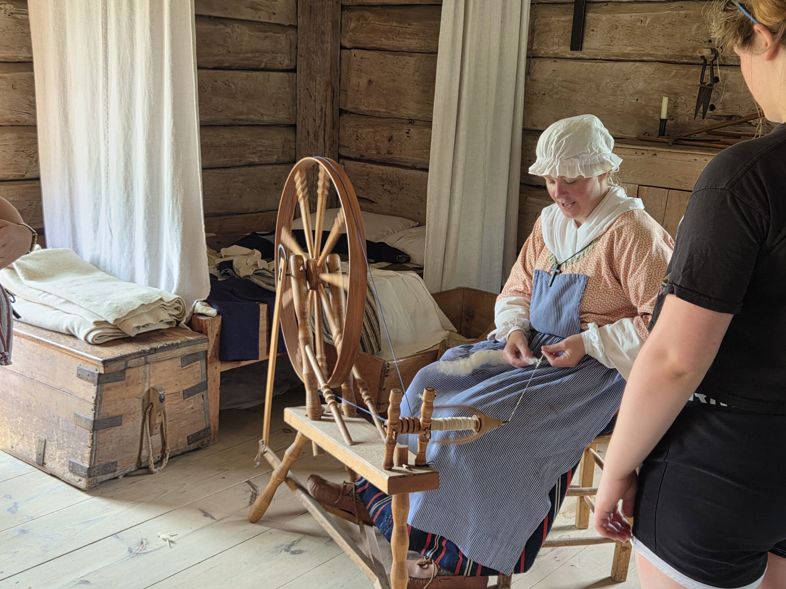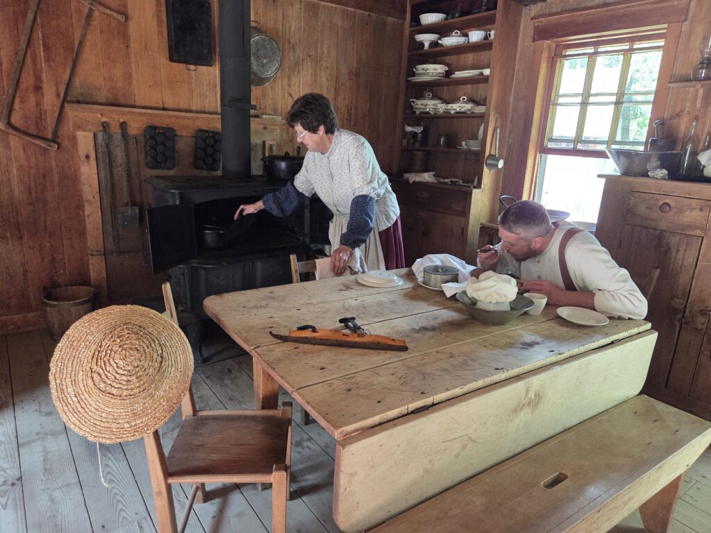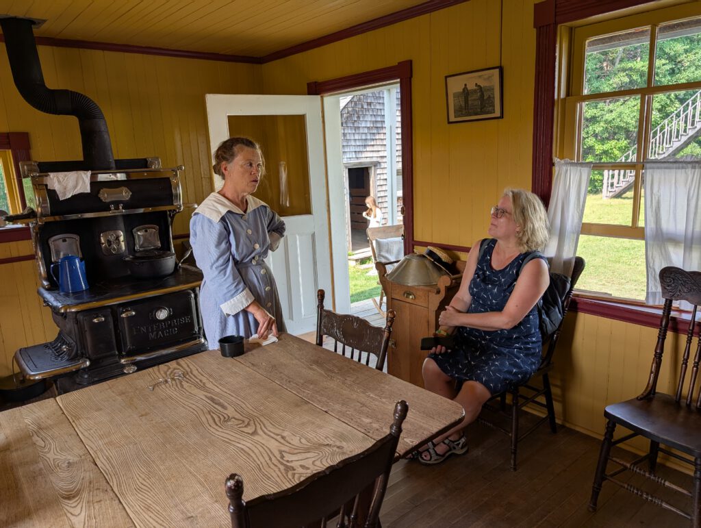 Im Museumsdorf wurden - größtenteils - Originalhäuser aus Ostkanada zusammengetragen, grob sortiert nach Zeitraum. Also erst ab 1840, dann um 1900, schließlich in den 1930ern. Das Besondere: Es gibt keine Tafeln oder Infoblätter, sondern in jedem Haus lebende Darsteller in zeitgemäßer Kleidung, die auf Englisch und Französisch von den Menschen erzählen, die einmal das Haus bewohnt haben. Zu Mittag kochen sie sich das Essen aus dieser Zeit. Superspannend und braucht viel Zeit. Dazu hat es knapp 30 Grad, die Sonne brennt.