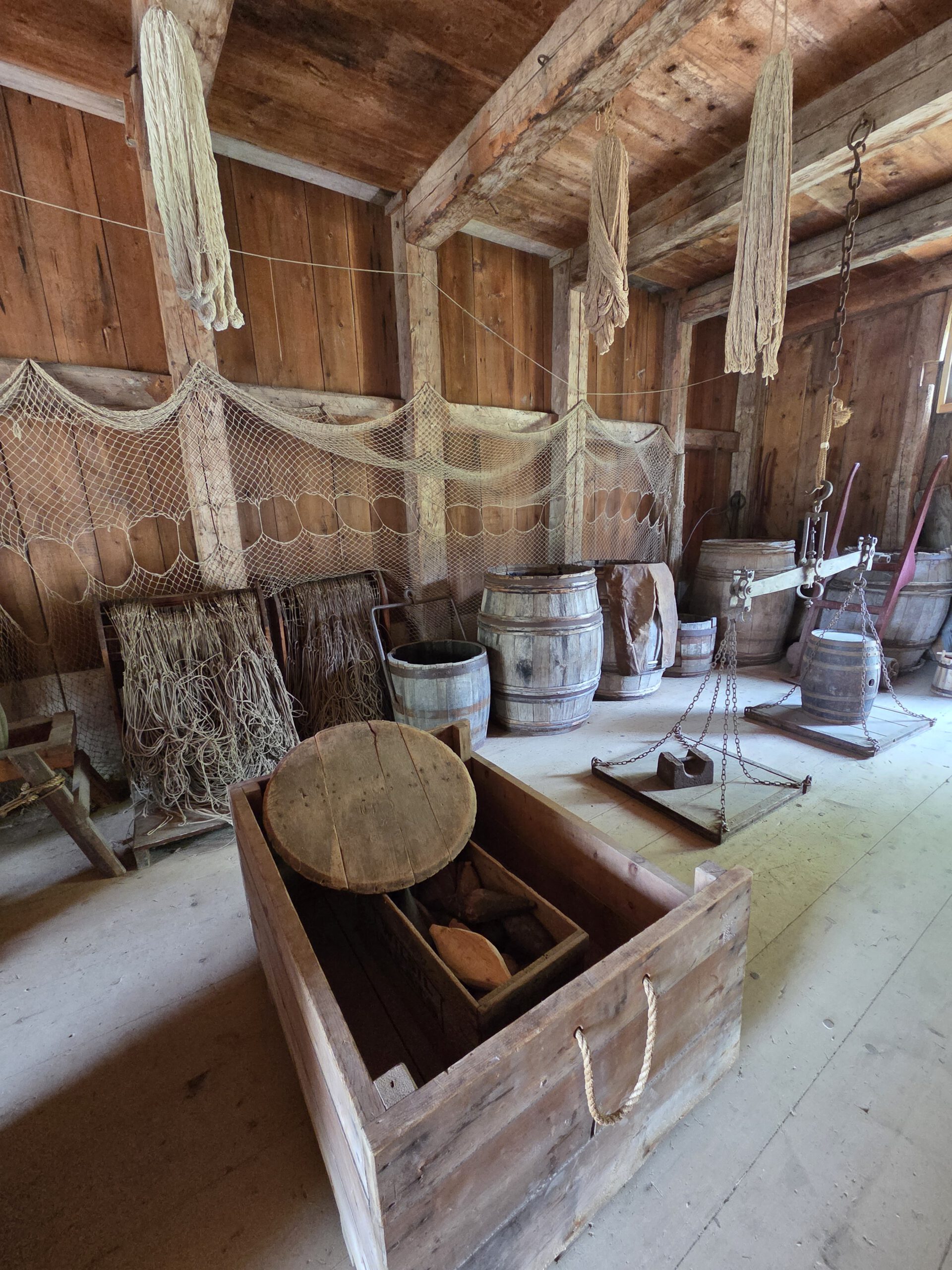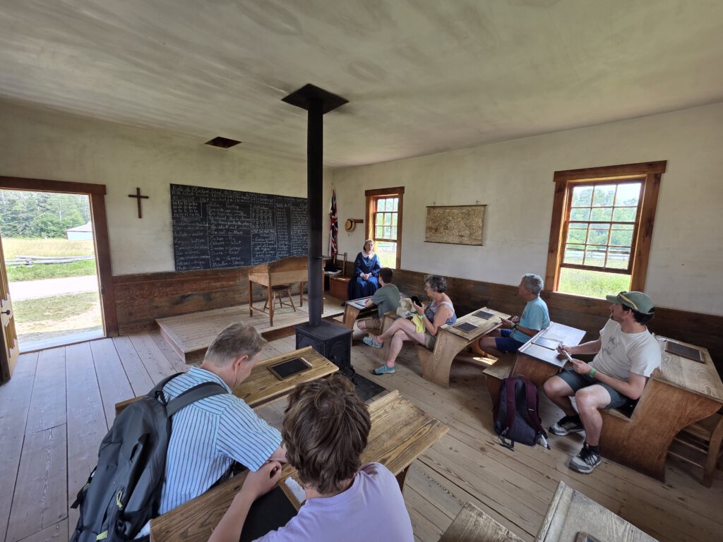Schon etwas erschöpft gelangen wir zum Schulgebäude. Dort flötet die "Lehrerin": So, und jetzt ist ungefähr Halbzeit, aber Sie haben ja noch einen zweiten Tag Zeit. Da erst fällt uns auf, wie das grüne Armbändchen mit dem "gültig für zwei Tage" gemeint war: Das Museum ist so groß, dass man sich tatsächlich zwei Tage Zeit lassen sollte ... Auch die Vermieterin hatte beim Verweis darauf, was alles geplant ist, nur angemerkt "ich mache für euch die Lichter an." Drei Augenpaare blicken die Reiseleitung kritisch an. Aber man konnte ja wirklich nicht ahnen, dass das Museum so groß ist, dass der Zwischenstopp danach beim Nationalpark Kouchibouguac auf der Hälfte der Strecke entfällt und wir dann wieder drei Stunden bis zur Unterkunft haben ... Auch der geplante Badestopp an der Düne von Bouctouche muss leider entfallen. Stattdessen sind wir bis 17 Uhr bei den historischen Gebäuden und taumeln schließlich fast vom Gelände.