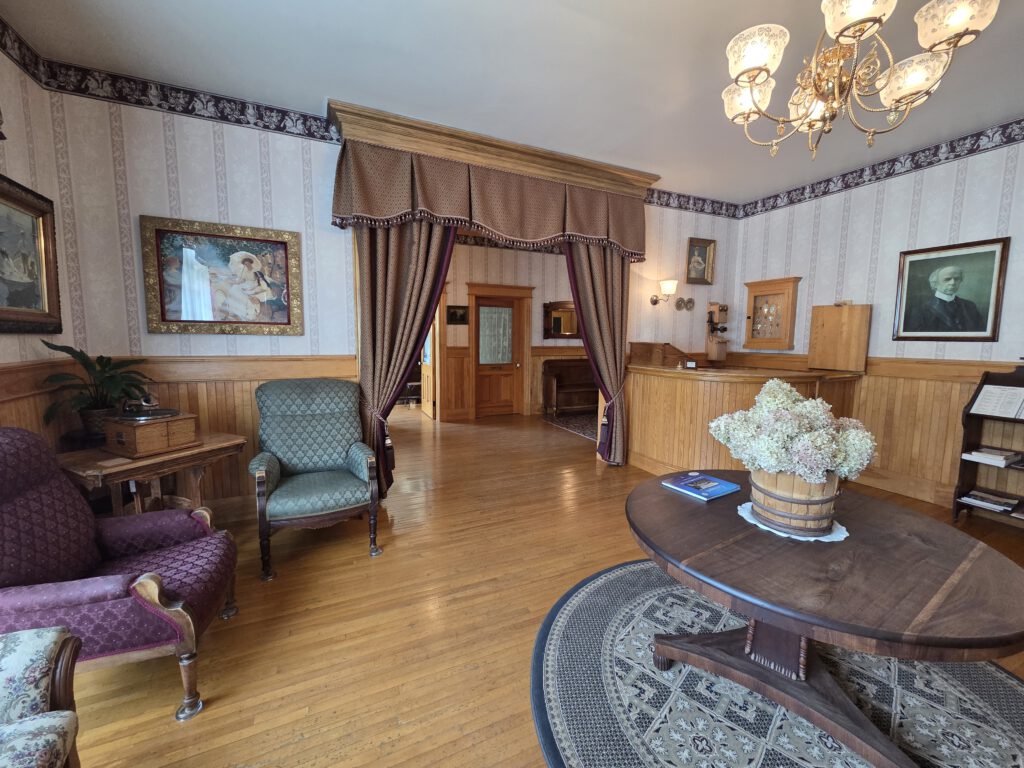 Ganz knapp zusammengefasst: Zunächst arme Bauern, die im Erdgeschoss einen Raum hatten, später zwei. Meist zwischen 7 und 10 Kinder, die auf Strohmatten auf dem Boden schliefen. Die Großeltern bekamen stets das richtige Bett. Im Dachboden wurde Getreide gelagert. Oft wurde erst ein Raum gebaut, dann der zweite angebaut. Über der Tür hing immer ein Gewehr, für Bären, Elche und vermutlich die Briten. Langsam gab es Holzböden, keinen offenen Kamin mehr, sondern gußeiserne Öfen für Wärme und zum Kochen. Ein Schotttisch-stämmiger Richter schließlich verlegte die Schlafräume in die erste Etage, wie er aus der Heimat gewohnt war.