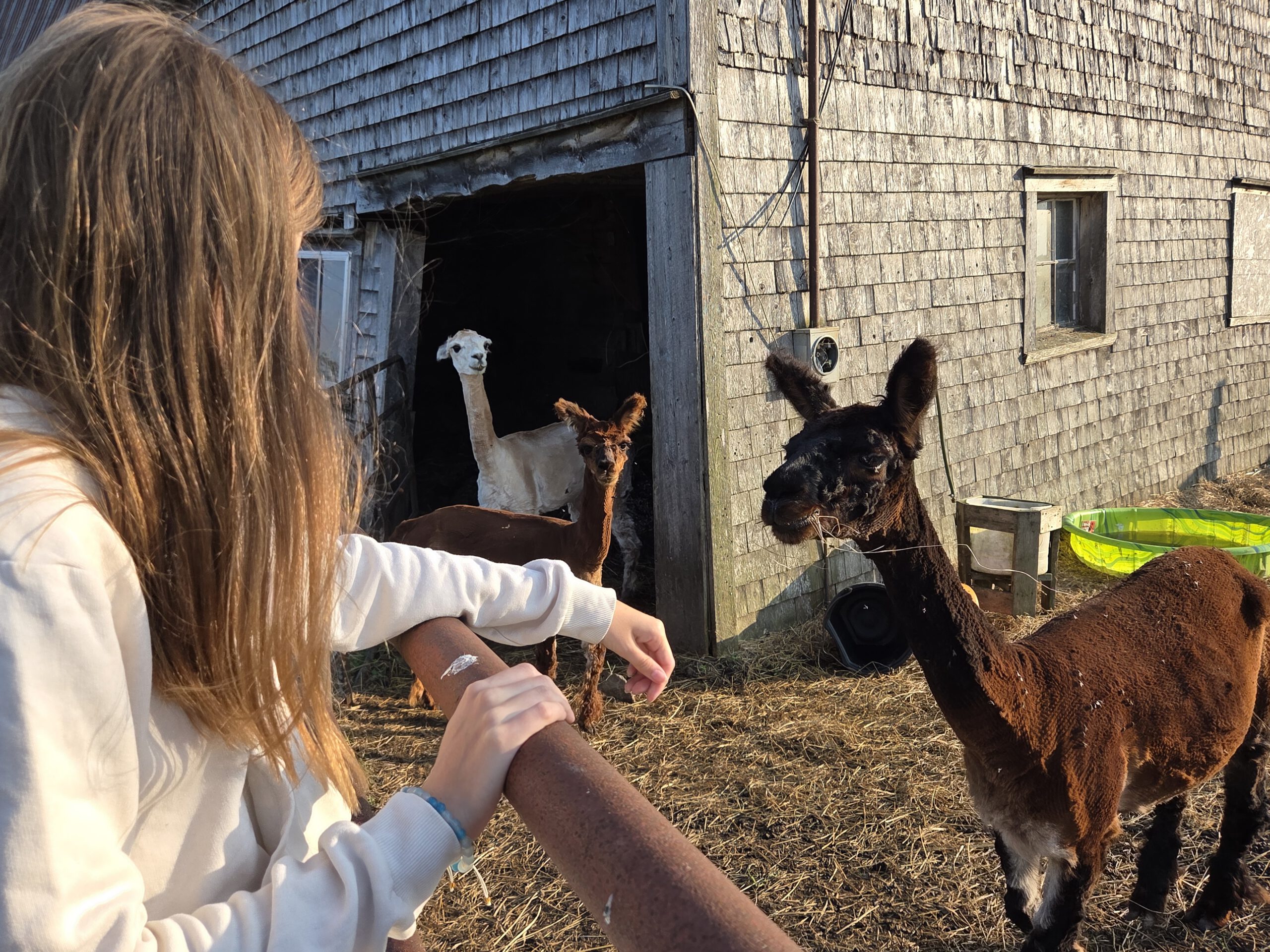 Louisa und Nicole drehen noch eine lange Runde um den Hof mit Abstecher zu den Pferden und den Alpakas. Rund um das Ferienhaus ist es deutlich kühler, als noch unten am Meer. Danach wird gegrillt.