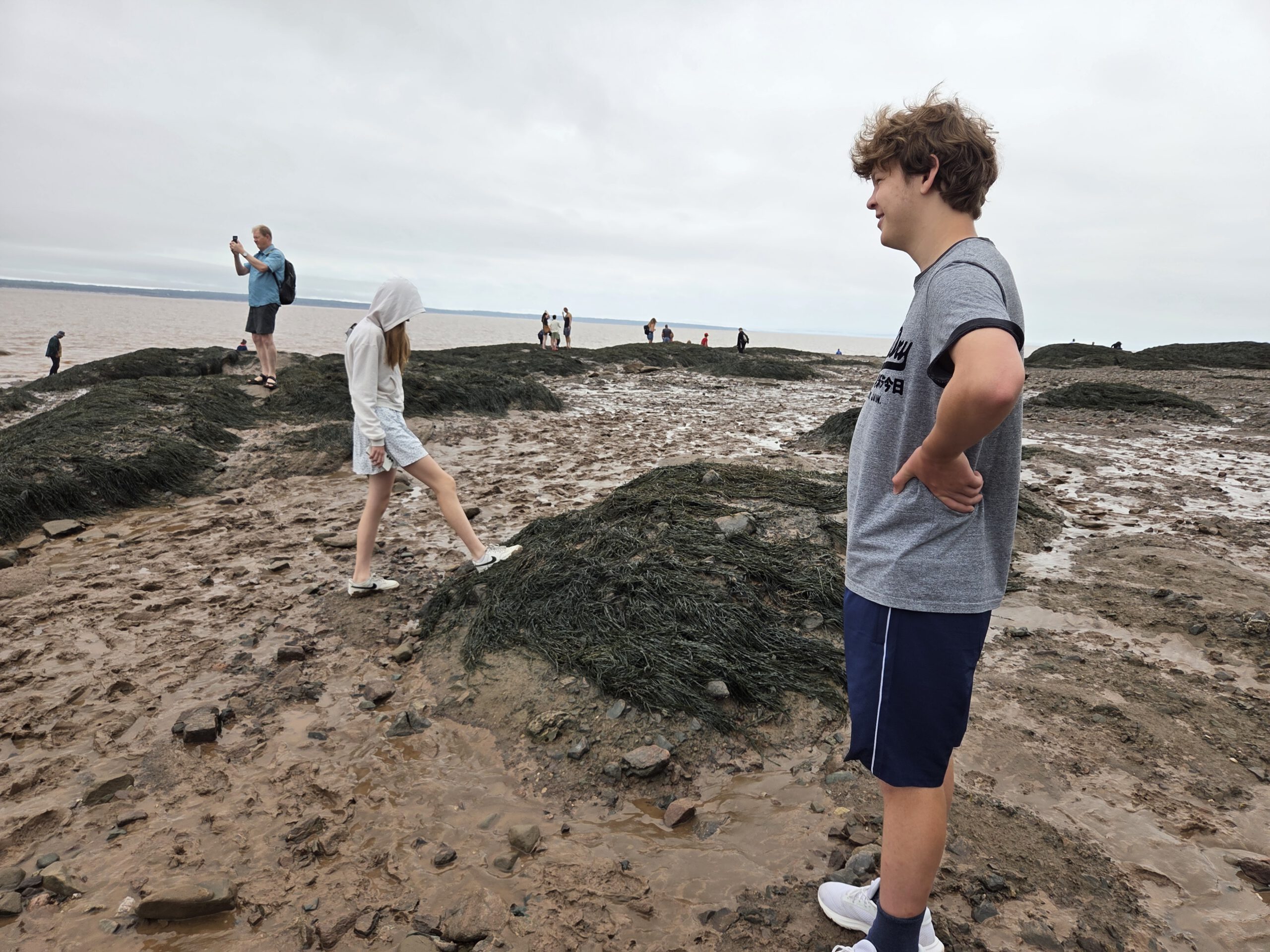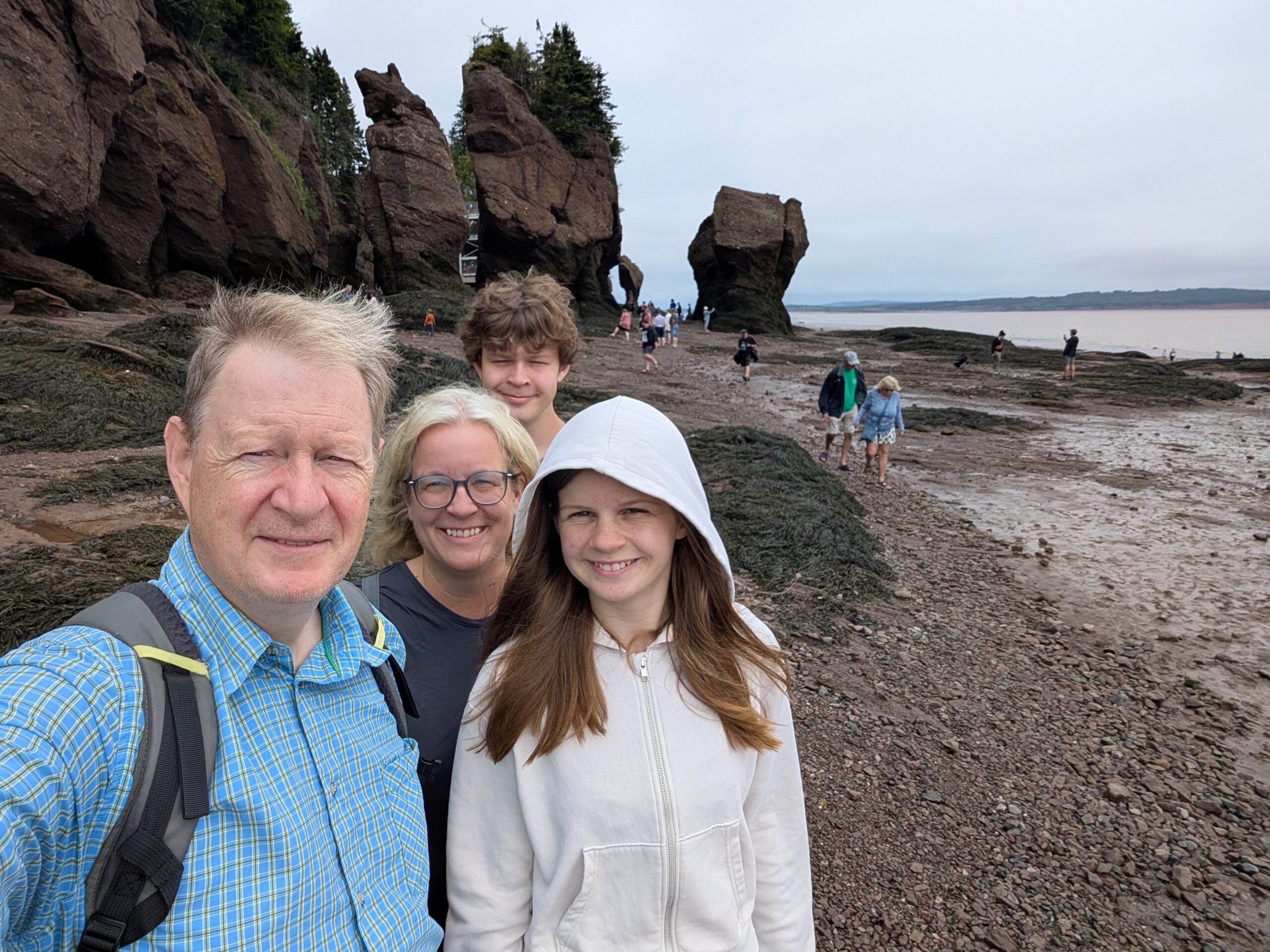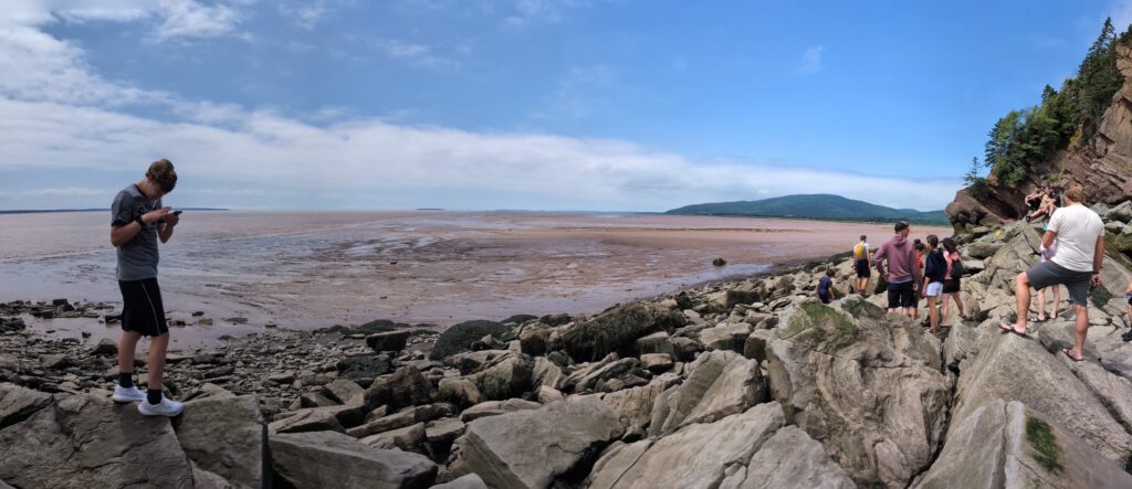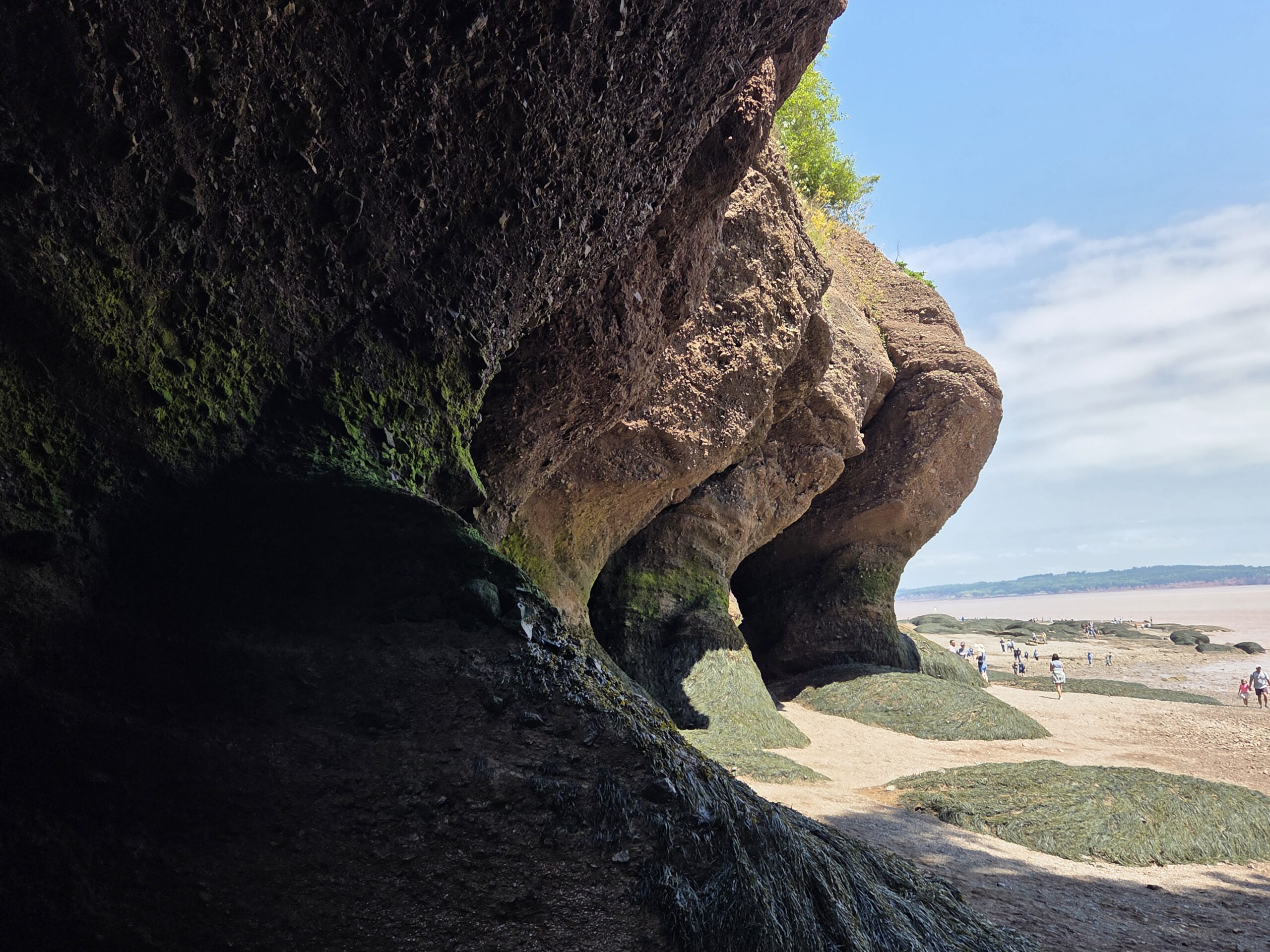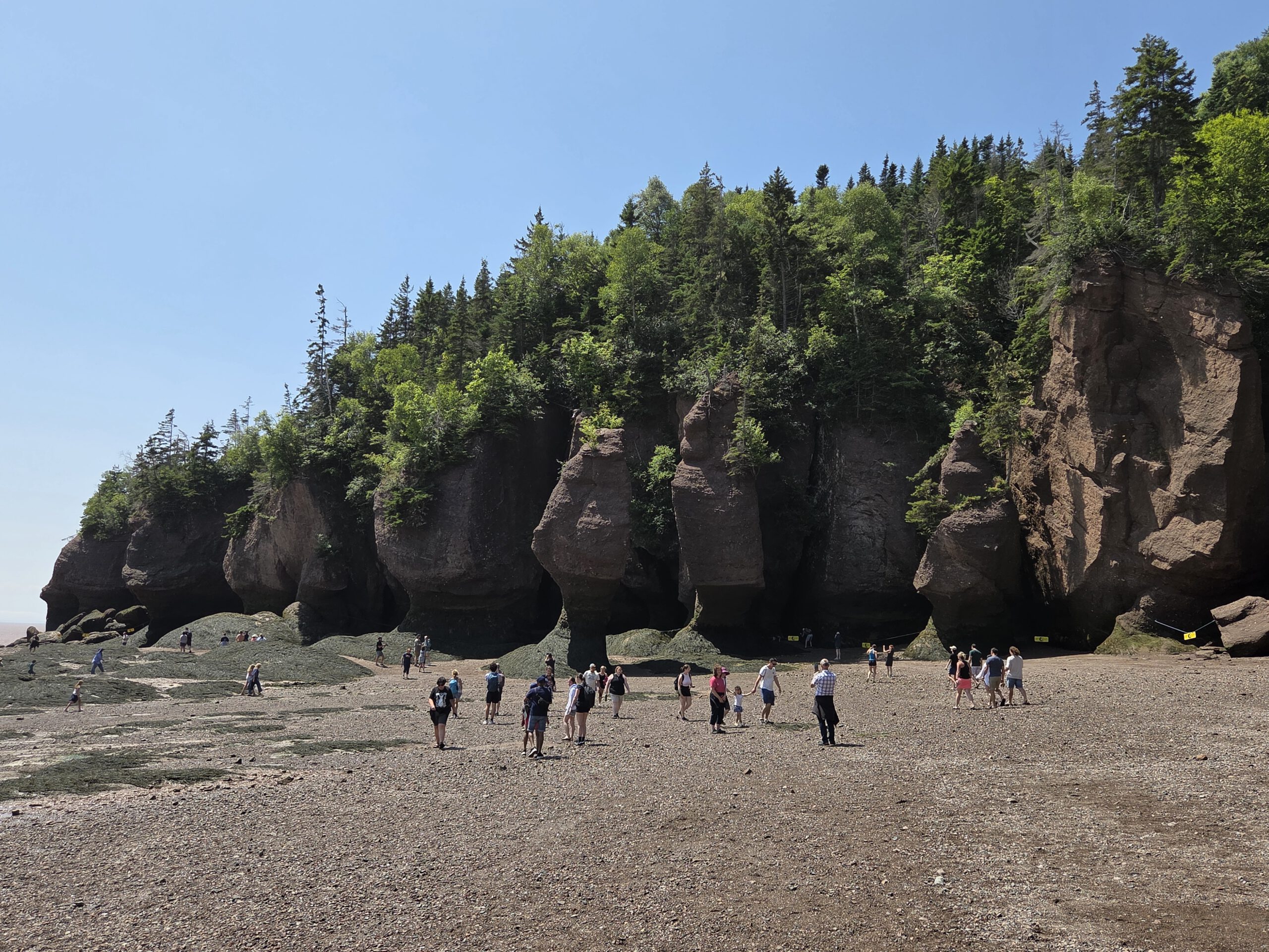 Aber wir sind erstmal mit vielen anderen unterwegs. Es gibt einzelne Beschwerden über Matsch an den neuen Turnschuhen, aber eigentlich ist der Boden gut begehbar. Meist fester Grund, nicht wie im Wattenmeer. Inzwischen ist es wieder knapp unter 30 Grad, die Luft ist feucht und man kann zwischen den Felsen durchaus Strecke machen. Bei irgendeiner Familie steht man immer im Bild, es gibt an jeder Ecke etwas neues zu sehen, macht Spaß. Nach knapp zwei Stunden verlassen wir das Gebiet wieder und machen uns auf Richtung Fundy Nationalpark.