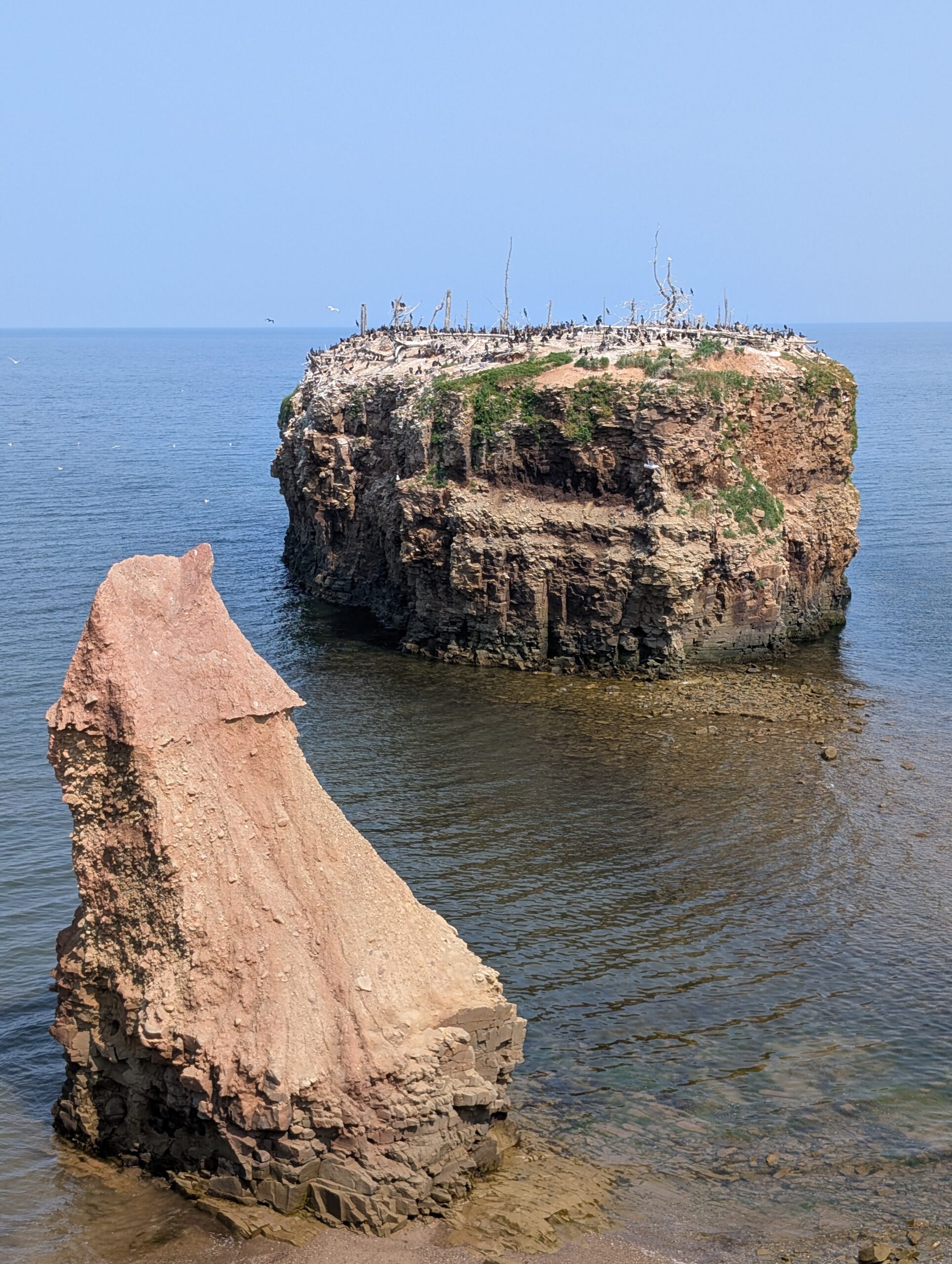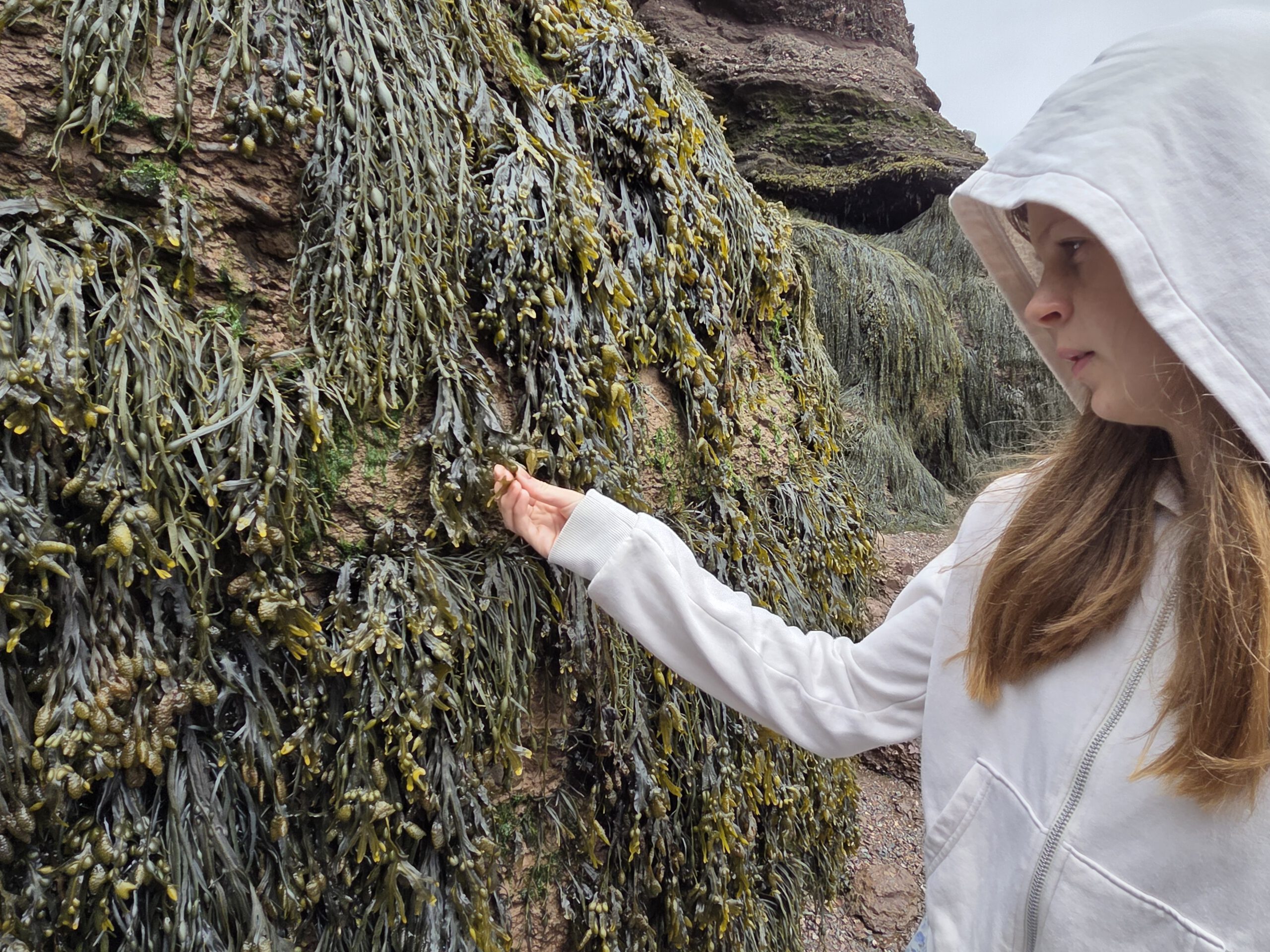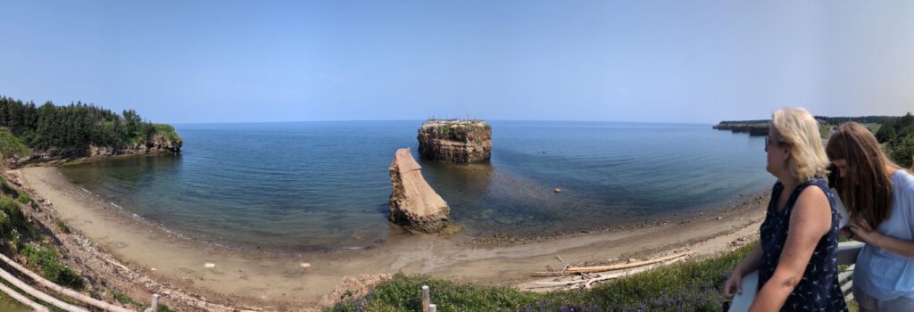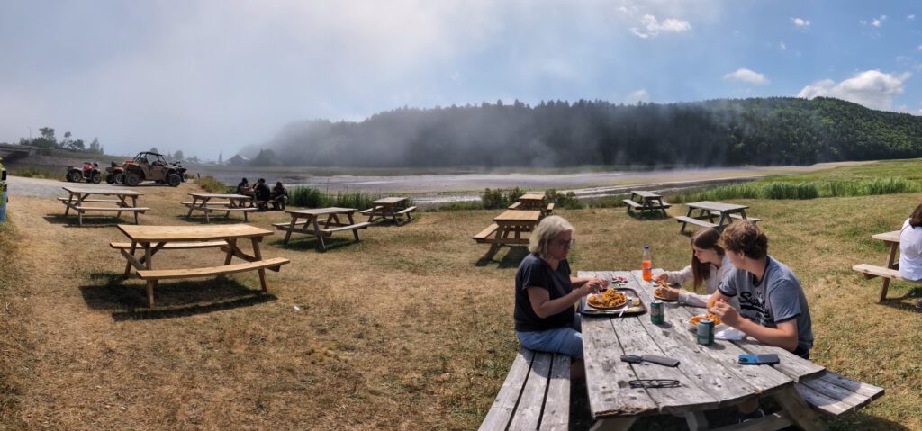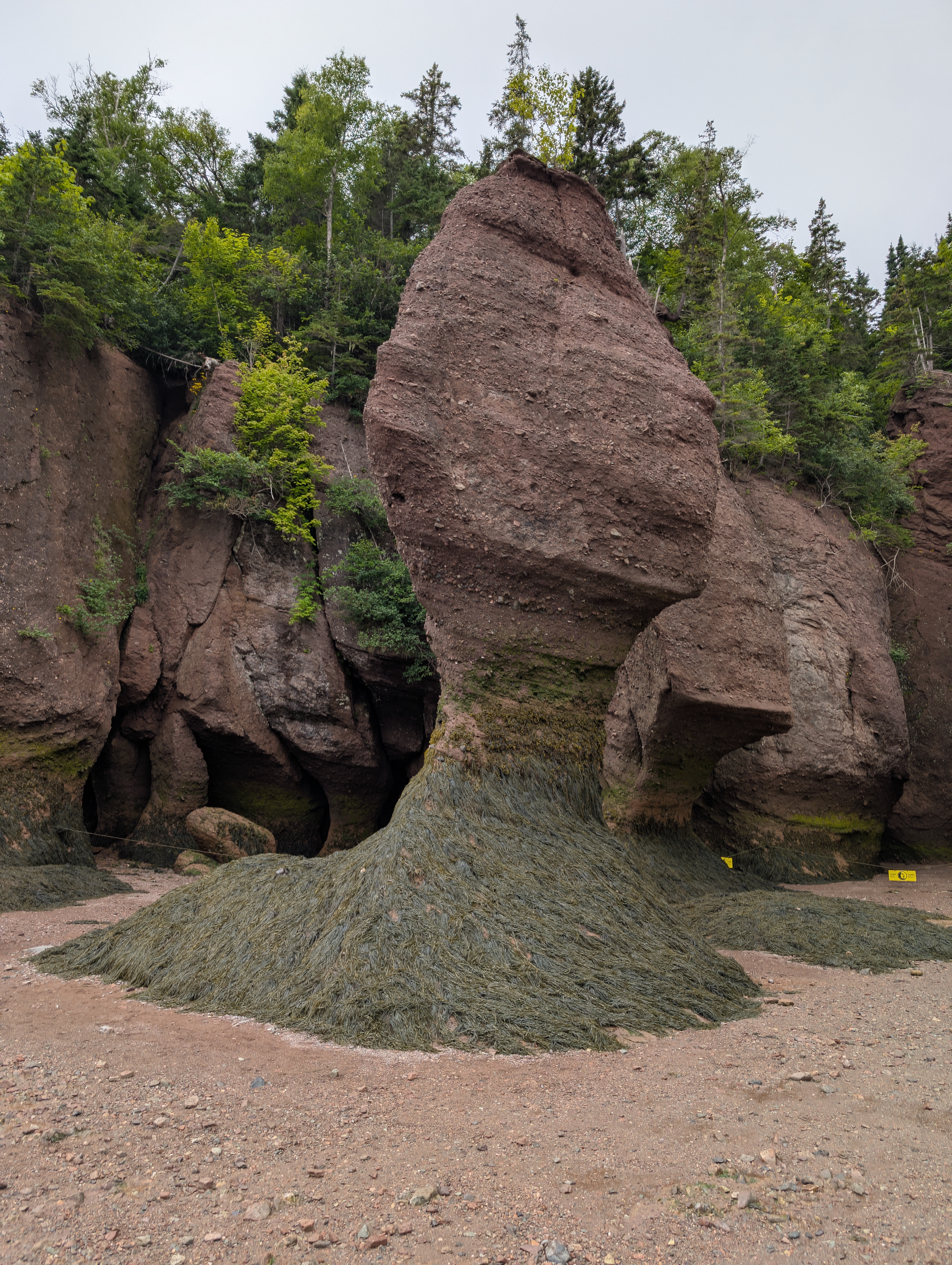 Aber wir sind erstmal mit vielen anderen unterwegs. Es gibt einzelne Beschwerden über Matsch an den neuen Turnschuhen, aber eigentlich ist der Boden gut begehbar. Meist fester Grund, nicht wie im Wattenmeer. Inzwischen ist es wieder knapp unter 30 Grad, die Luft ist feucht und man kann zwischen den Felsen durchaus Strecke machen. Bei irgendeiner Familie steht man immer im Bild, es gibt an jeder Ecke etwas neues zu sehen, macht Spaß. Nach knapp zwei Stunden verlassen wir das Gebiet wieder und machen uns auf Richtung Fundy Nationalpark.