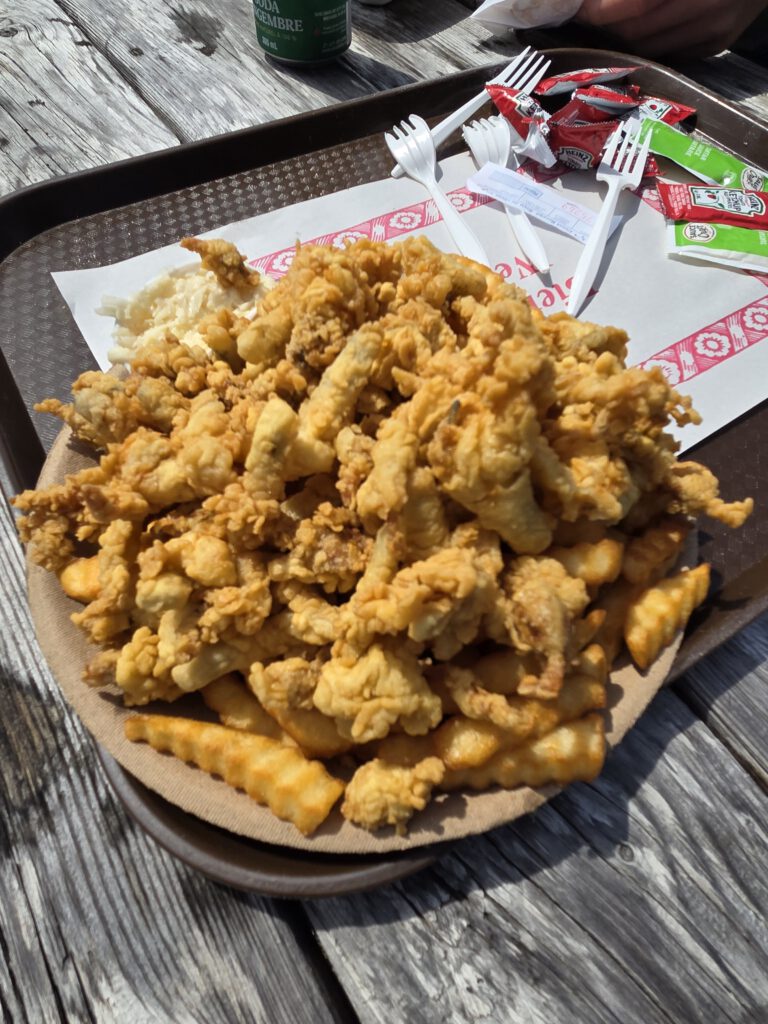 Dieser ist nochmal knapp 40 Minuten Fahrt entfernt. Das übliche Bild aus schmucken Häuschen, Friedhöfen ohne Mauer oder Grenzzaun, es gibt sogar eine Vogelscheuche namens Trump (die abends auf der Rückfahrt ohne Kopf da steht). Im Örtchen Alma stehen viele Fischerboote im Hafen und ein Fischrestaurant reiht sich an das andere. Wir entscheiden uns spontan für den Imbiss, den auch die Bauarbeiter und andere Einheimische ansteuern. Muscheln, Burger und natürlich wieder zu viele Pommes, insgesamt sehr lecker.