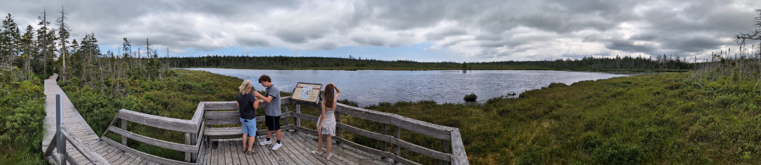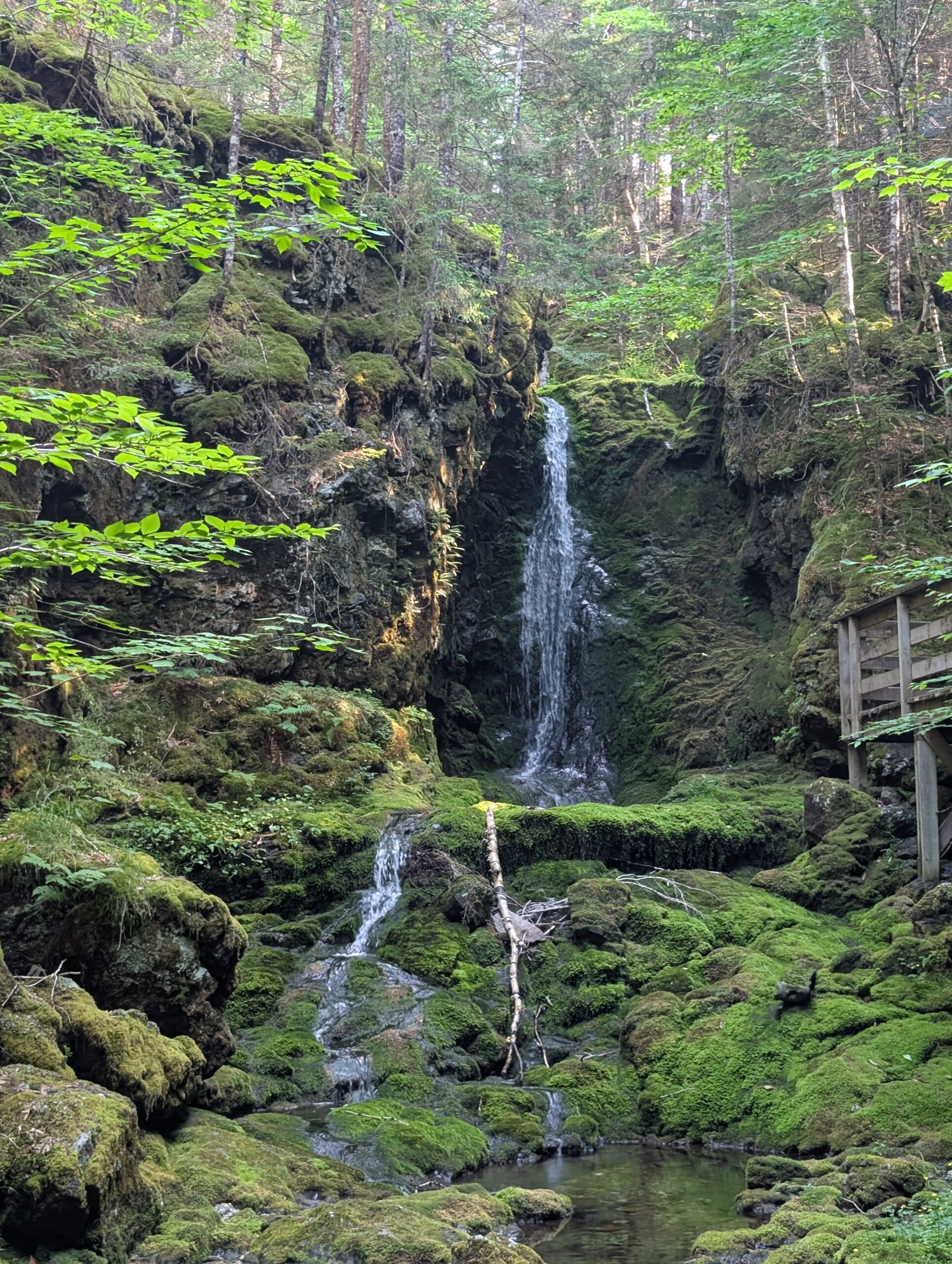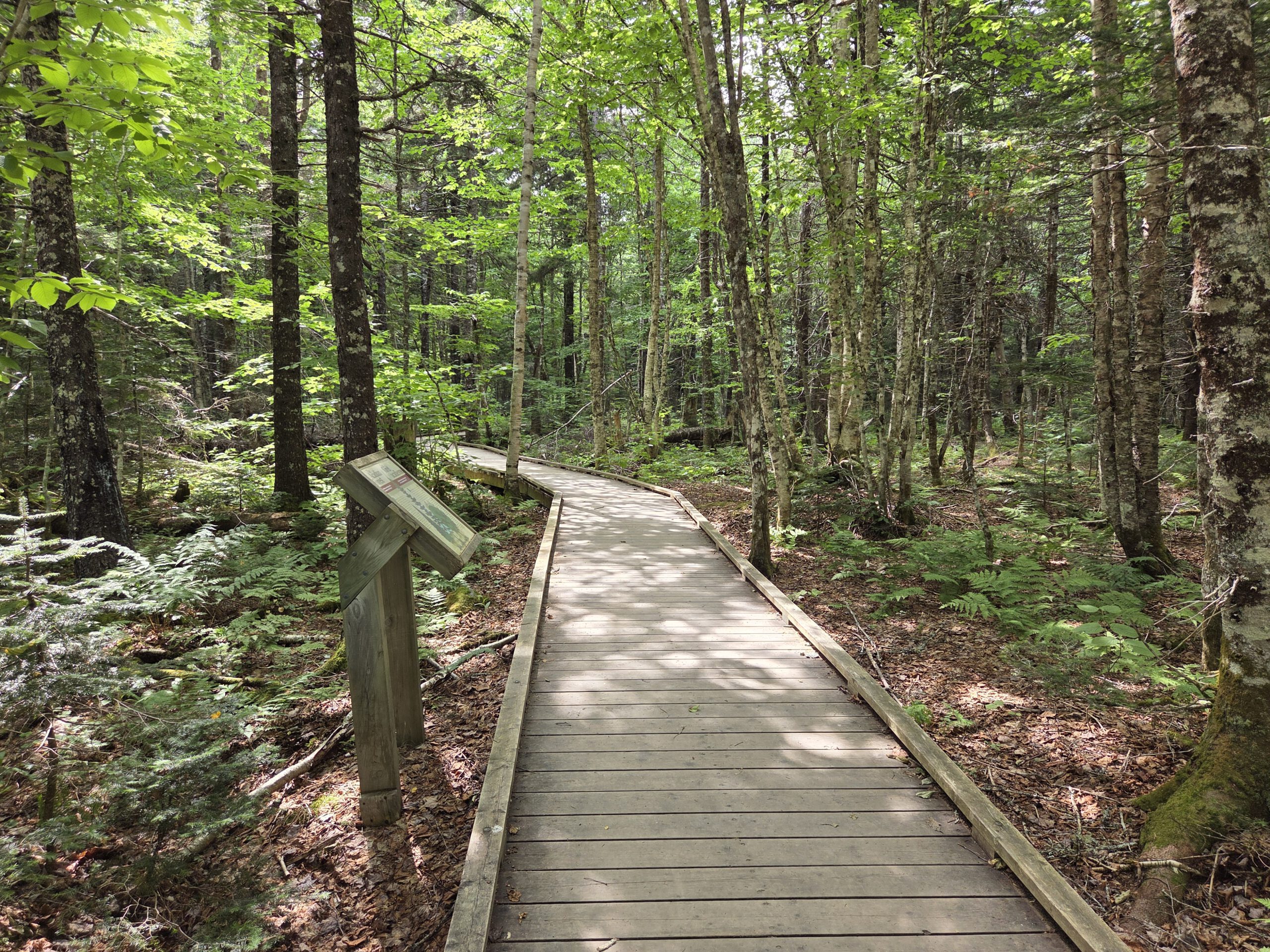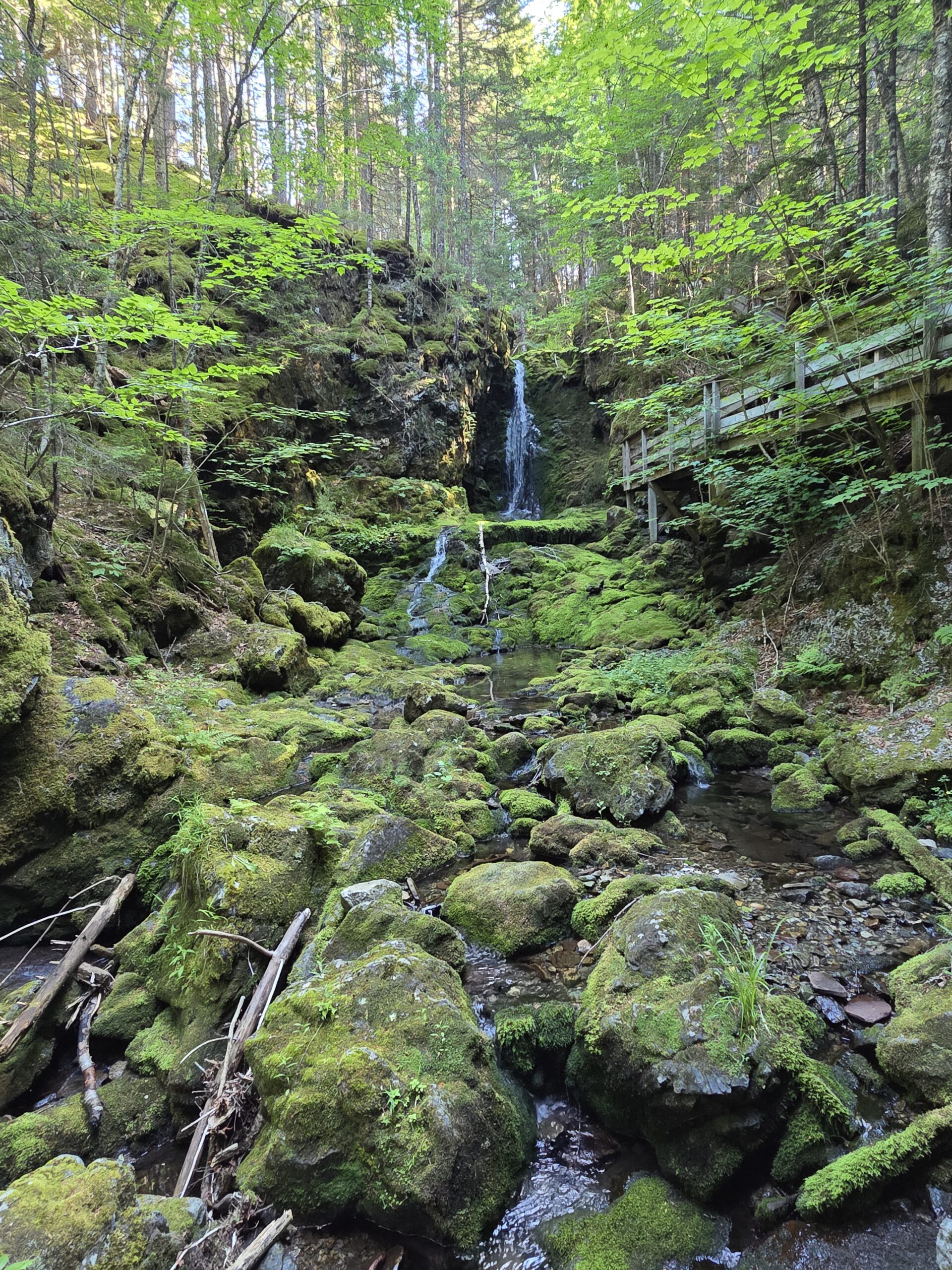 Danach lassen wir uns im Besucherzentrum des Fundy-Parks kurz beraten: Welche kurzen Wege könnten wir ansteuern? Die knapp 3 Kilometer durch die "Karibu Ebene", inzwischen ein schöner Mischwald mit See in der Mitte, der aber gefährlich wie Treibsand sein soll, es mussten schon Elche gerettet werden. Danach steuern wir noch die Dickson Falls an, die gelegentlich ziemlich überlaufen sein müssen. Lauschiger Wald, dunkles Moos, mit vielen Treppen, aber ganz ehrlich: In diesem heißen Sommer ist der Wasserfall eher ein Rinnsal.