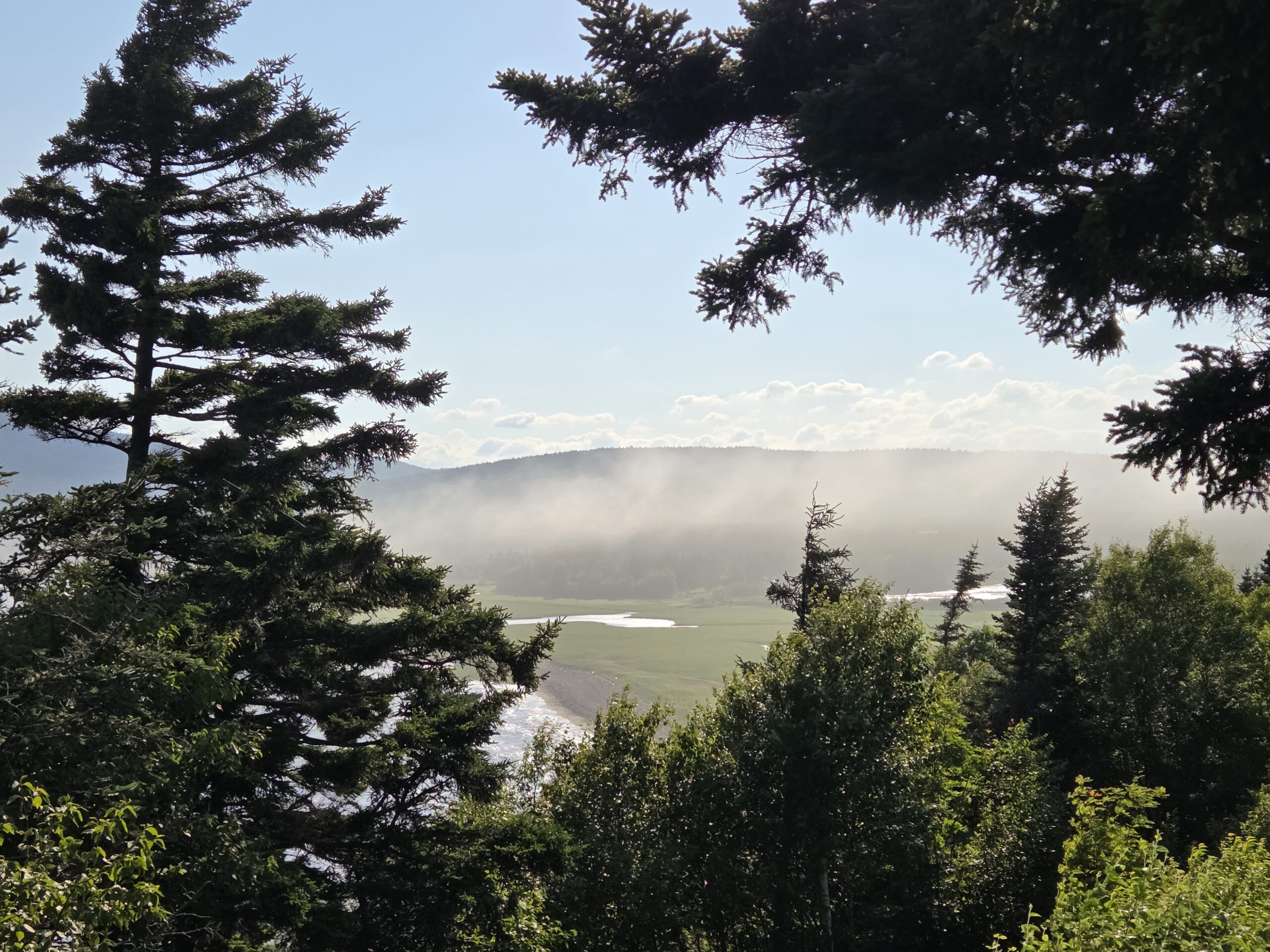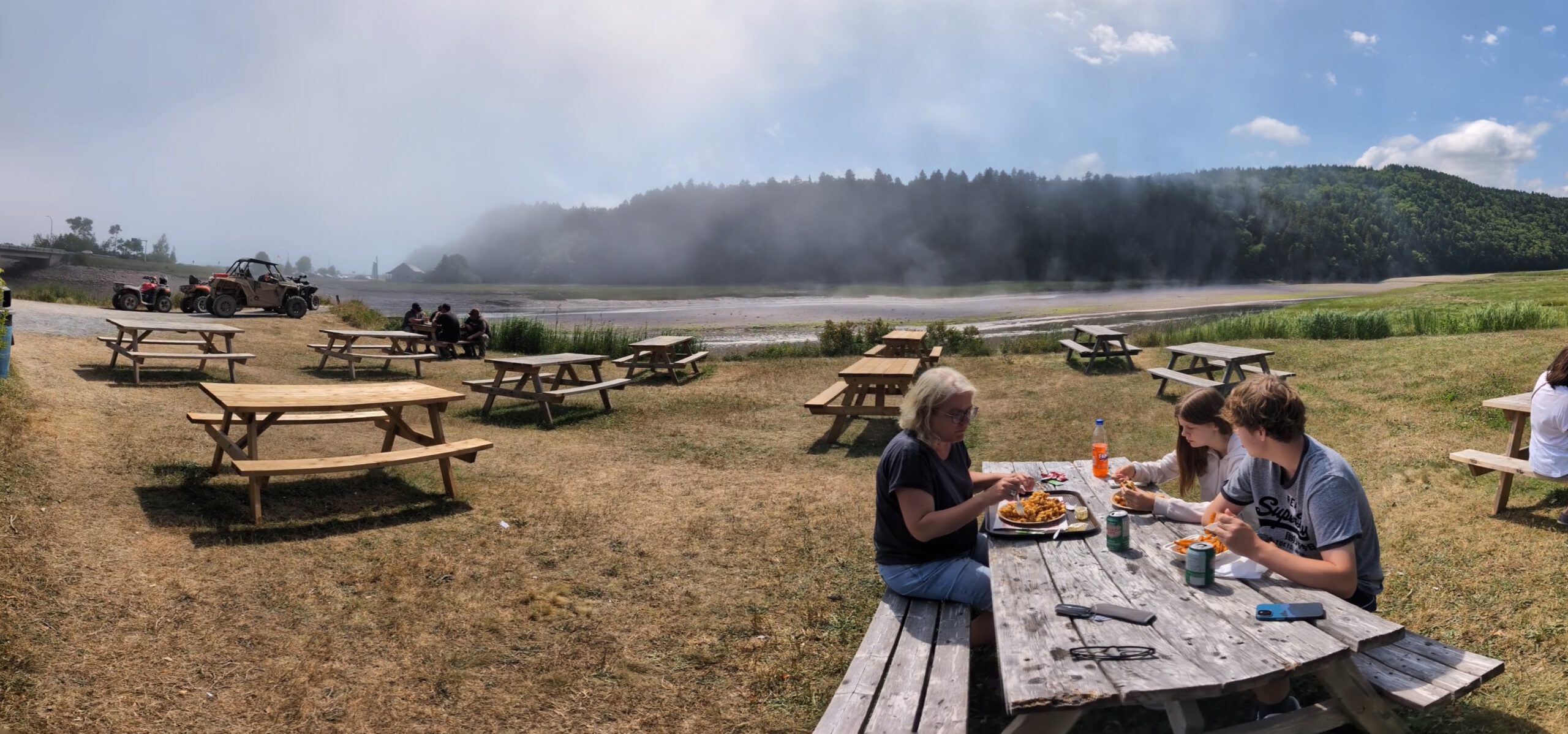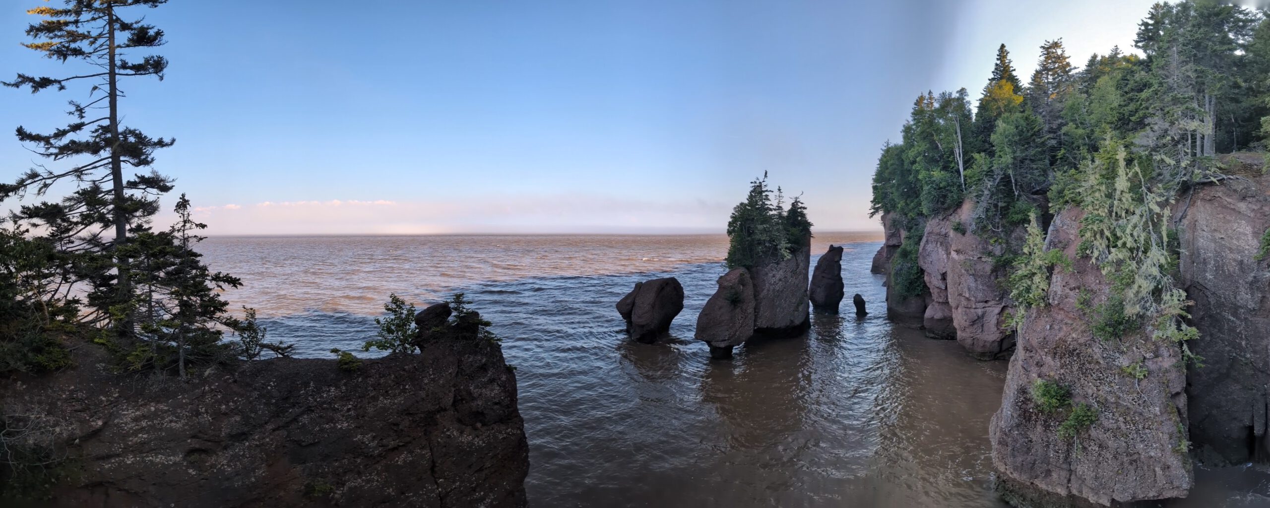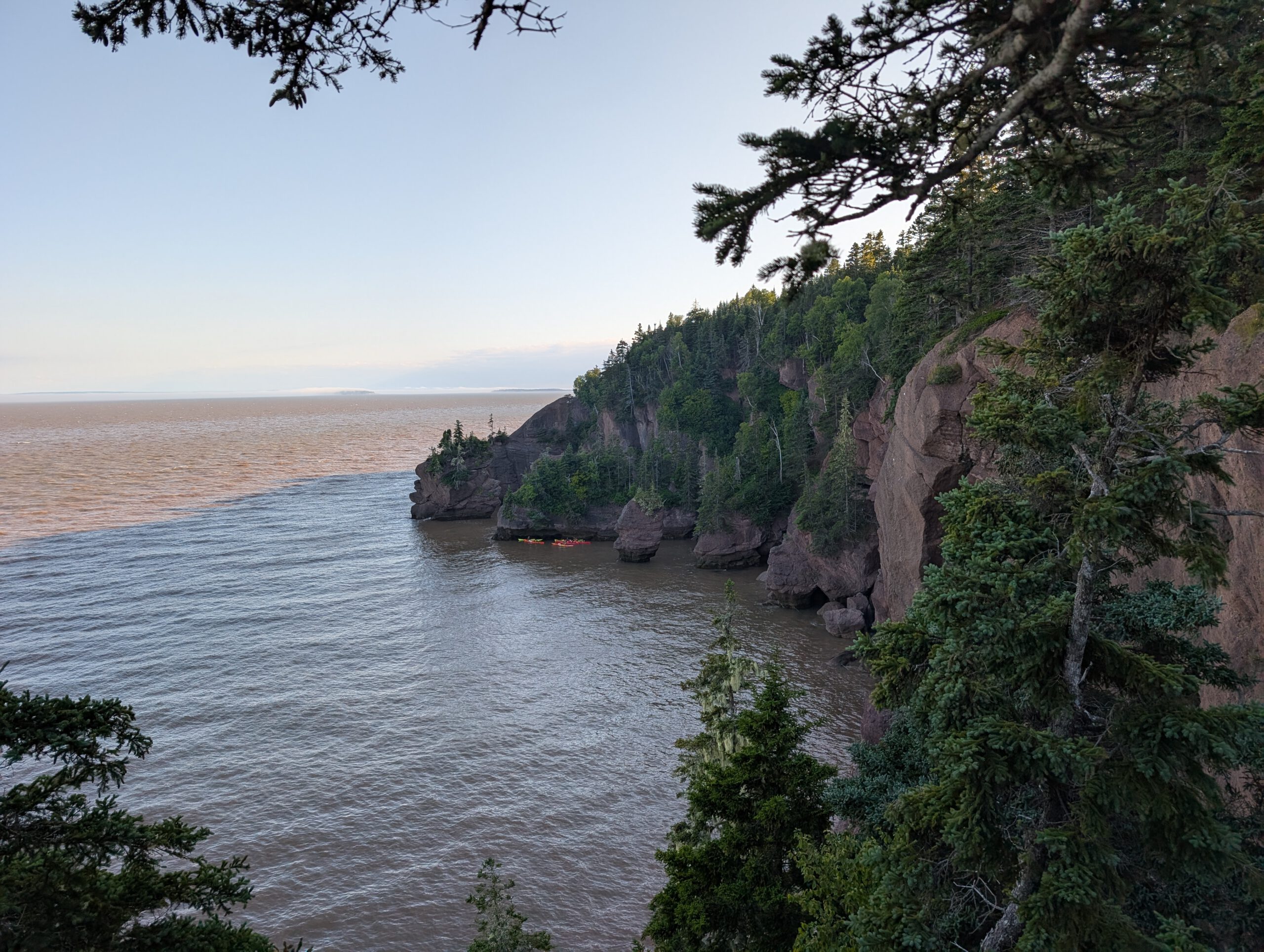 Auf dem Weg zurück zu den Hopewell Rocks bewundern wir kurz, wie die Wolken aufs Meer fallen. Danach steuern wir bei schönstem Abendlicht im inzwischen recht leeren Park noch einmal die Aussichtspunkte an. Jetzt ragen nur noch die Spitzen der Felsen aus dem Wasser, Kajakfahrer sind unterwegs. Und wir haben nach zehn Stunden, zwei Parks und 15 Kilometern langsam genug. Zum Abendessen gibt es Reste aus dem Kühlschrank.