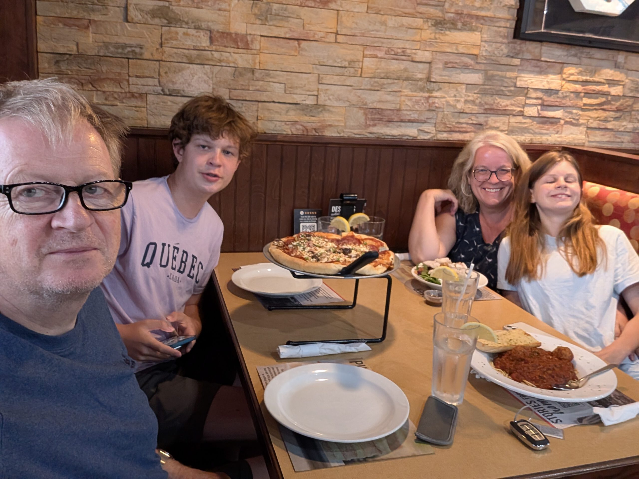 Kurzer Halt im Grenzörtchen Edmunston, um zusammen mit anderen Touristen einen betroffenen Blick Richtung US-Grenze zu werfen. Dann steuern wir Bathurst an. Das Navi verspricht eine Ankunft gegen 21.30 Uhr ... Fahrer Gerald beschließt im Ort Saint-Quentin noch eine Pizzeria zu besuchen, bevor wir knapp 2 Stunden durch das Nichts fahren. Saint-Quentin mit seinen etwas 2200 Einwohnern ist übrigens ein munteres Örtchen im Nirgendwo, an dem sich vermutlich gut leben lässt. Bei Pizza Delight gibt es neben einer Pizza auch leckeren Salat und Nudeln - und die komplett übermüdete Bedienung trägt Nicole sogar noch die Tasche hinterher, die sie vergessen hat.