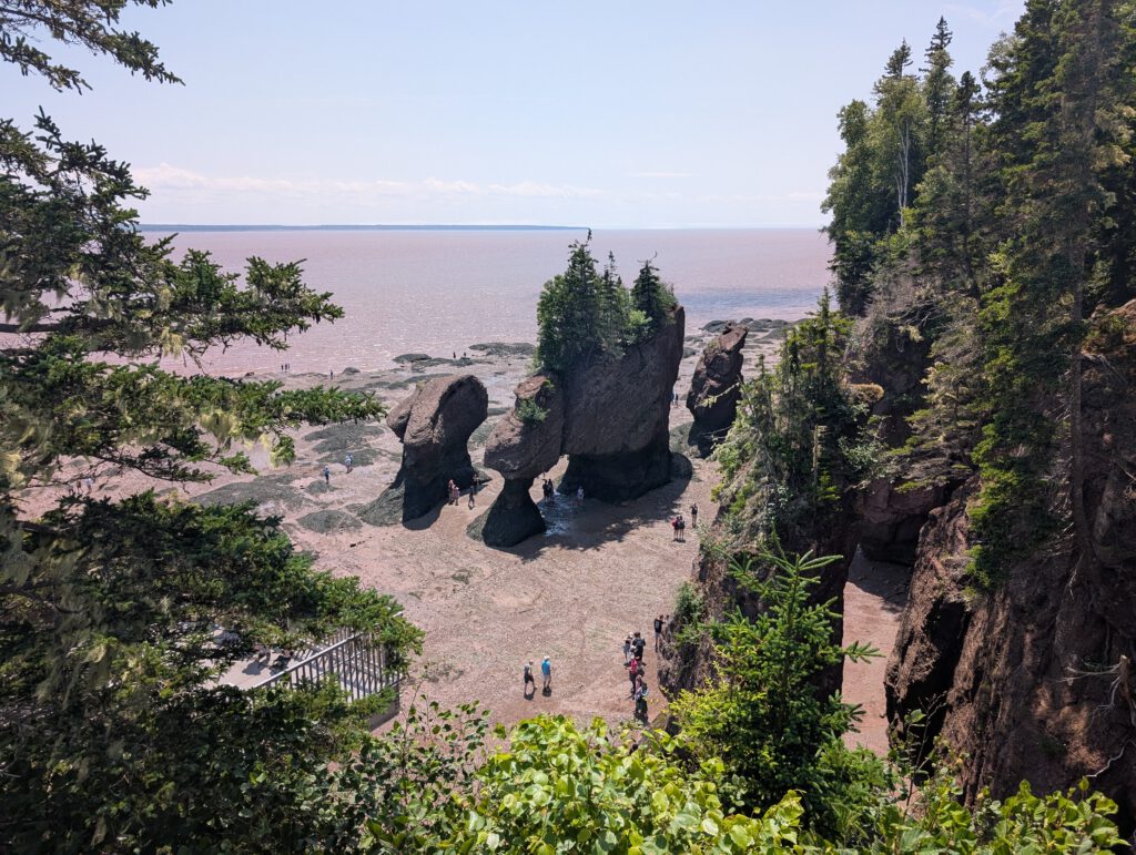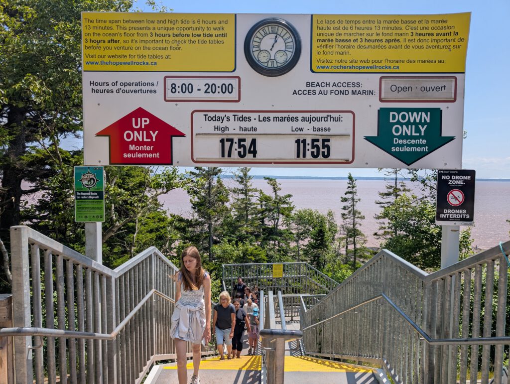 Entfernungen darf man in Kanada nicht unterschätzen, es gibt andere Tempolimits als in Deutschland und über viele Flüsse führen schlicht keine Brücken. Daher brauchen wir für die 60 Kilometer zum Park der Hopewell Rocks über eine Stunde. Dabei gibt es einen engen Zeitplan: Die Felsformationen sind nur während der Ebbe aus der Nähe zu besichtigen, diese ist um 11.55 Uhr.