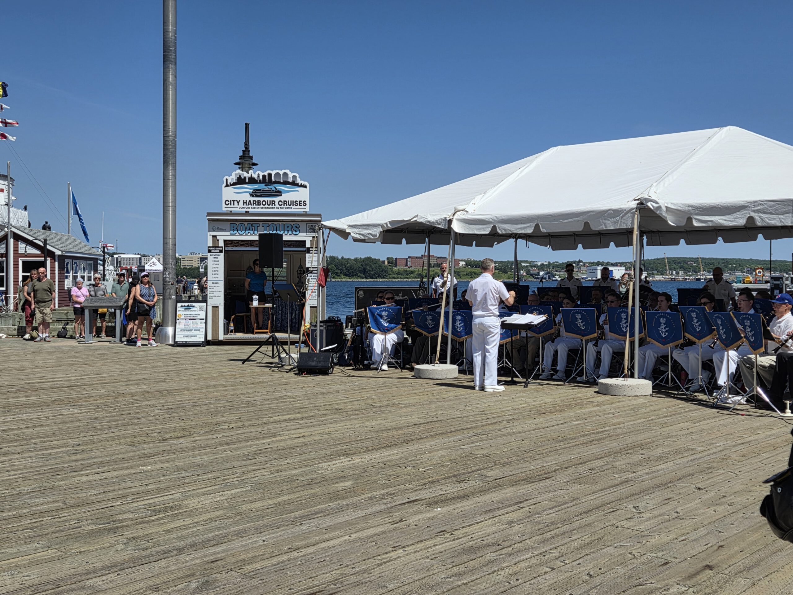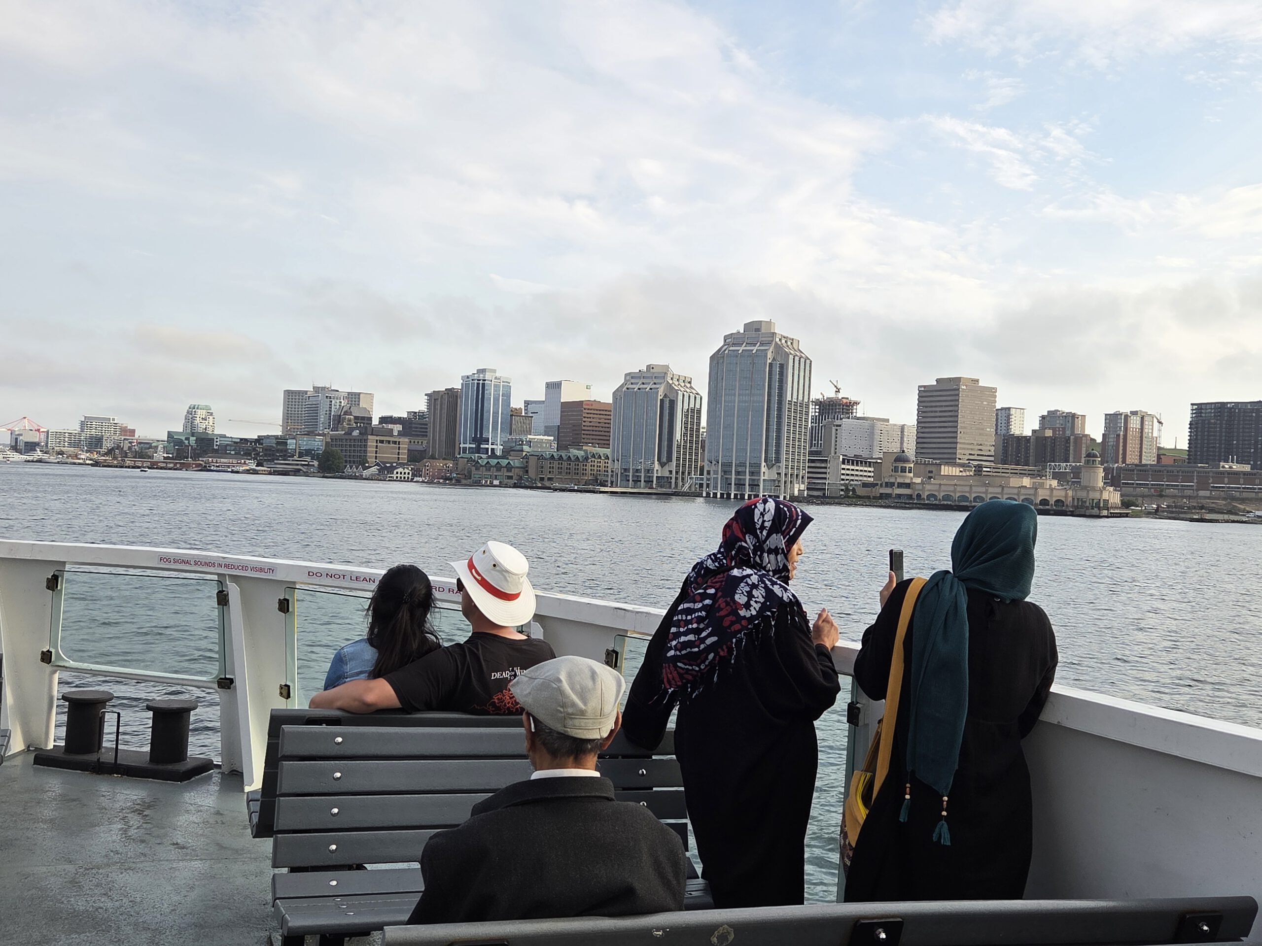 Am späten Nachmittag nehmen wir die Fähre auf die andere Seite der Bucht. Eine günstige Fahrt auf einem kugeligen Schiffchen, die Bezahlungsweise ist jedoch wahlweise irgendwie antik (Bargeld in große Flaschen werfen) oder sehr modern (per Halifxapp). Einerseits ging es um den Blick auf die Skyline. Andererseits startet dort praktischerweise gerade das Nova Multifest, ein Festival, das mit Streetfood und Musik die Vielfalt feiert. Nun, die Reisegruppe meutert erst gewaltig. Aber ... Natürlich schmeckt das nepalesische/vietnamische/... Essen dann bestens. Gäbe auch viel philippinisch, weil es da wohl eine große Community gibt. Etwas Wartezeit auf die Frühlingsrollen, weil der Strom ausfällt. Auf der Bühne erst feiner Jazz, dann eine indische Nummer, die wir garnicht verstehen, die aber die indische Gemeinschaft sehr begeistert. Als wir zur Fähre zurück eilen, kommt gerade der Gouverneur von Nova Scotia an.