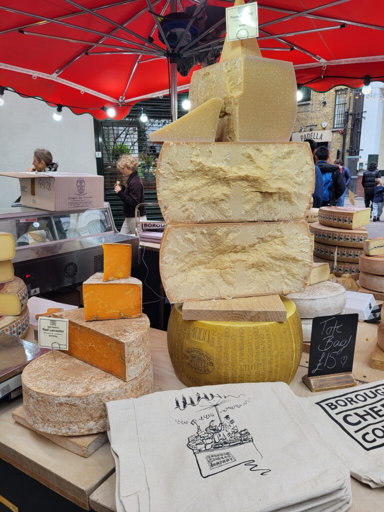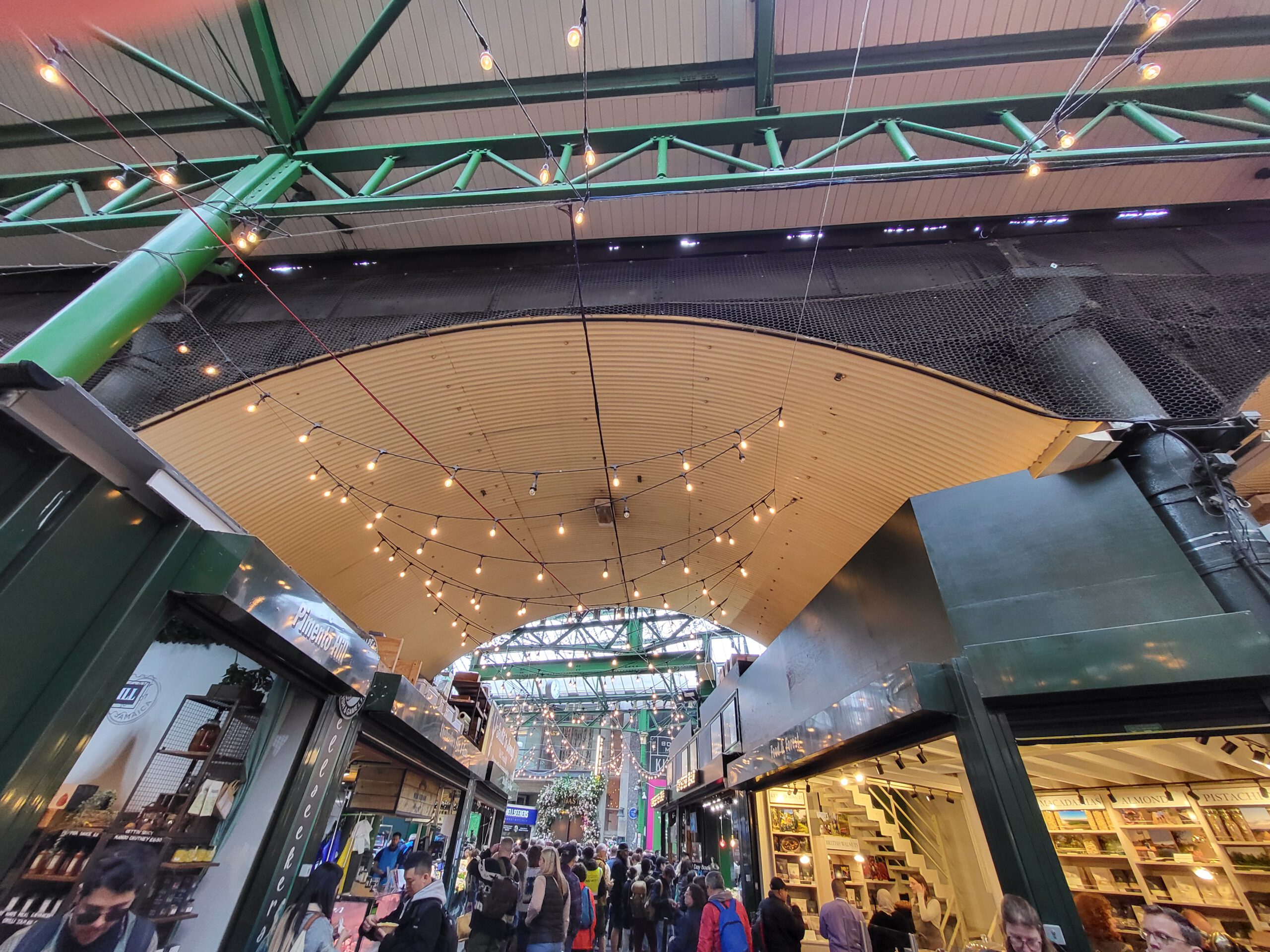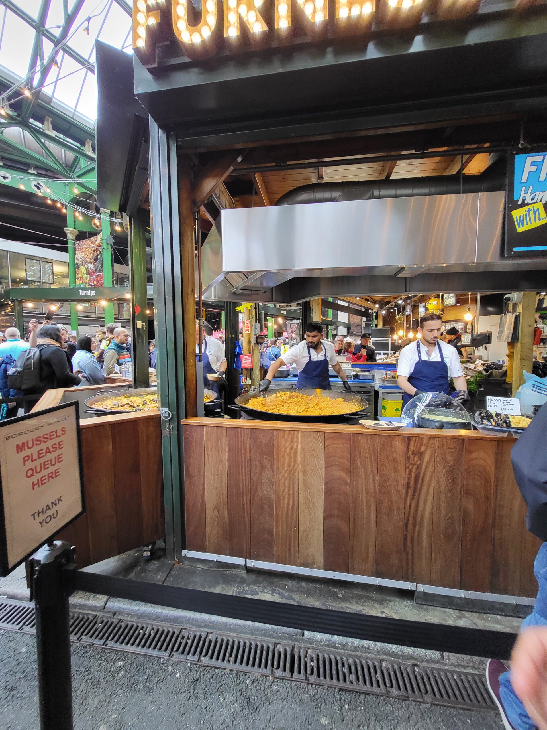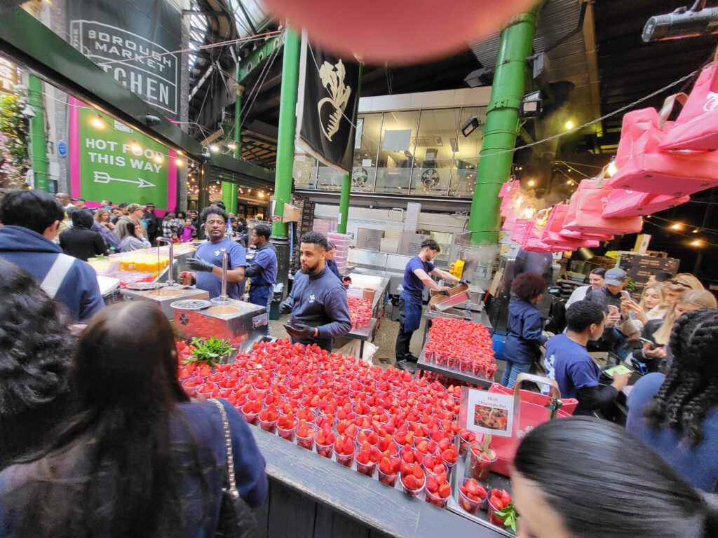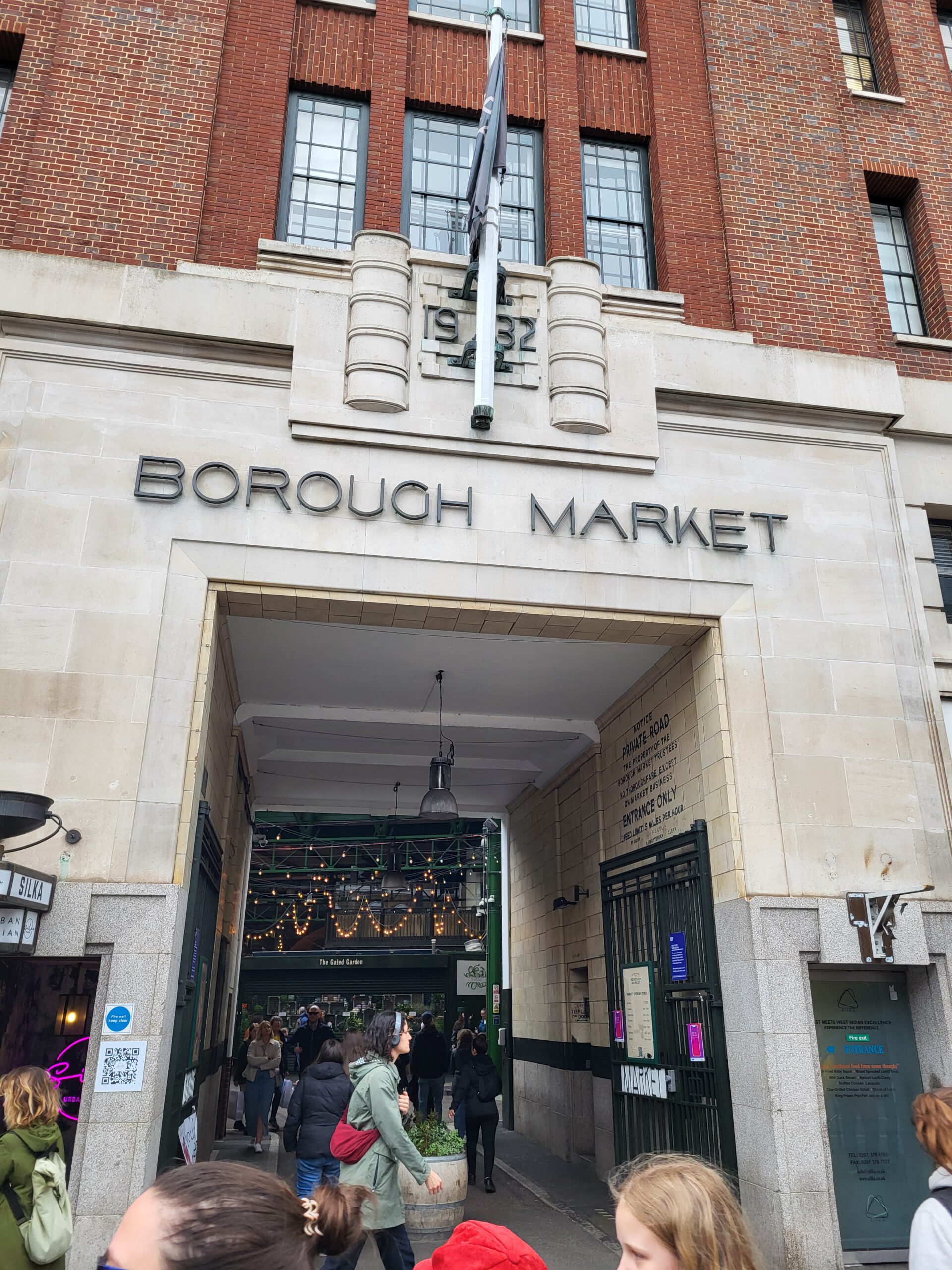 Gegen Mittag trudeln wir in London Innenstadt ein und wollen im Borough Streetmarket etwas Leckeres erbeuten. Denn es ist ja kein Feiertag und der Markt hat geöffnet. Nun ist das mit den Geheimtipps so eine Sache ... Für uns hatte der Markt eher wegen Überfüllung geschlossen. Die Massen schoben sich durch die Gänge. Vor besonders beliebten Ständen wie den auf Instagram beworbenen Schokoerdbeeren (da würde ein Becher 10 Euro kosten...) oder einem Paella-Verkauf bilden sich lange Schlangen. Diese sind so lang, dass sogar Querungen der Schlangen auf dem Boden markiert sind ... Und in irgendeinem Reiseführer, vermutlich eher für das asiatische Publikum, steht wohl auch, dass man unbedingt viele rohe Austern mitten in der Zugluft schlürfen muss. Insgesamt ein echtes Spektakel und wir sind ganz schnell wieder draußen, nachdem wir schnell ein paar Backwaren erstanden haben.