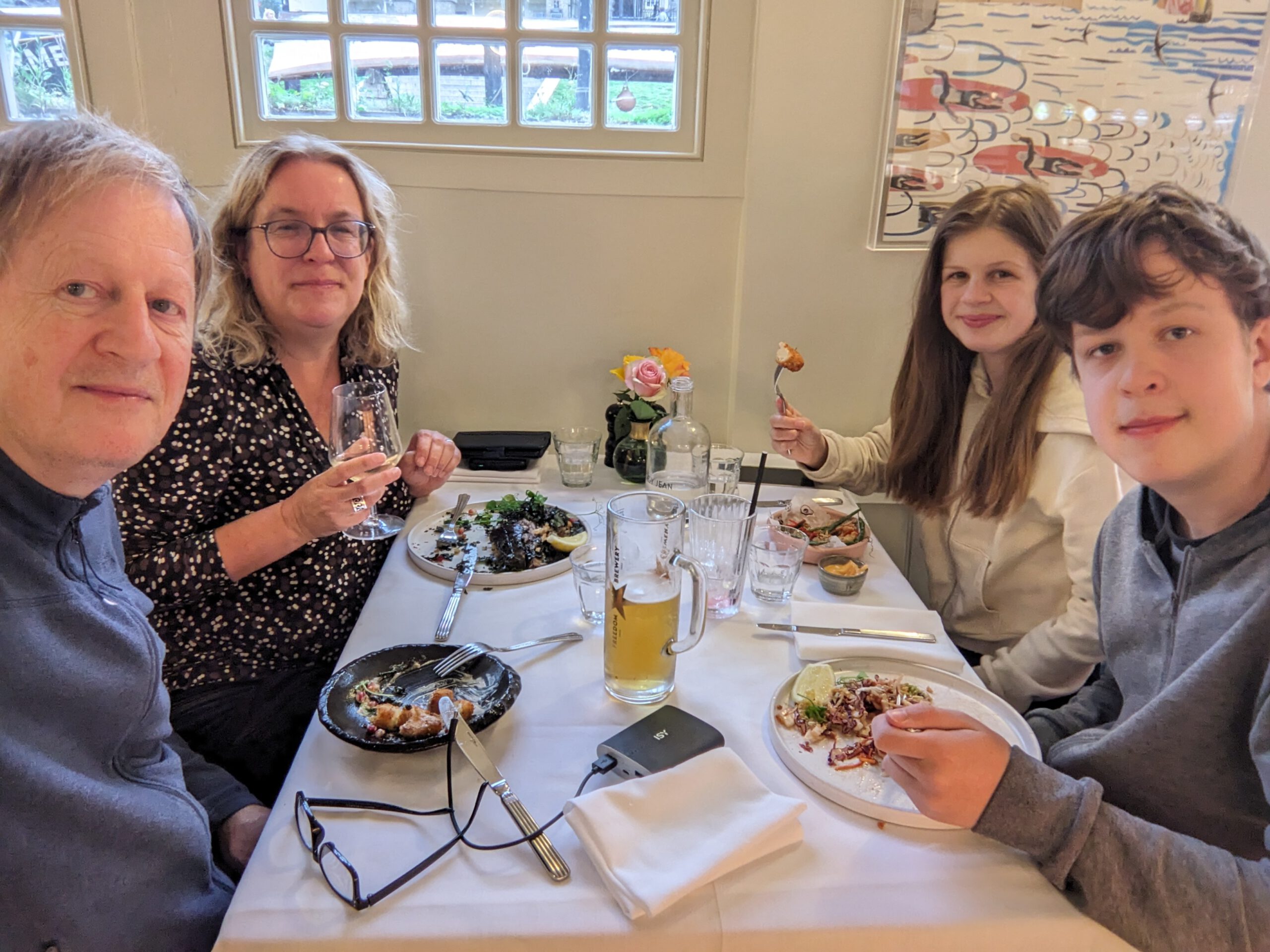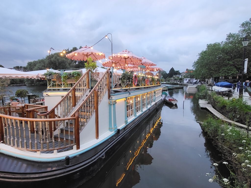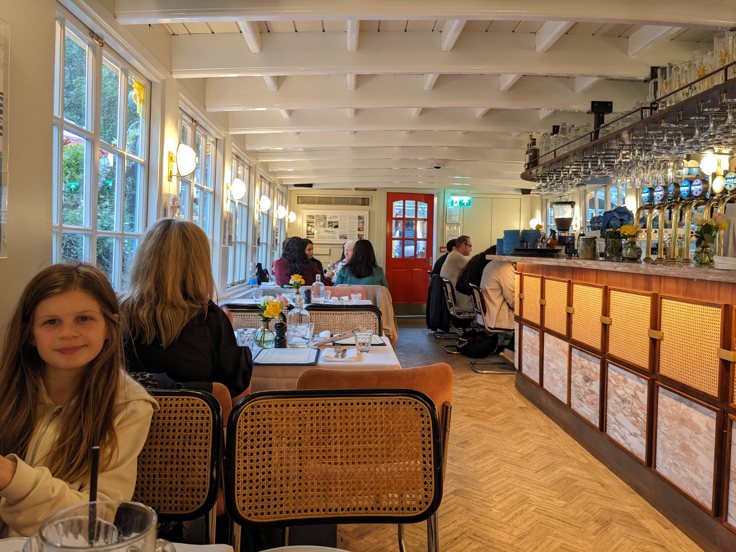 Dann verabschieden wir uns von London und zuckeln gen Richmond. Abendessen gibt es im schicken Schiffchen Peggy Jean auf der Themse, ein australisches Restaurant, das wir schon lange besuchen wollten. Die Rechnung wäre vergleichsweise bescheiden gewesen, aber der dreifache Nachtisch Affogato (Vanilleeis im Espresso) und das automatische Trinkgeld von 10 Prozent (hatten wir in den vergangenen Wochen öfter mal) knallen dann doch etwas rein. Witzig: die Kellnerin sieht eine kleine Pfütze unter dem Tisch, weil Kilians Wasserflasche im Rucksack ausgelaufen ist - und hat in Sekundenschnelle das Warnschild "Achtung, Wasser auf dem Boden" aufgestellt und einen Wischmop hervorgezaubert.