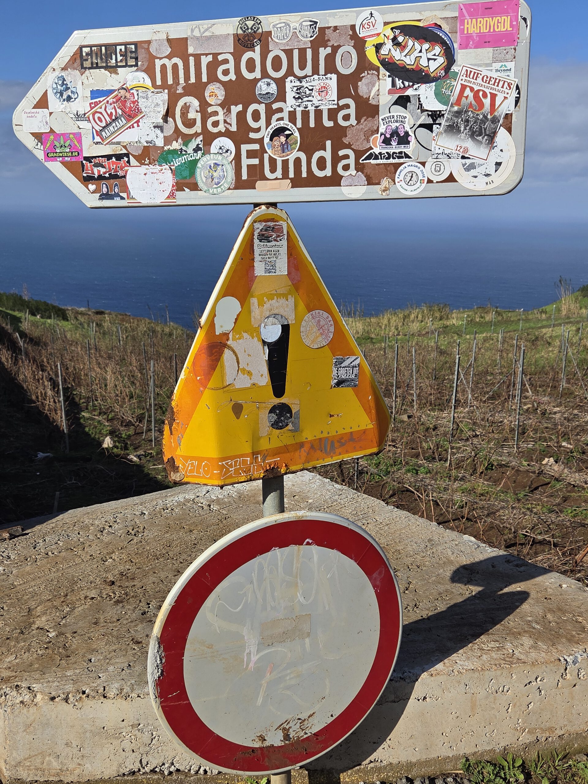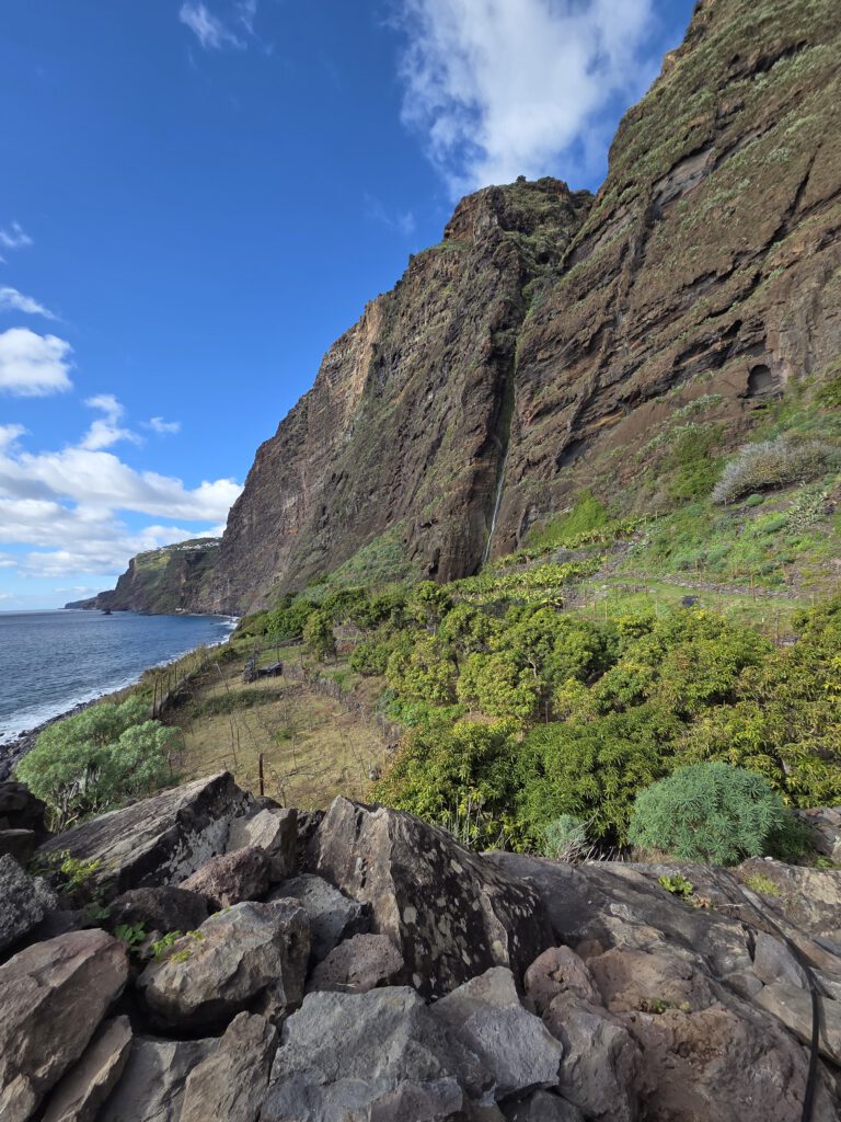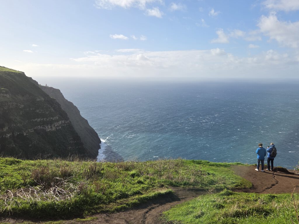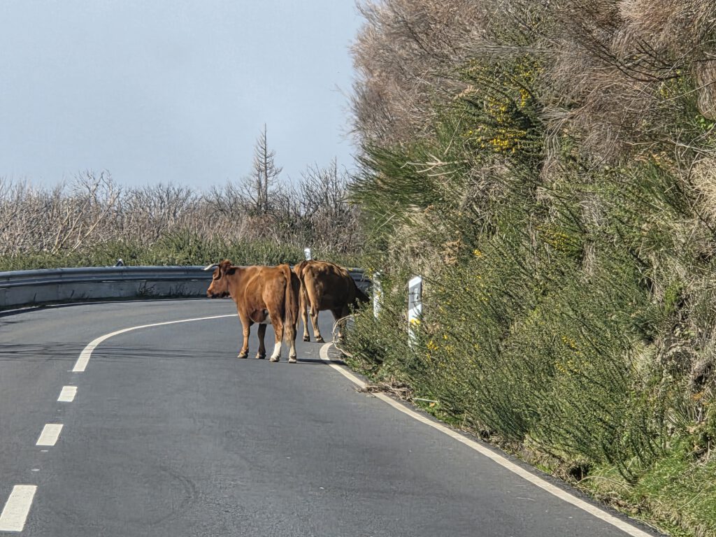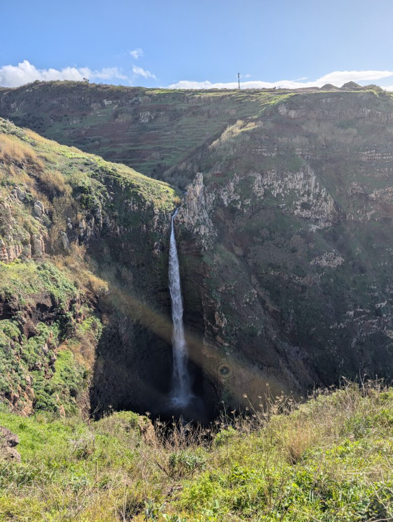 Und: Es gibt blauen Himmel! Sonnenschein! Dazu zwar eine steife Brise, aber da sind wir unkritisch. Zuerst geht es zum höchstgelegenen Leuchtturm Portugals, auf 312 Metern. Wir blicken Richtung Azoren und Kanada und bestaunen das aufgewühlte Meer. Dann, ebenfalls ohne echten Plan, nur wegen des Schildes, zum Aussichtspunkt Garganta Funda - mit 140 Metern Höhe einer der höchstgelegenen Wasserfälle der Insel. Auf dem Weg dahin wird eine Kuh geknuddelt, wir bewundern die Aussicht - langsam wird das was.