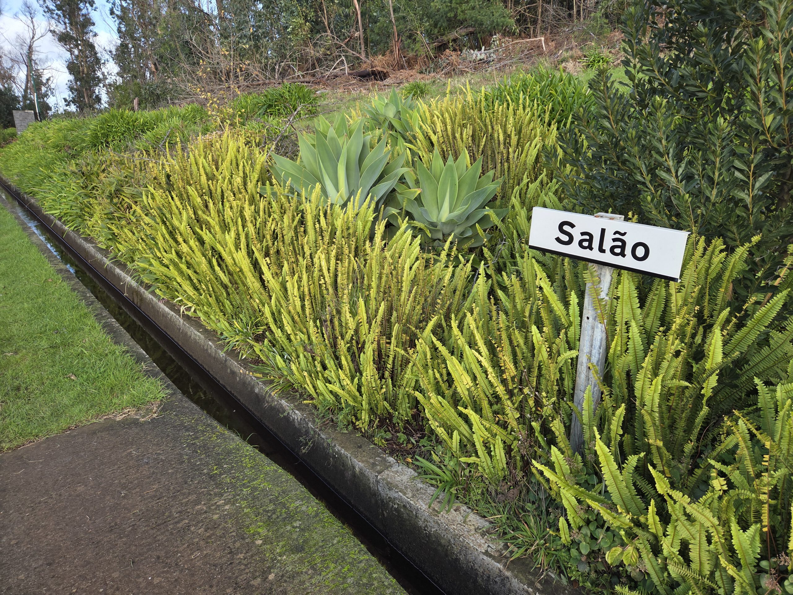 Dann geht es zu einer einfachen Levadawanderung, die komplett übe 17 Kilometer lang wäre. Aber wir ziehen einfach mal los und drehen dann wieder um - was auch nicht so schmerzt, es ist einer der blasseren Wanderungen. Trotzdem faszinierend: Der Anfang führt durch ein ehemaliges Waldbrandgebiet und mutet dank Farn und Eukalyptusbäumen sehr australisch an. Dann geht es an einem der neueren Wasserkanäle entlang - vorbei an einem kläffenden Hund, der sich wie ein aggressives Stofftier in der Tür verbeißt. Über/Unter einen störrischen Baumstamm, unterhalb einer sehr gruseligen Leine, an der Stofftiere baumeln. Der Wind ist langsam doch etwas lästig, aber wir wollen nicht klagen. Nach knapp eineinhalb Stunden drehen wir wieder um.