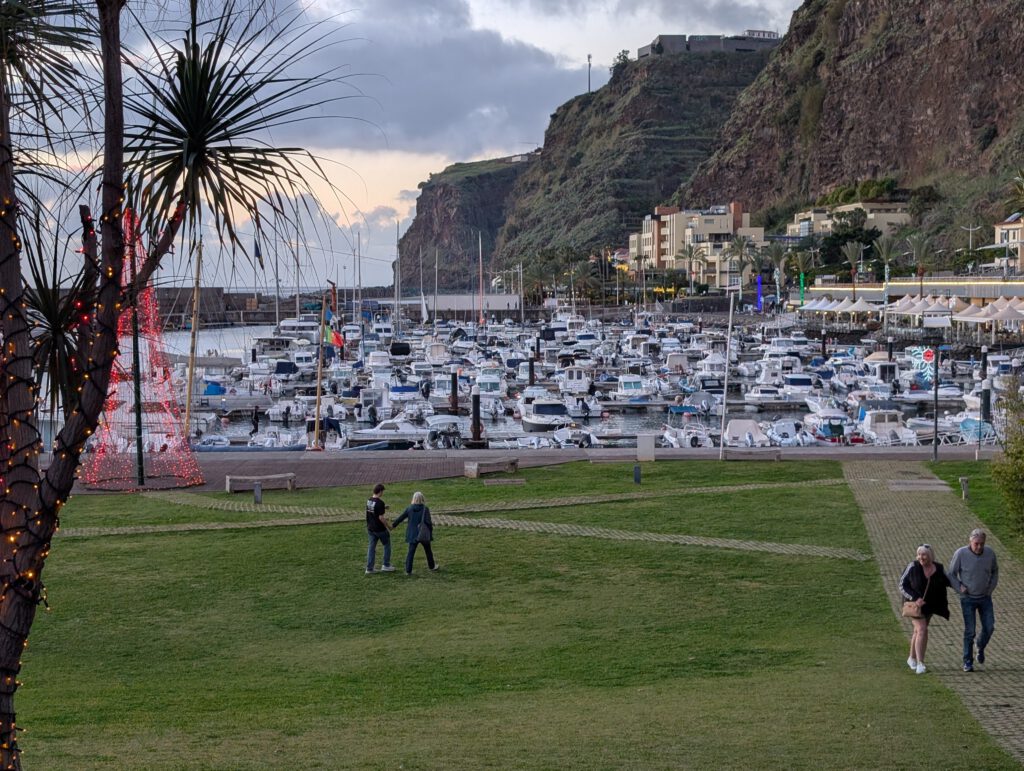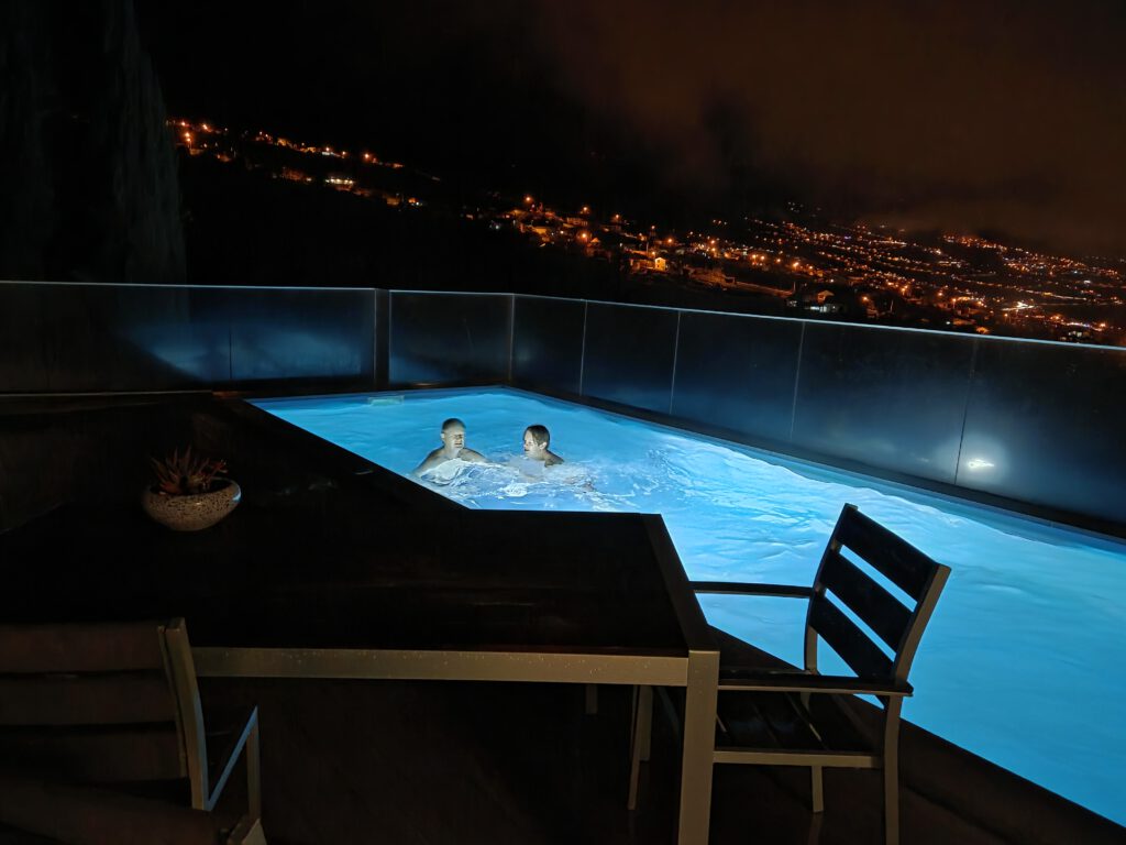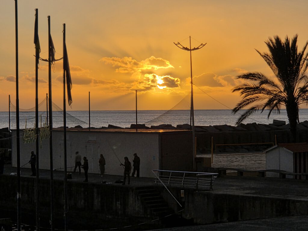 Zum Abendessen fahren wir dann durch nach Calheta, endlich ist die Küstenstraße nicht mehr gesperrt! Im Sonnenuntergang beobachten wir Schwimmer, Angler, Jogger und haben schließlich die Qual der Wahl zwischen den vielen Restaurants an der Uferpromenade. Wir landen in einem Italiener, der schließlich die bestbesuchte Einkehr im Ort ist. Immerhin 15.000 Schritte, da ist die Pizza verdient.