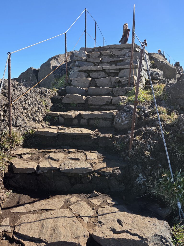 Der mit 1861 Metern höchste Berg der Insel befindet sich eineinhalb Stunden Fahrt entfernt. Aber die Wetterapp verspricht gute Sicht und so wagen wir es. Erst sieht es so aus, als wären kaum Wandererautos unterwegs. Doch dann kommen wir gar nicht bis zum Parkplatz Achado do Teixeira - die Fahrzeuge stehen schon am Straßenrand. Wir reihen uns ein und laufen schonmal ein Stück den Berg hoch. Beim Einstieg in den Weg stehen schon die Mitarbeiter der Behörde bereit, um geduldig bei der Registrierung in der neuen App, beim Buchen des Weges und der Bezahlung zu helfen. Geht dann doch recht zügig, kostet für uns vier 18 Euro (viermal 4,5 Euro) und los geht's.
