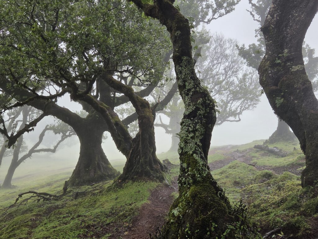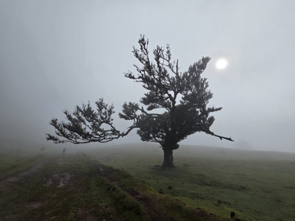 Danach steuern wir den sogenannten Nebelwald an. Diese Wanderwege gibt es schon lange, aber instagram hat für eine gewissen Popularität gesorgt. Auf der Hochebene wachsen Stinklorbeerbäume, die im meist vorhandenen Nebel für eine mystische Atmosphäre sorgen. Bei der 40 Minuten dauernden Fahrt gibt es vor allem viel Wolke. Und dann taucht ein vollgeparkter großer Parkplatz auf - das muss der Einstieg zu einer der beliebtesten Wanderungen der Insel sein, zu den 25 Quellen. Aber wir zuckeln im Nebel weiter, vorbei am offiziellen Einstieg in die Länge Wanderung - viele Autos - bis zum Start in die kleine Runde am Forsthaus. Auch hier viele Autos und der Nebel ist wirklich dicht.
