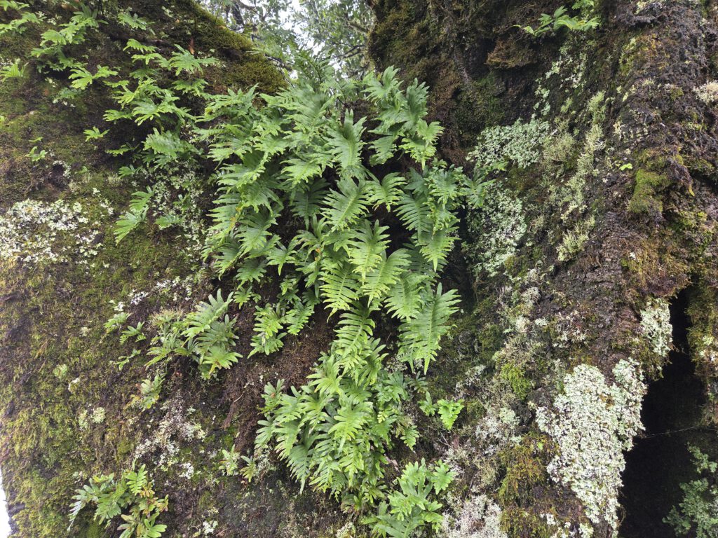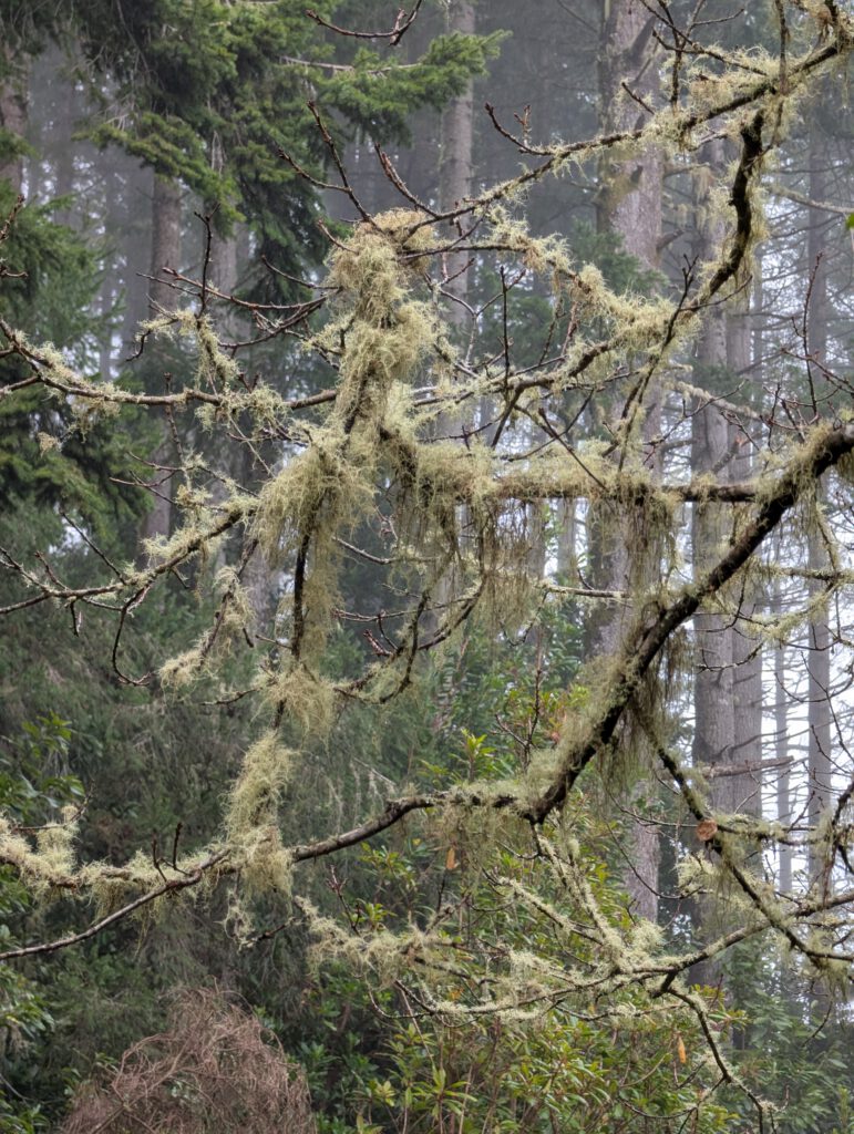 Am Anfang sind noch heitere Grüppchen unterwegs, immer wieder rutschen Wanderer im tiefen Matsch aus und landen im Schlamm. Wir schaffen es irgendwie, das zu vermeiden, auch wenn die Hosenbeine von Louisa und Nicole danach auch Spuren des Weges tragen. Aber dann wird es ruhiger, der Nebel bleibt dicht. Aber die Atmosphäre ist großartig und wir fotografieren sehr viele alte, knorrzige Bäume im Dunst. Wunderschöne Flechten hängen an den Ästen, Farne haben sich angesiedelt. Das gefällt uns sehr gut und hier gehört das Wetter ja ausnahmsweise auch mal hin. Gezahlt haben wir übrigens nix, gab ja keine Tafel mit QR-Code ... Aber alle Wege drumrum kosten natürlich.