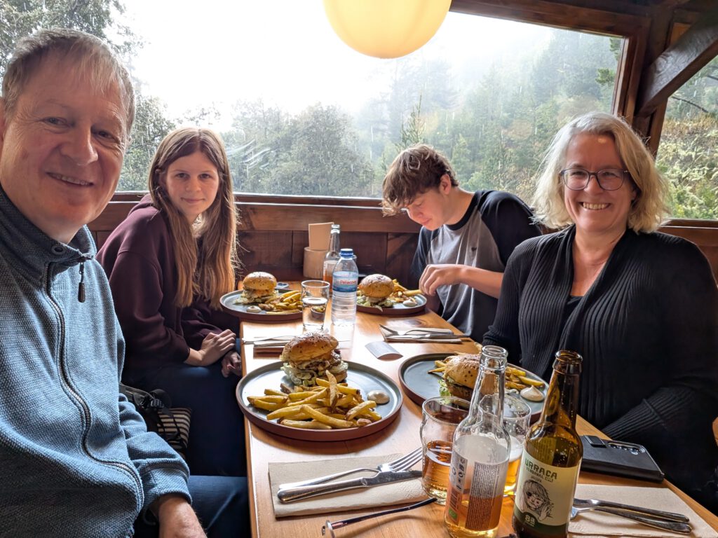 Was nun? Mit dem Mietwagen in den Innenstadt muss nicht sein. Gerald würde gerne einen Berg hoch, Nicole erinnert sich, dass ihr mal das "Forest Café" vorgeschlagen wurde, das liegt noch oberhalb vom Stadtteilt Monte. Viele Regenbogen begleiten uns auf dem Weg, jeder wird inzwischen frenetisch gefeiert. Das Navigationssystem Nicole hat wieder Tücken, Kilian nimmt sich vergnügt die Kopfhörer aus dem Ohr, "diese Comedy will ich doch nicht verpassen". Und es geht steile Wege nach oben, erst war es trocken, dann nieselt es, schließlich Graupel. Wir witzeln schon, ob es da wirklich ein Café gibt - aber tatsächlich. Im strömenden kühlen Regen bei 6 Grad wartet auf uns eine gemütliche Holzhütte mit leckeren Burgern.