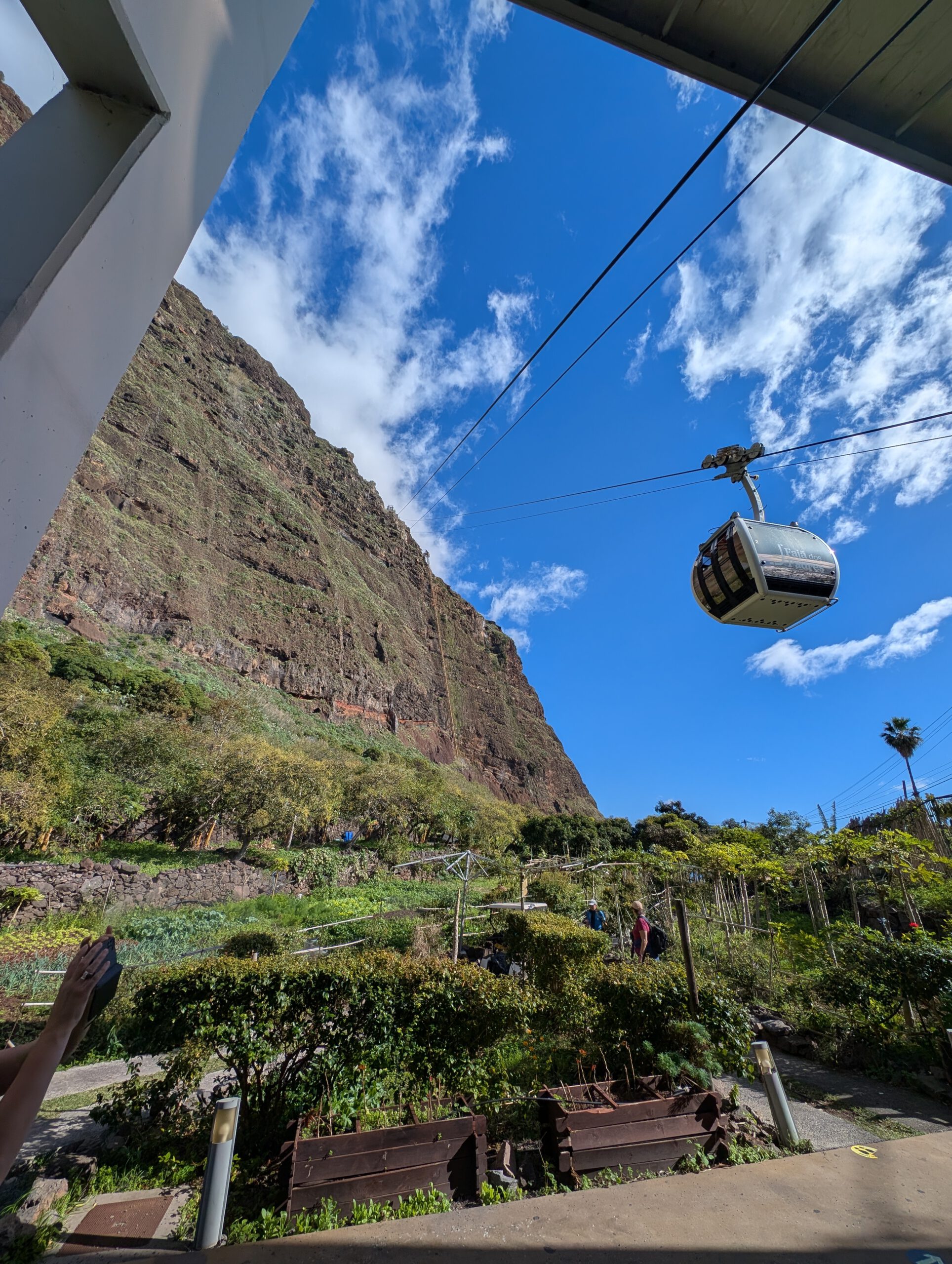 Dazu müssen wir wieder 30 Minuten an der Küste entlang Richtung Funchal fahren. Dann gibt es eine kleine, sehr steile Seilbahn an der Küste, die zu Faja dos Padros führt. Aber die Reiseleitung führt erstmal ein ausführliches Gespräch - natürlich wurde das alles am Vormittag digital gebucht, aber die Mailbestätigung kam irgendwie nicht. Wie gut, dass Nicole sich angewöhnt hat, sich selbst stets einen Screenshot zu schicken. Die Fachfrau ist erstaunt, dass wir etwas gebucht haben, schließlich ist sie ja für die Führungen zuständig. Aber irgendwo findet sich dann die Buchung und wir bekommen sogar eine exklusive Führung nur für uns vier. Allerdings dauert die Vorbereitung noch ein paar Minuten, da sie noch ein paar Früchte sammeln muss.