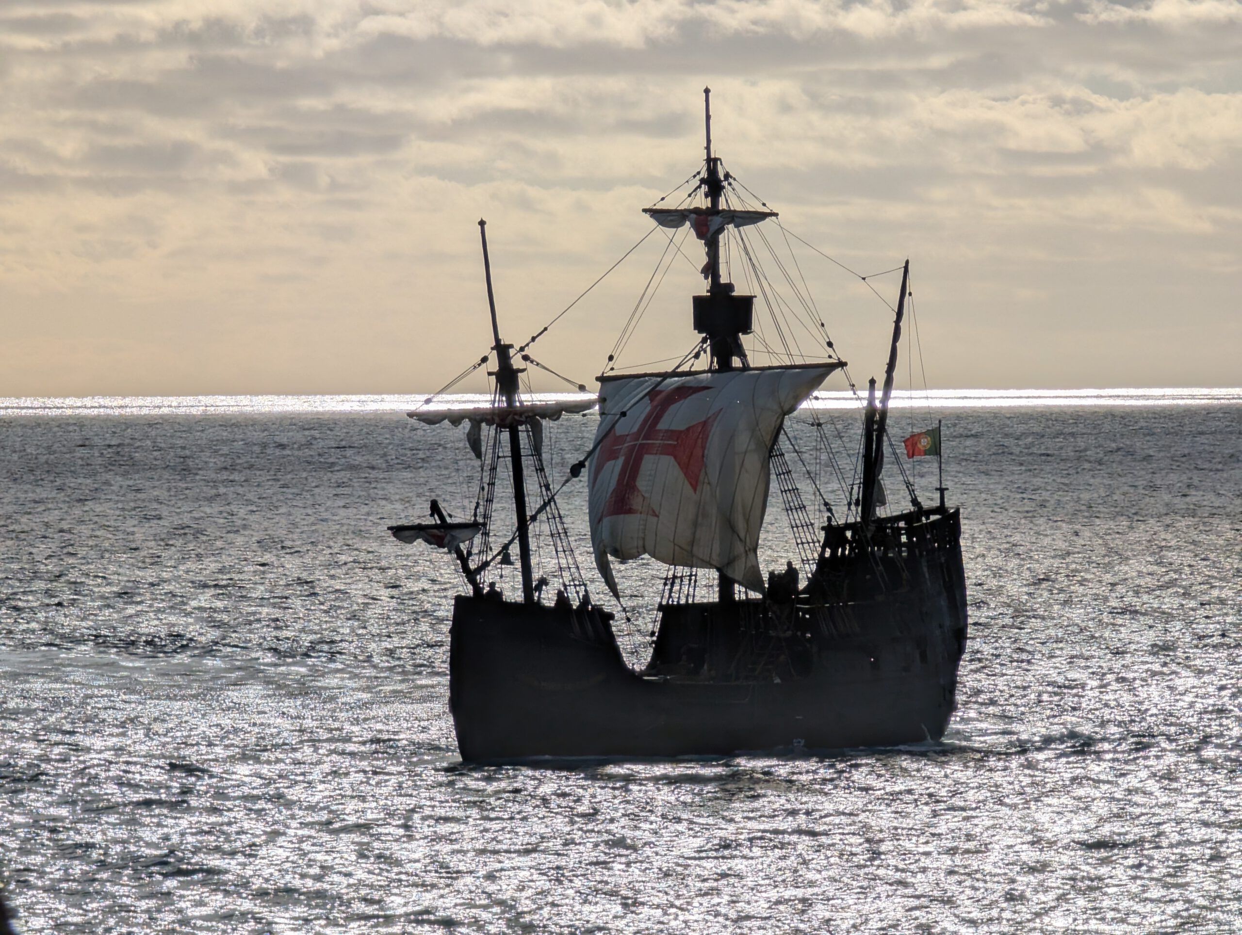 Nach der Führung sitzen wir noch eine Weile am Meer, trinken Kaffee, essen Bananenbrot und noch mehr Eis. Auf dem Wasser ist das Piratenschiff unterwegs, das wir schon in Funchal gesichtet hatten. Dann geht es mit dem Aufzug wieder nach oben. Ein kleiner Einkauf im Supermarkt und wir essen Zuhause. Heute muss nichteinmal mehr die Klimaanlage zum Heizen laufen ...
