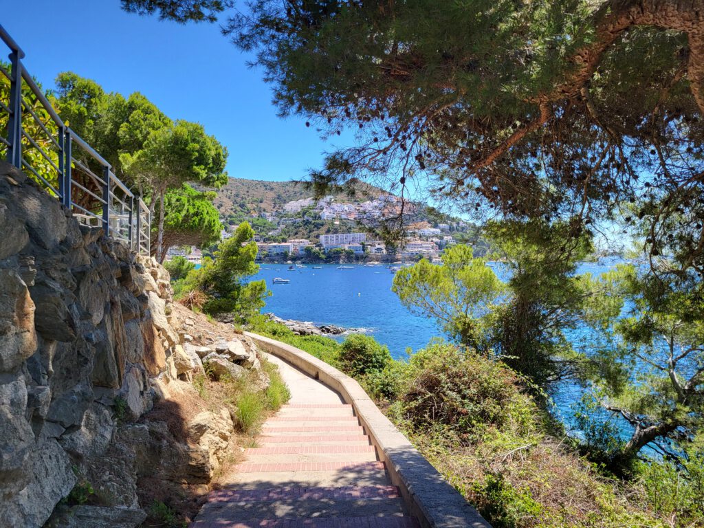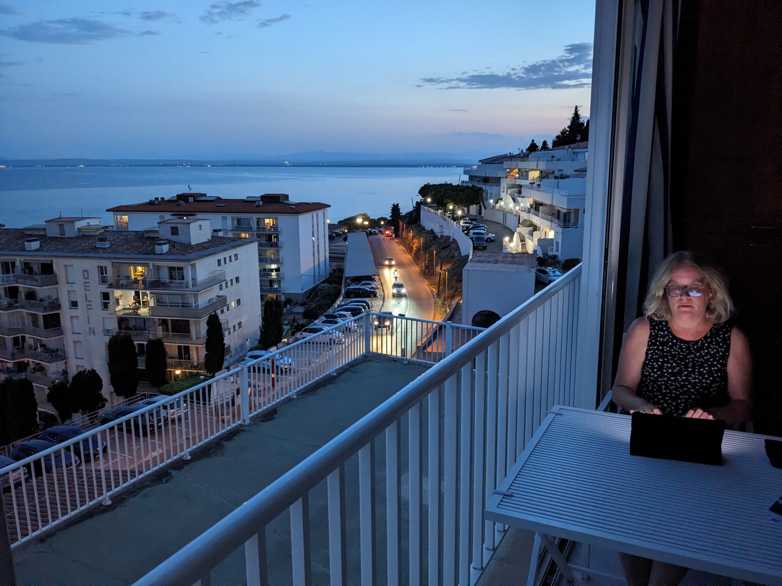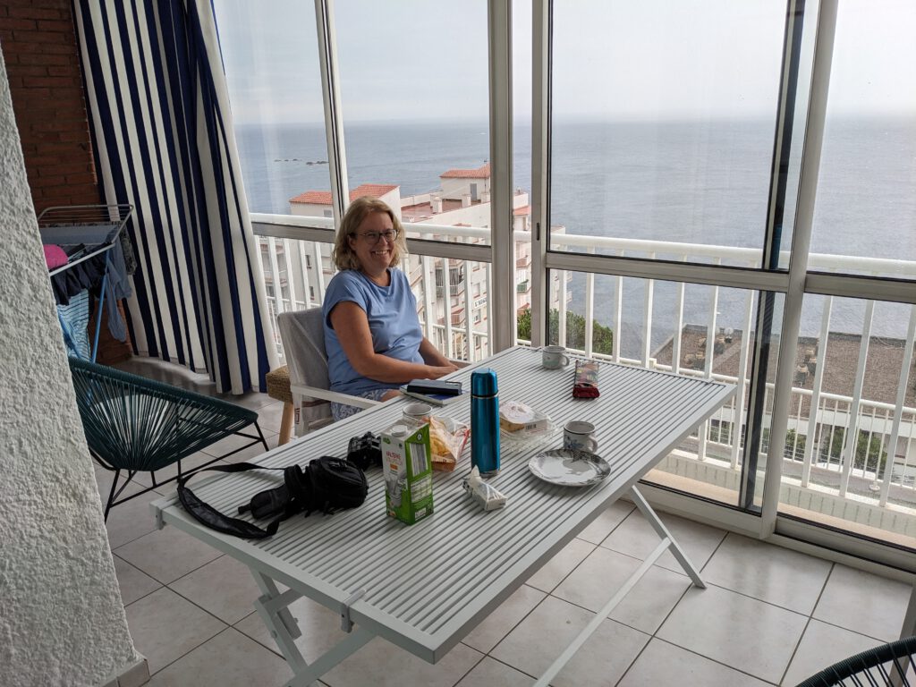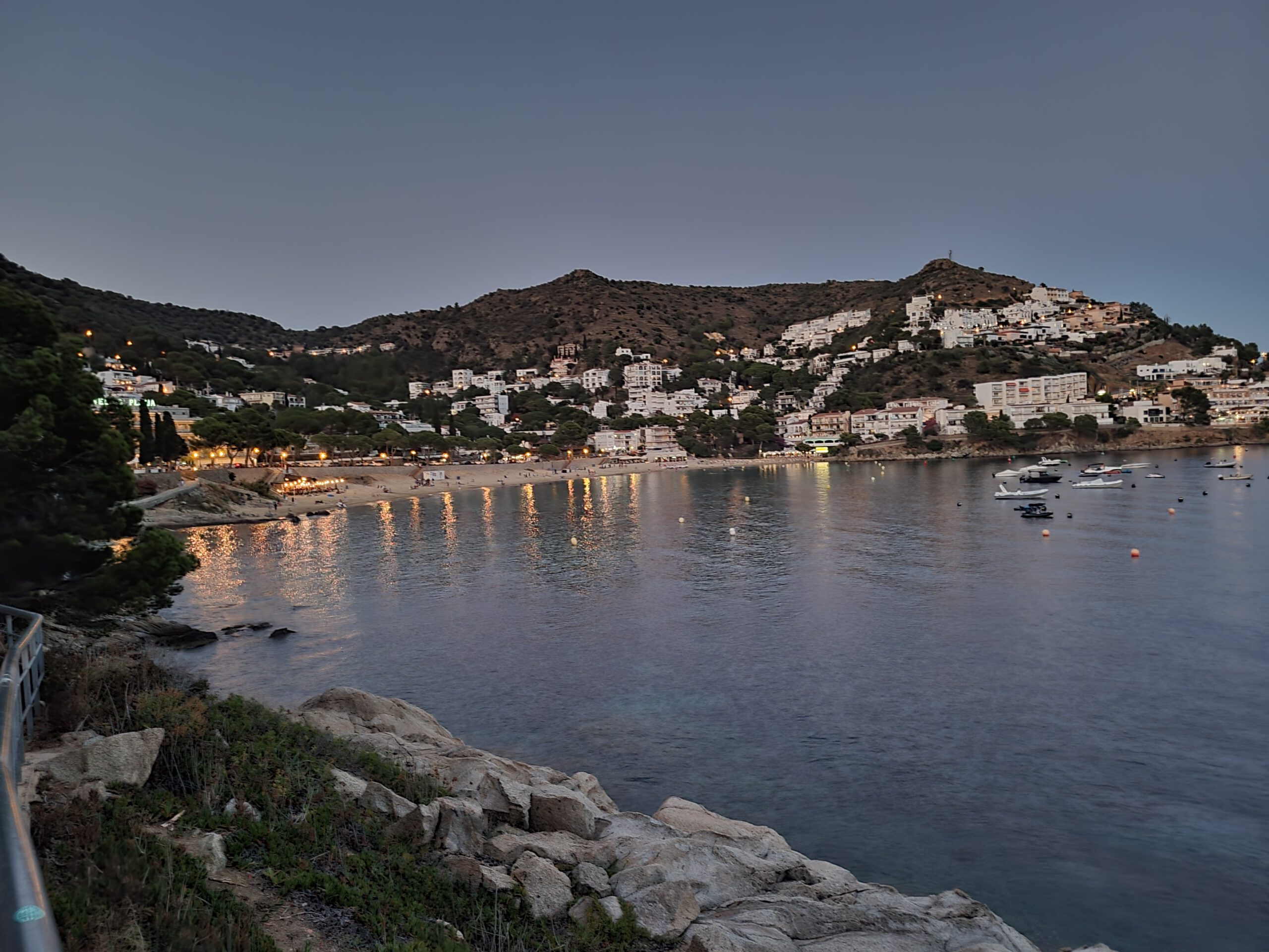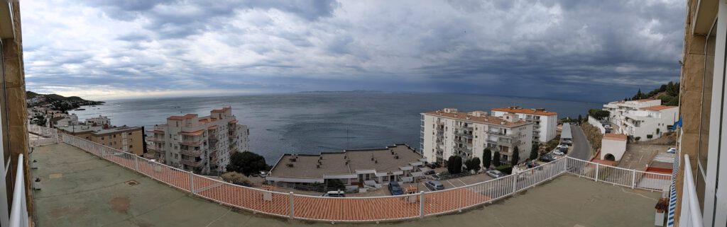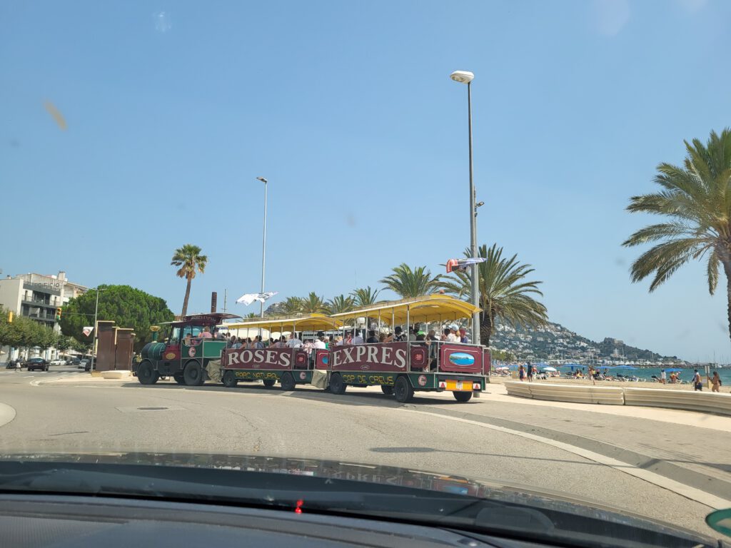 Schließlich packen wir das Auto und sind pünktlich um 16 Uhr in der Agentur, um den Schlüssel abzuholen. Und einen Berg Bett-Wäsche und Handtücher, den man extra buchen musste. Wir zuckeln im Stau durch Roses. Hurra Touristentrubel! Zwar ist die Costa Brava tatsächlich nur eine Stunde von Garroxta entfernt, aber die beiden Regionen sind unterschiedliche Welten. Die Vegetation ändert sich auf der Strecke, die Straße werden breite Betonpisten für die Touristen. In Roses kreuzt das erste Touristenbähnchen unseren Weg. Wir zweifeln. Der Blick auf die Gastronomie am Straßenrand macht es nicht besser. Doch dann müssten wir die schlimmste Zone verlassen und wohnen etwas außerhalb. Die Ferienwohnung selbst ist zwar nicht halb so geräumig, wie die vorher, punktet aber mit einem großen Balkon und Blick aufs Meer.
