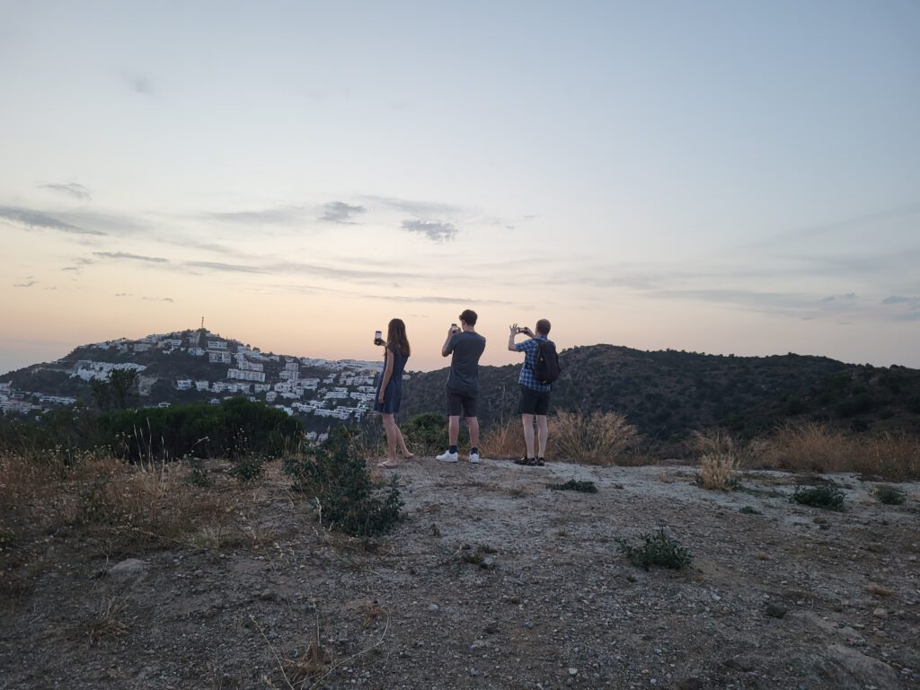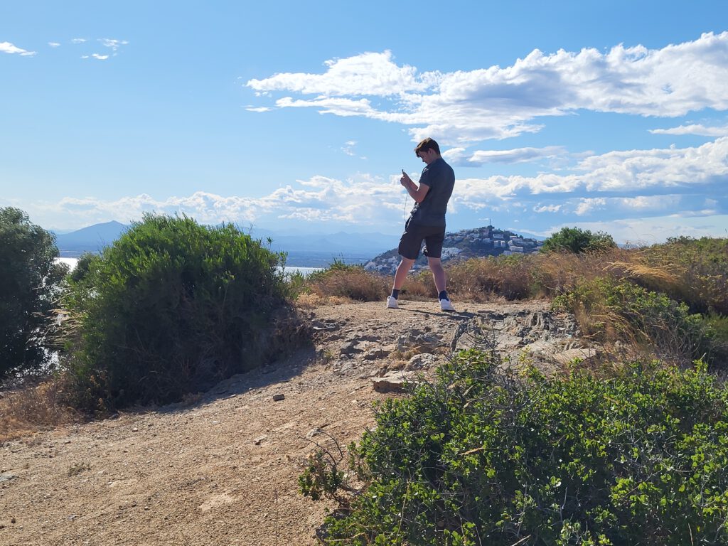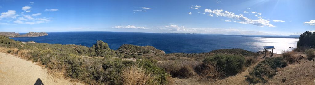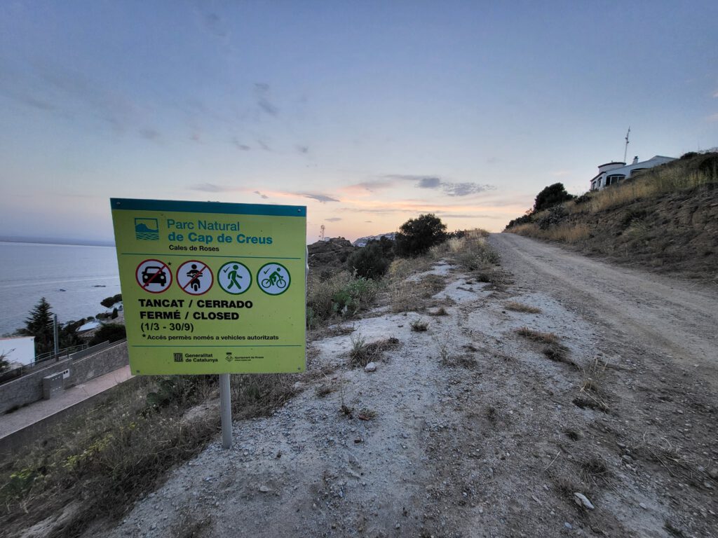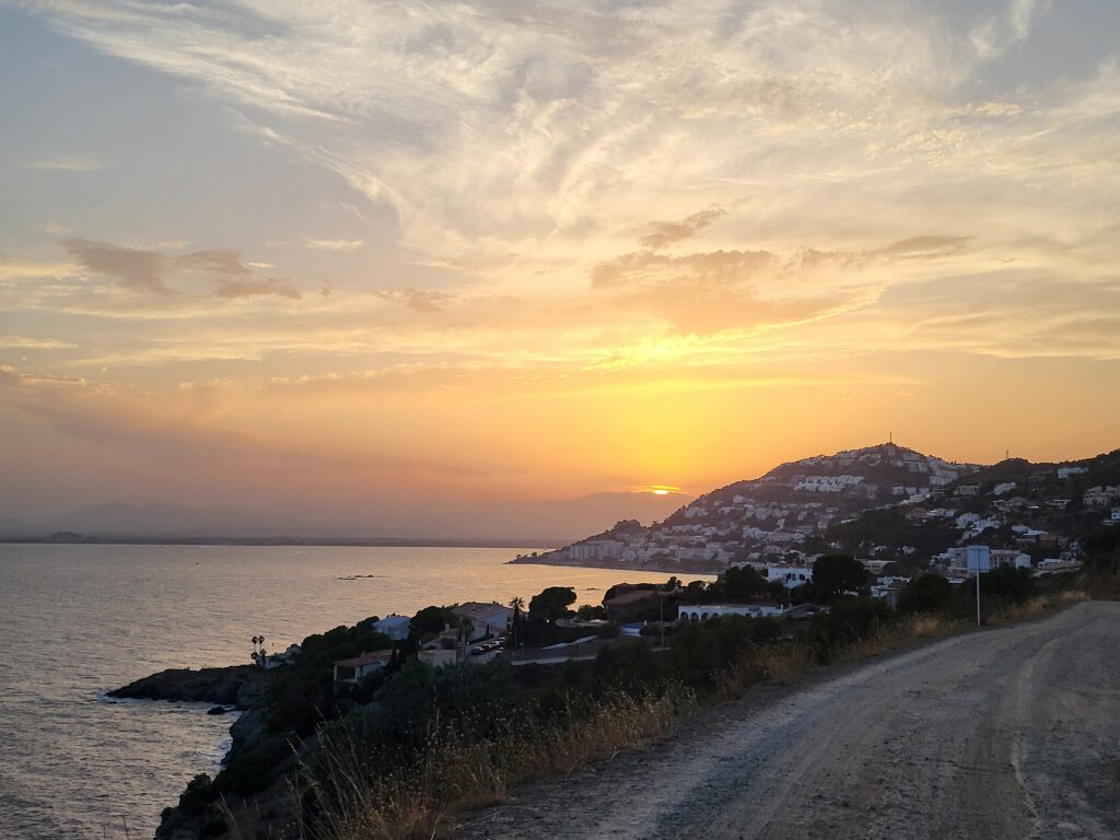 Also verbringen wir den Samstag im Schatten, heruntergekühlt und chillen. Was drei von vier überhaupt nicht stört, denn so viel Ruhe war selten. Die Reiseleitung schmollt und schlürft kannenweise Kamillentee. Abendessen wird gekocht, danach wollen wir eigentlich noch zum Sonnenuntergang auf einen Berg. Aber unser alter Kumpel Google Maps hat uns Mal wieder auf eine Route gelockt, die von einer Schranke gesperrt ist. Och neeee. Wir sehen um die Kurve noch, wie die Sonne in den Wolken versinkt. Danach nehmen wir eine andere Route, so weit wie es geht, und laufen etwas über die Wege, die schon zum Nationalpark Cap Creus gehören. Laute Zikaden und eine wunderschöne Sicht auf den Strand von Almadrava. Und morgen soll es zehn Grad weniger haben, regnen und stürmen. Wir sind gespannt.