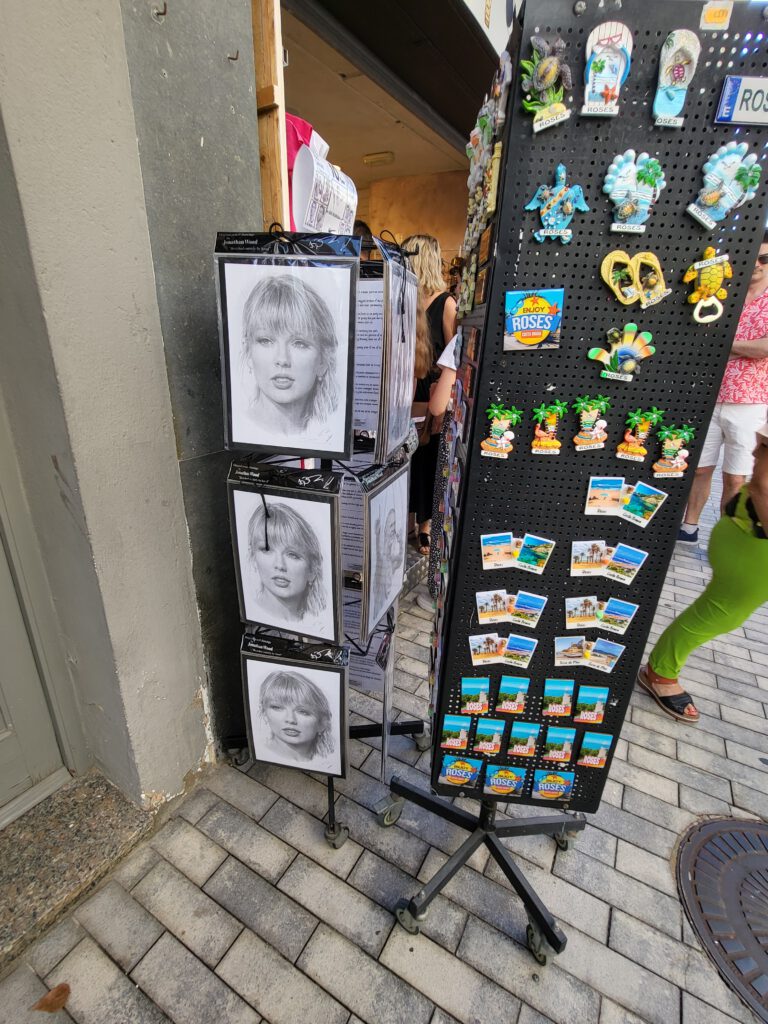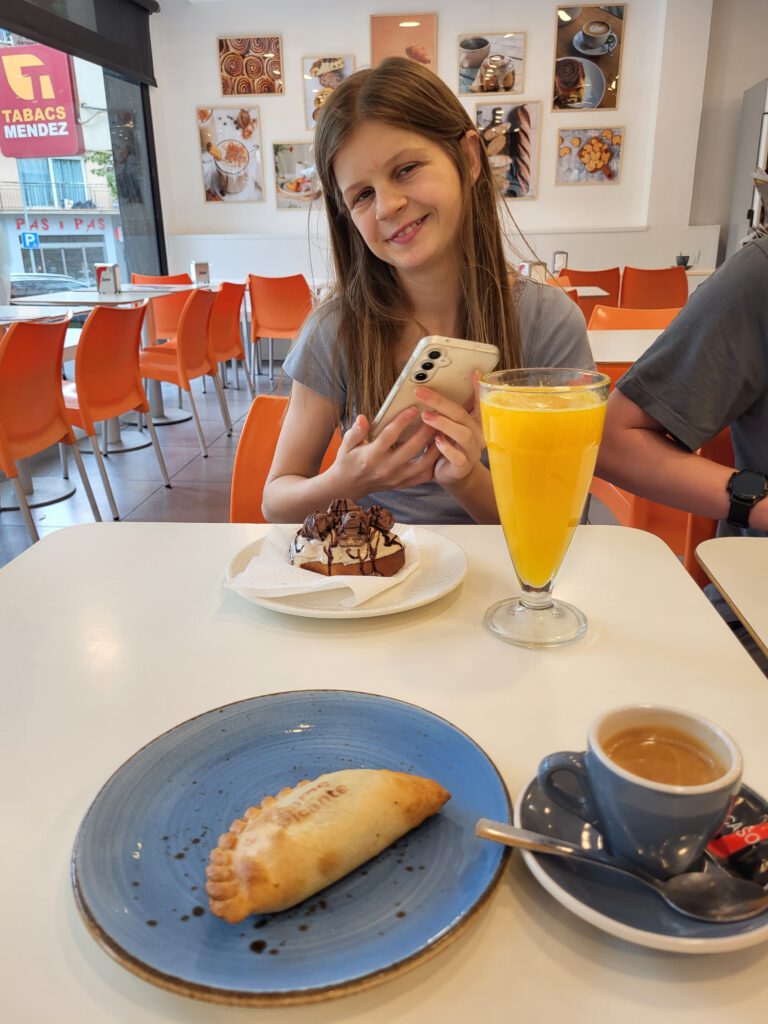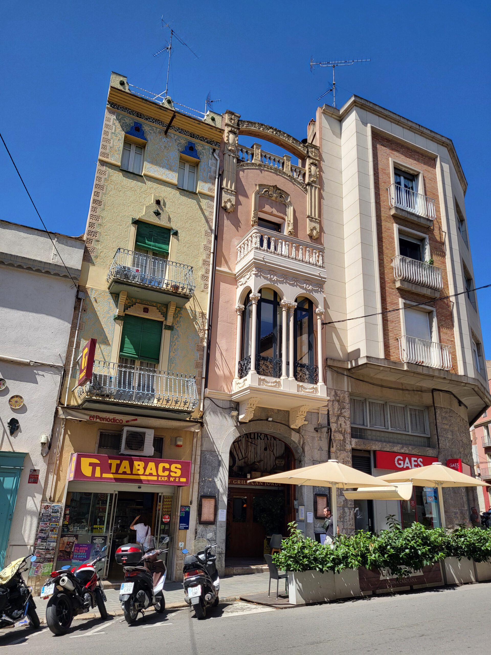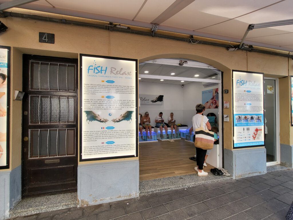 Gegen 14 Uhr ist es wieder trocken und wir ziehen los. Erstmal nach Roses, denn der Kühlschrank ist einigermaßen leer, der Magen auch. Bis wir tatsächlich leicht außerhalb einen Parkplatz gefunden haben und im Ort sind, ist es 15 Uhr. Also gibt es einen Imbiss in einer Bäckerei, mit frisch gepresstem Orangensaft, Kaffee, Gebäck, was insgesamt sehr günstig und dennoch lecker ist. Danach streifen wir durch Roses und suchen die Altstadt. Enge Gassen, nicht unbedingt alt. Zahlreiche Geschäfte, darunter viel Nippes, Taylor-Swift-Devotionalien, Fisch-Spas (in denen arme ausgehungerte Flossenträger Menschen die Hornhaut vom Zeh knabbern), Billigkleidung und Markenklamotten. Restaurants und Kneipen mit bunten, mehrsprachigen Speisekarten. Und wir finden tatsächlich drei, vier Häuser aus dem Jugendstil. Zählt das schon als Altstadt?