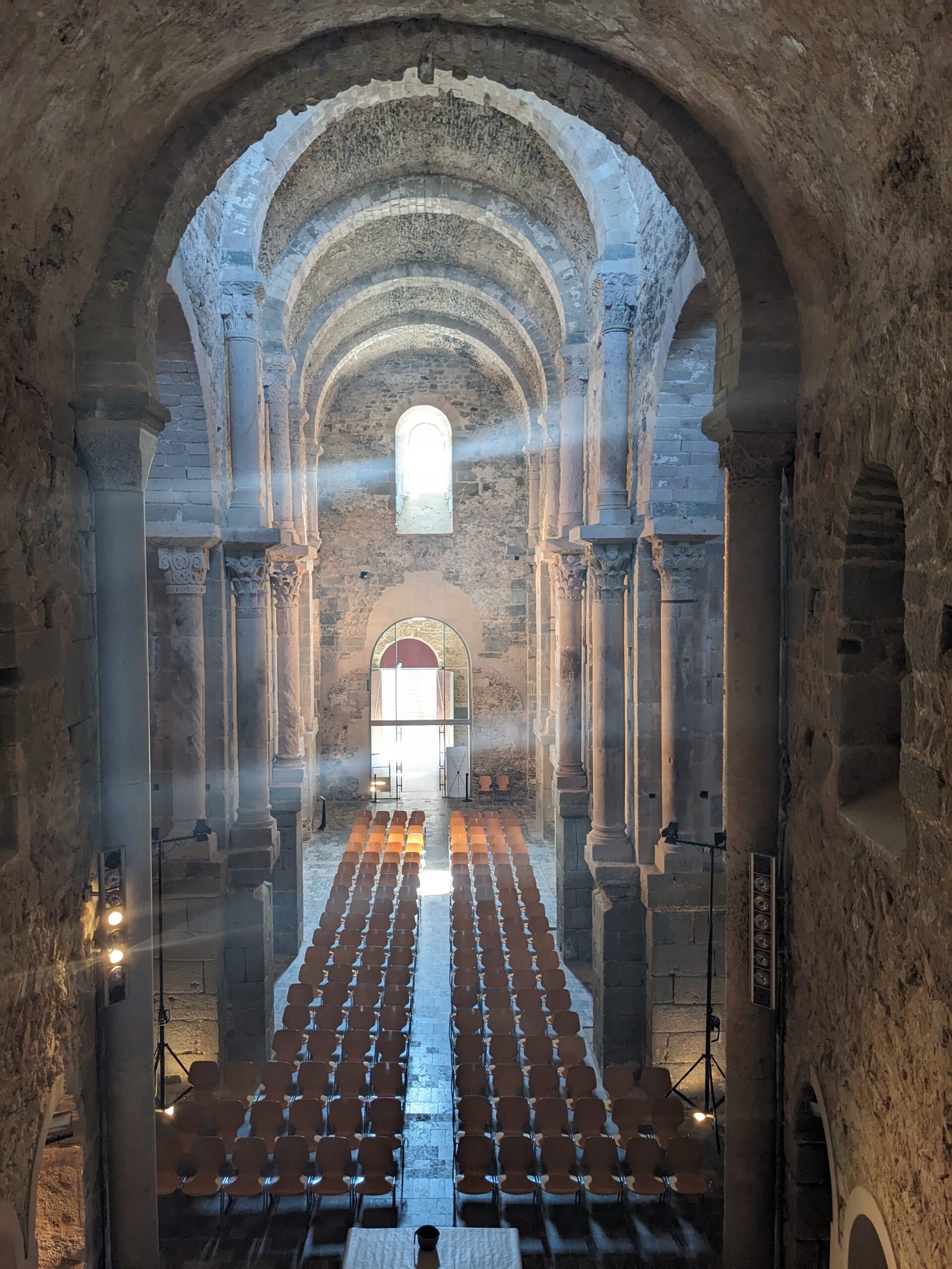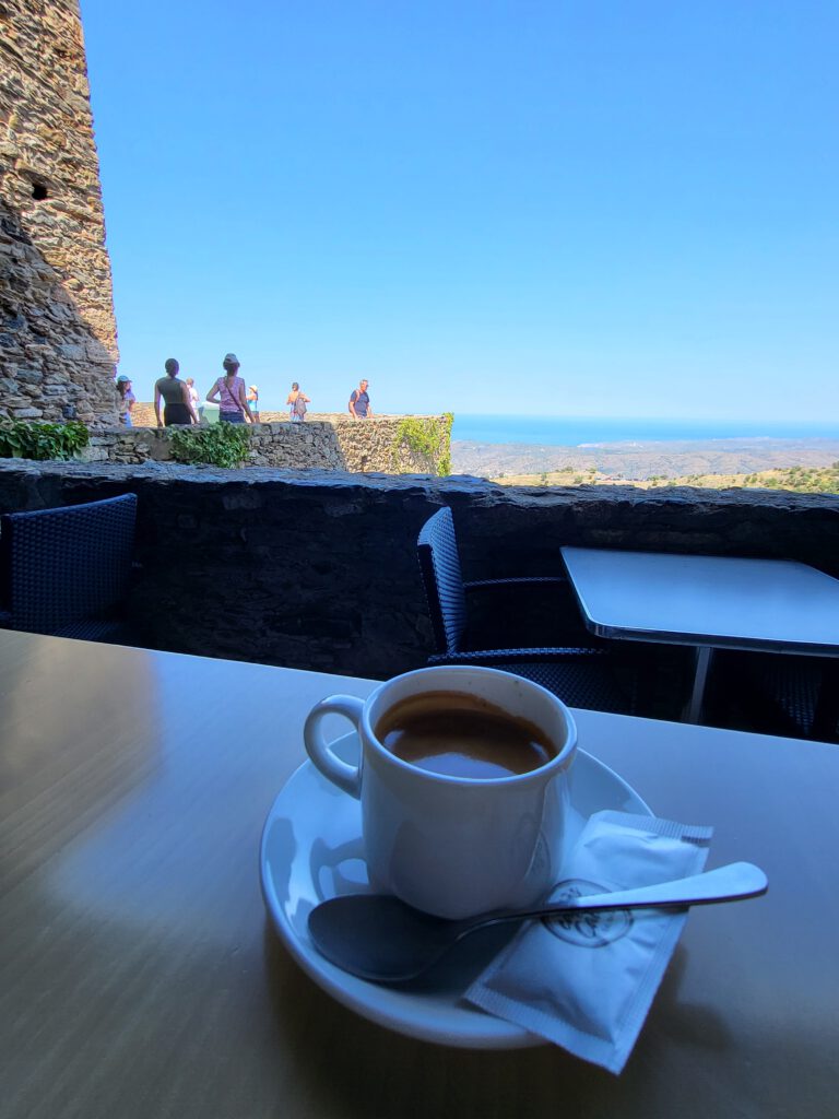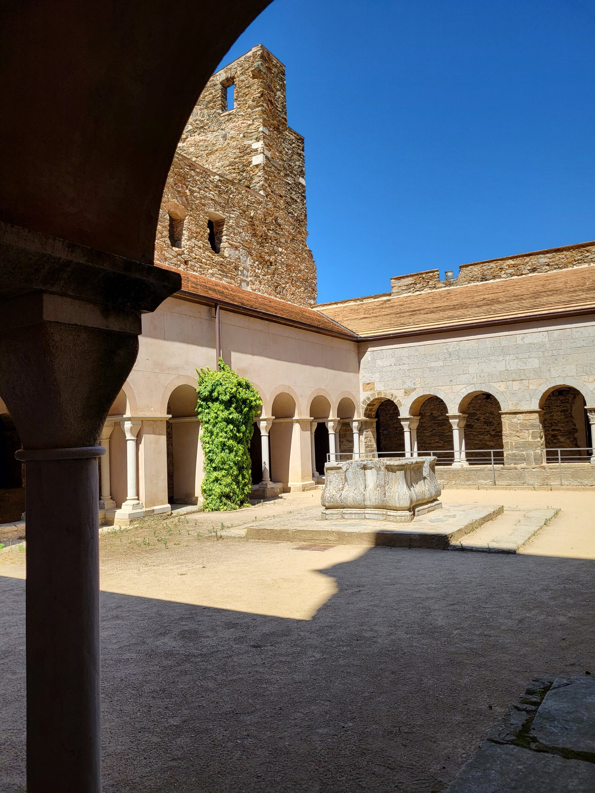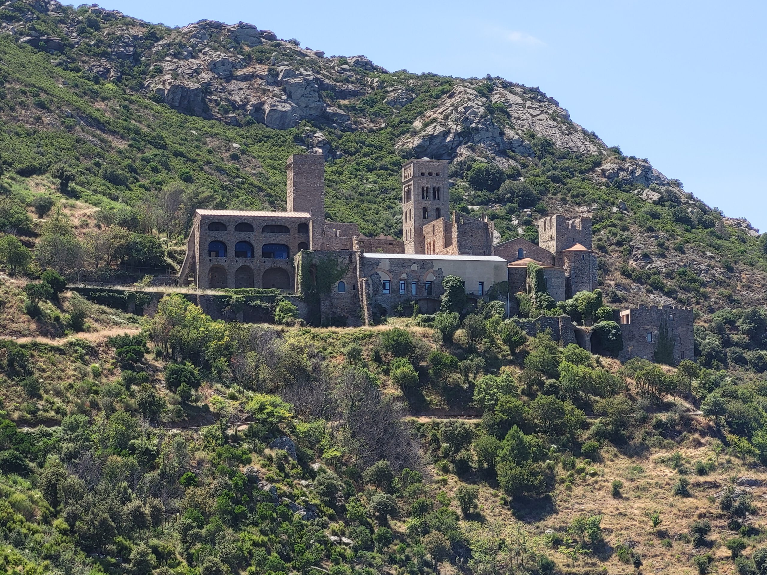 Die Nacht im Apartment war heiß, diesmal braucht Gerald etwas Auszeit. Aber gegen 14 Uhr ziehen wir los, das Auto ist ja klimatisiert. Über 30 Minuten benötigen wir zum ehemaligen Benediktinerkloster San Pere de Rodes, das quasi auf der anderen Seite der Berge Richtung Frankreich liegt. Und das Kloster überrascht: Ein sehr günstiger Eintritt. Ein ausgesprochen gut gemachter Audio-Guide, mit genau der richtigen Dosis an Informationen. Und ein sehr großes Klostergelände, in dem wir uns lange verweilen. Die Hügel wurden übrigens früher für Weinbau genutzt, doch dann kam die Reblaus. Jetzt gibt es weder Bäume, noch Weinstöcke. Auch sehr schön: Es sollten immer so viele Mönche, wie Apostel dort leben, also 12 (leider fehlten die Infos über die vermutlich 100 anderen Menschen, die zu Diensten waren). Und die hatten gemäß ihrer Fähigkeiten eigene Aufgaben, wie der Bodega-Mönch (zuständig für den Weinbau...) oder der Kranken-Mönch. Im Klosterrestaurant noch ein kleiner, starker Kaffee - herrlich.