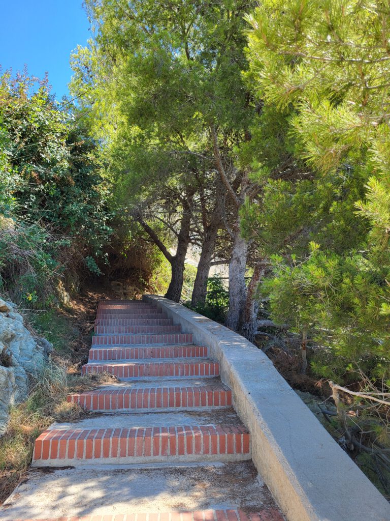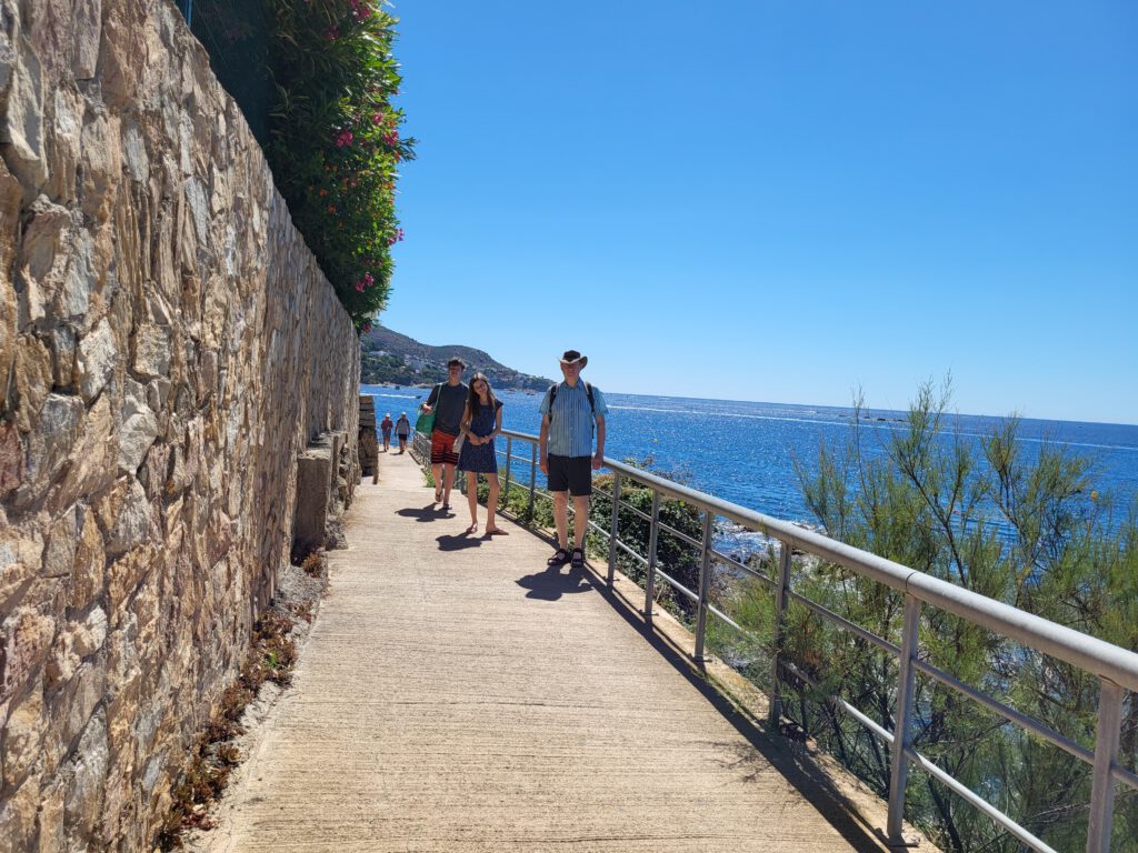 Der Teenager als solcher ist eine träge Masse. Vor allem, wenn wir es selten vor Mitternacht ins Bett schaffen. Und so hat es heute bis 11.40 gedauert, bis wir vier das Haus gen Strand verlassen konnten. Der Nachwuchs wundert sich, es ist ja so heiß .... Atemübungen benötigt man nicht nur bei der Geburt, sondern auch später. In jedem Fall hat Gerald einen Fußweg zum kleinen, am Abend vorher so idyllisch menschenleeren Strand Canyelles Petites entdeckt. Die Treppen sind teilweise abenteuerlich. Danach geht es am türkisblauen Meer entlang, mal im Schatten, mal in der um diese Uhrzeit sehr prallen Sonne. Agaven, Kakteen, Bougainvillea blühen, gelegentlich säumen Pinien den Weg. Was an der Straße nur 1000 Meter wären, dauert am Meer eine Weile. Dann kommt der Strand in den Blick - also das, was man von ihm noch sehen kann. So viele Menschen! So unglaublich viele Menschen!
