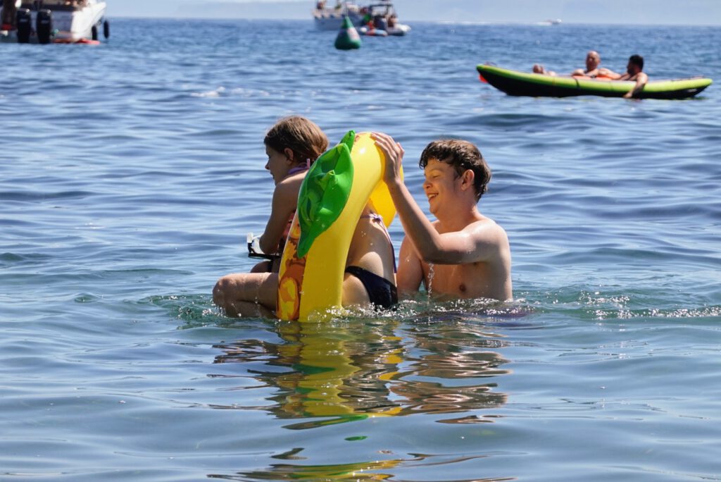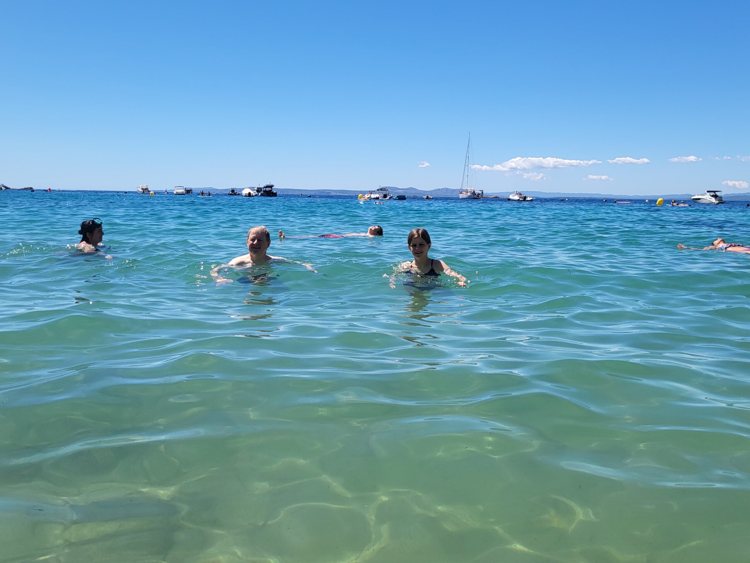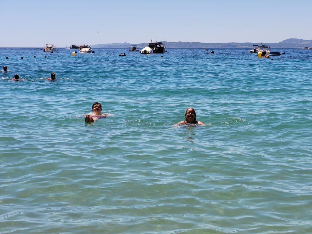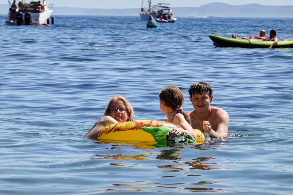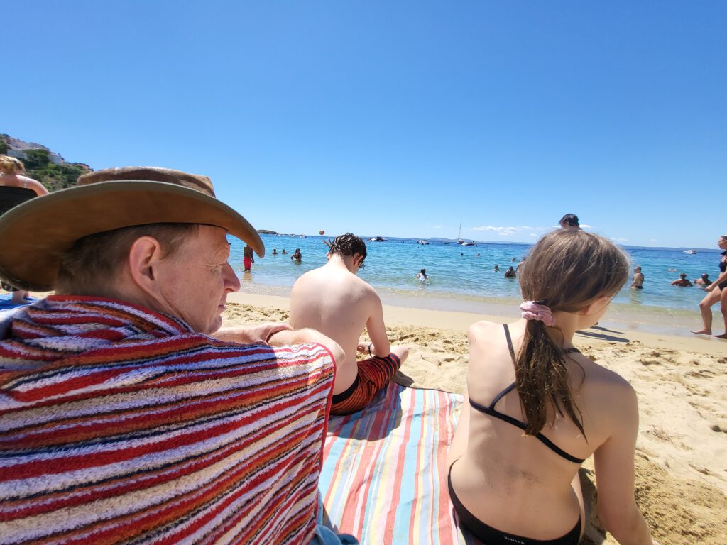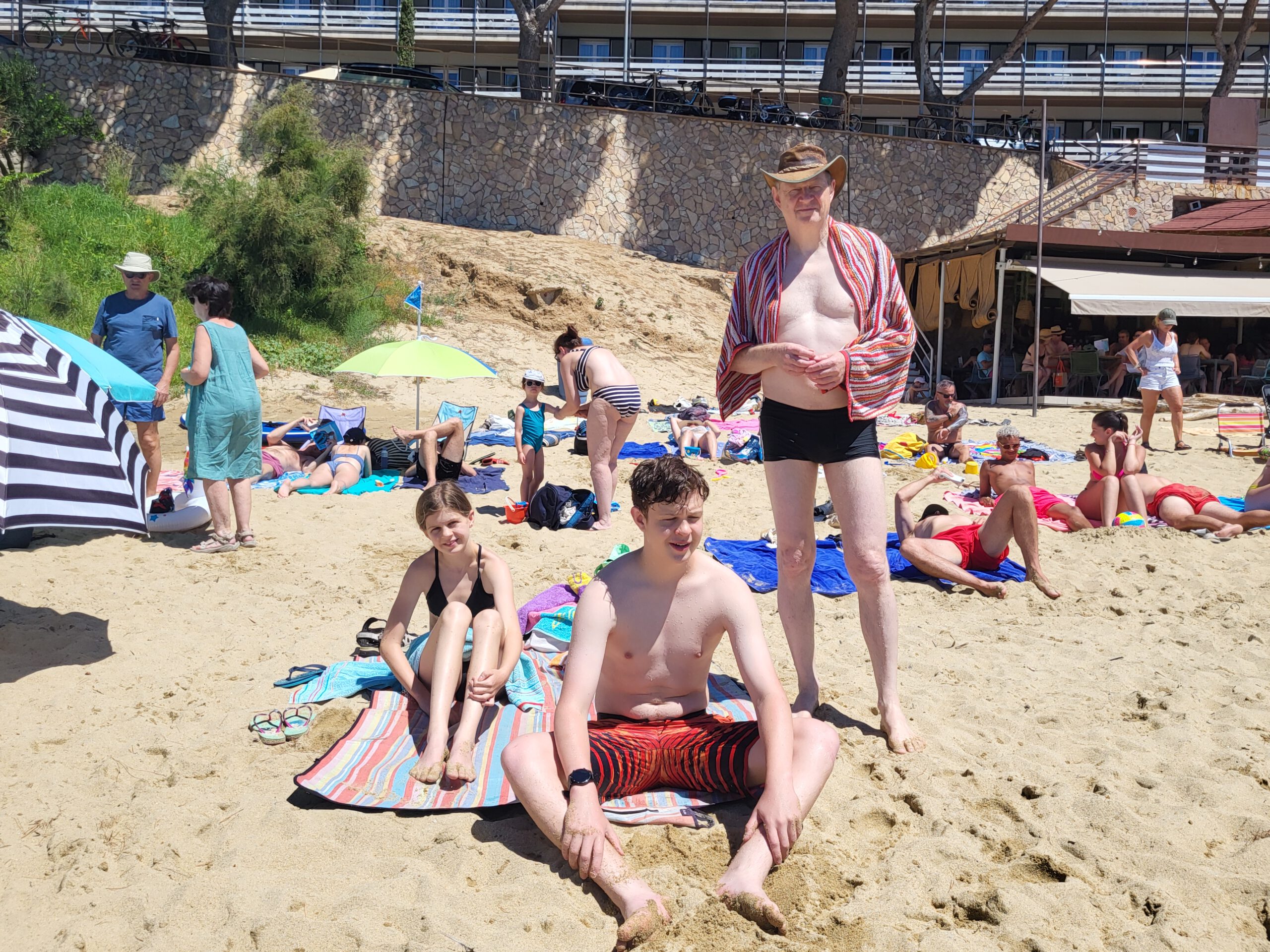 Aus der Ferne ein buntes Mosaik aus Handtüchern und Schirmen (wir haben unseren natürlich in Deutschland vergessen), aus der Nähe ein Wimmelbild. Aber wir finden noch einen Quadratmeter für unsere Decke und rennen direkt ins Wasser. Mit 25 Grad ausgesprochen angenehm. Feiner Sand, glasklares Wasser. Und nach einer Weile fällt uns auf: So schlimm ist das alles gar nicht, wenn man erstmal mittendrin ist. Eigentlich sogar ziemlich okay. Es sind alle Generationen und alle Figuren vertreten, es gibt Frauen oben ohne, es gibt Briten im Sonnenvollschutz. Teenager spielen kichernd Ball. Aber null Lärm, keine laute Musik, keine aggressiven Grüppchen, keine rotgebrannten Stiernacken - alles sehr gechillt.