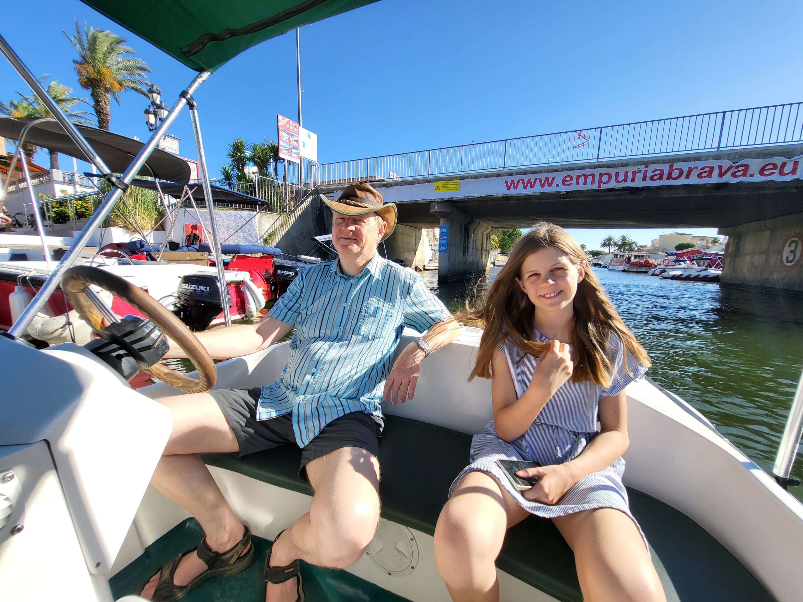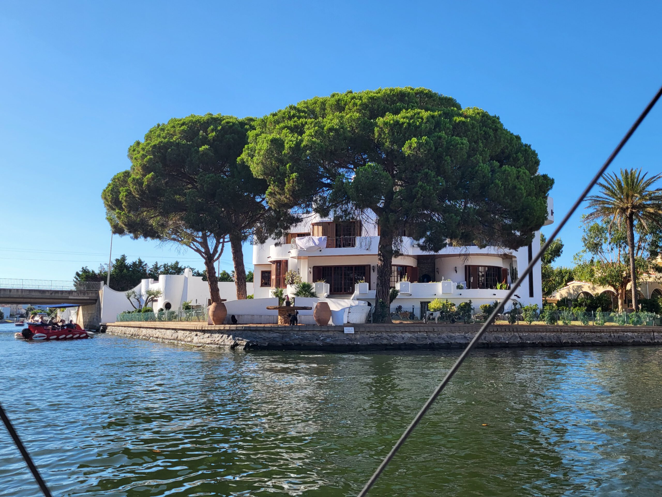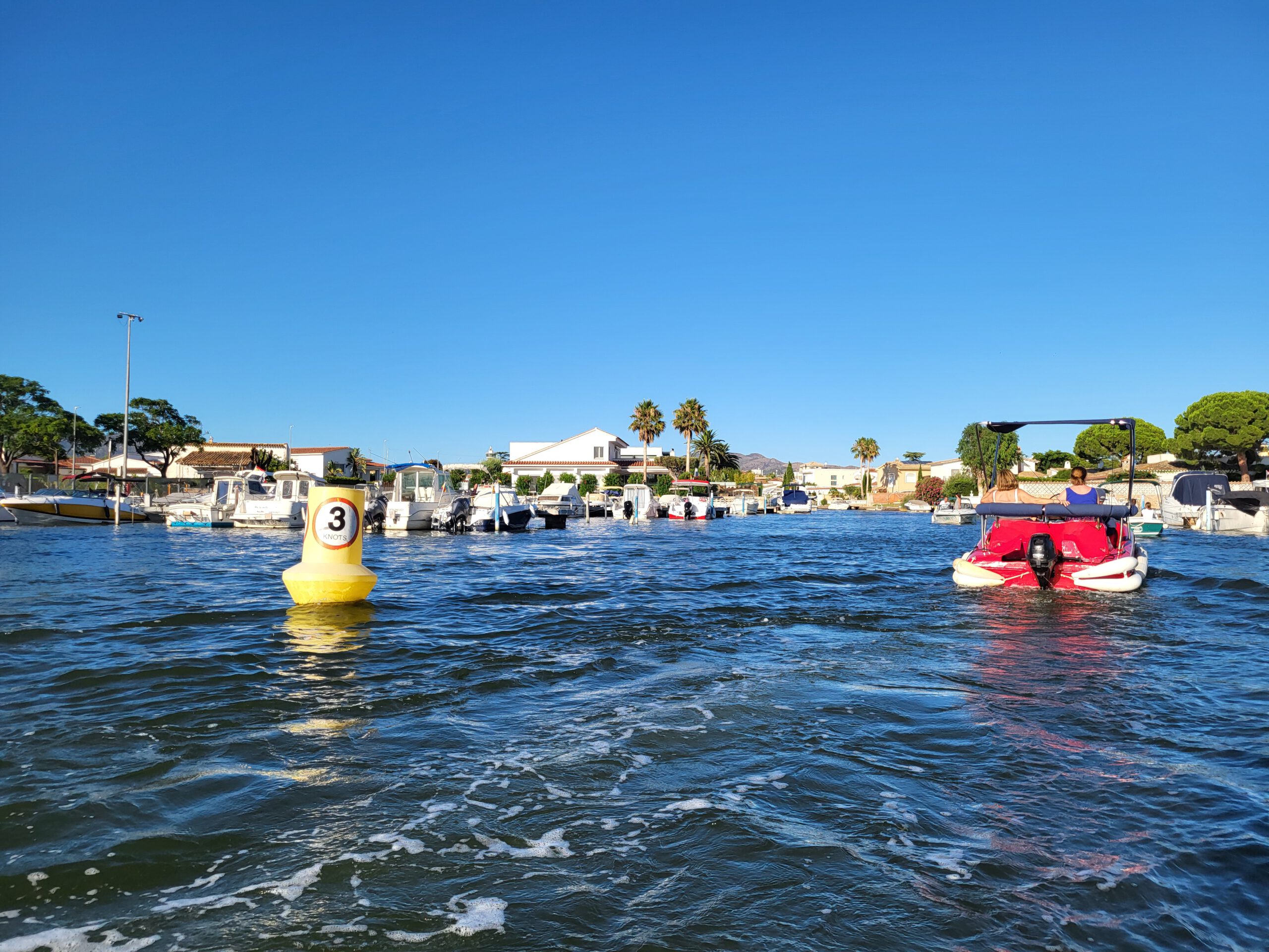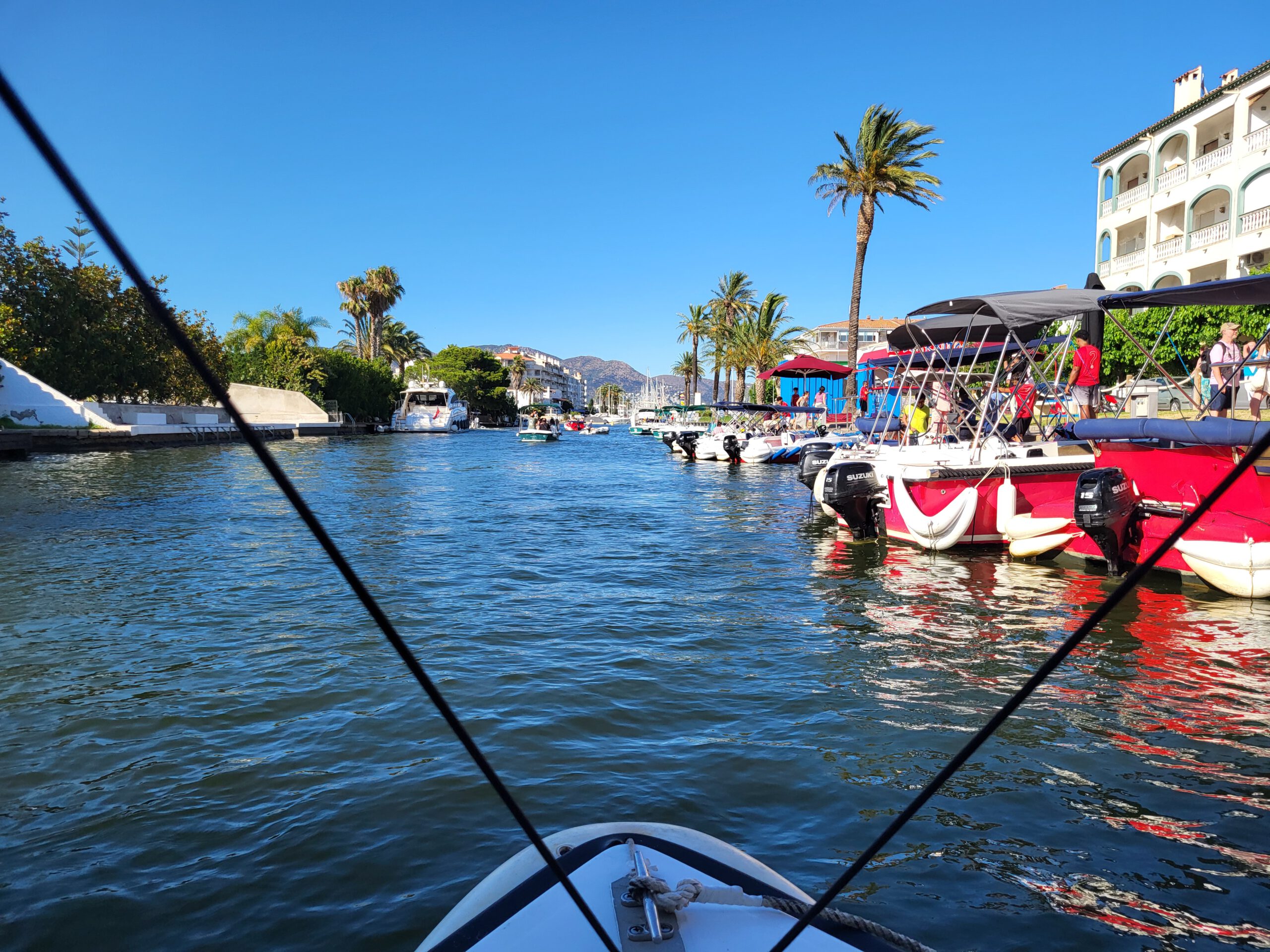 Um 16.45 Uhr ziehen wir wieder los, denn um 18.32 haben wir ein Boot gebucht. Tipp von Eva: Mit dem Elektroboot durch Empuriabrava schippern. Empuriabrava entstand in den 1960er Jahren, als vier Unternehmer - davon drei Besitzer der vorher landwirtschaftlich genutzten Flächen - die Idee hatten, am Reißbrett einen Ferienort zu Zimmern. Das besondere: Es gibt ein enges Netz an Kanälen, angeblich an die 5000 Anlegestellen direkt an den Häusern, die größte Marina der Welt. Das Konzept ging auf und ist bis heute ausgesprochen erfolgreich. Nachdem wir gesichtet haben, wo wir unser Boot abholen können, schauen wir uns erstmal zu Fuß um. Und holen sehr viele eisgekühlte Getränke und etwas Gebäck für die Fahrt.