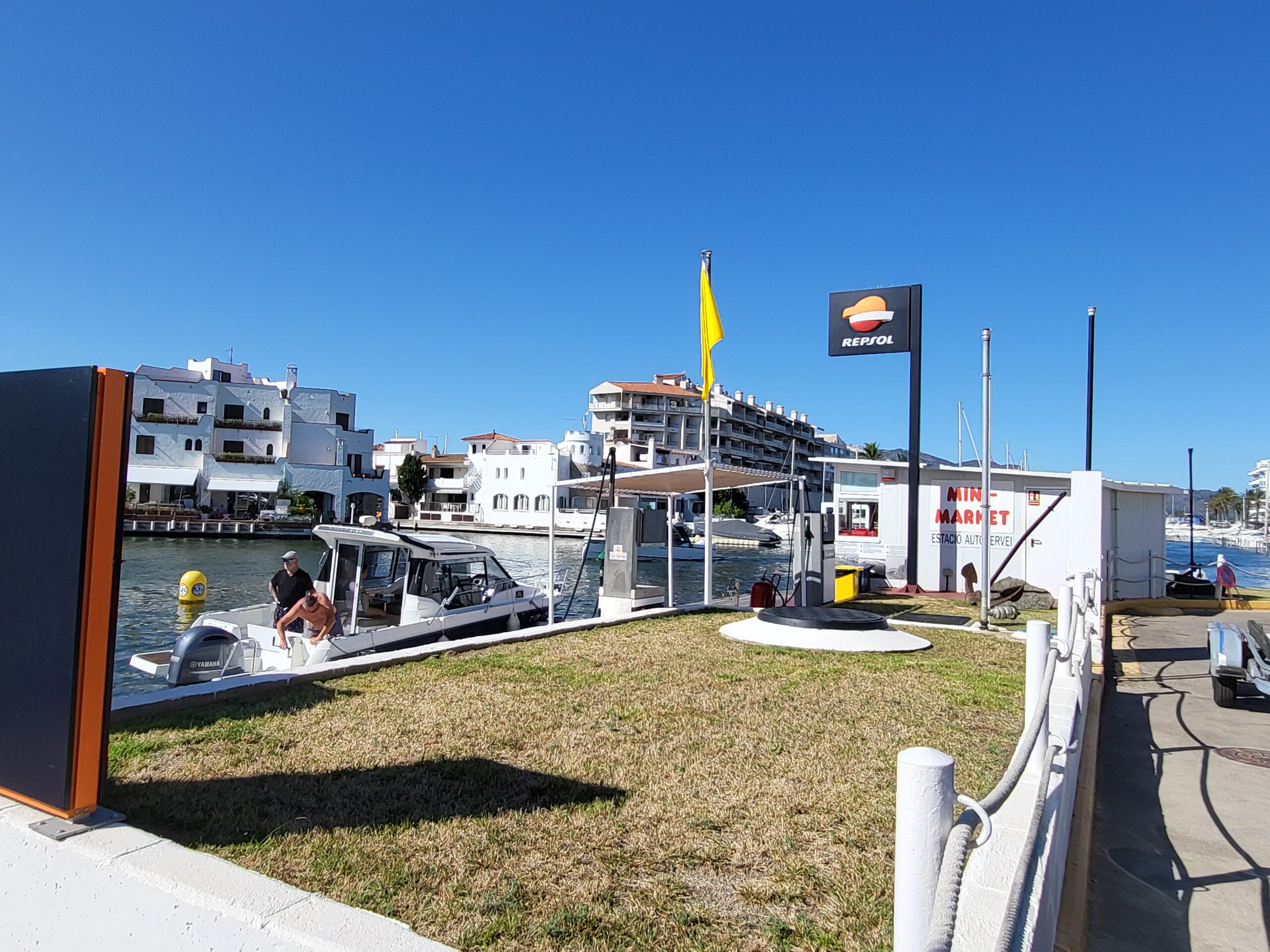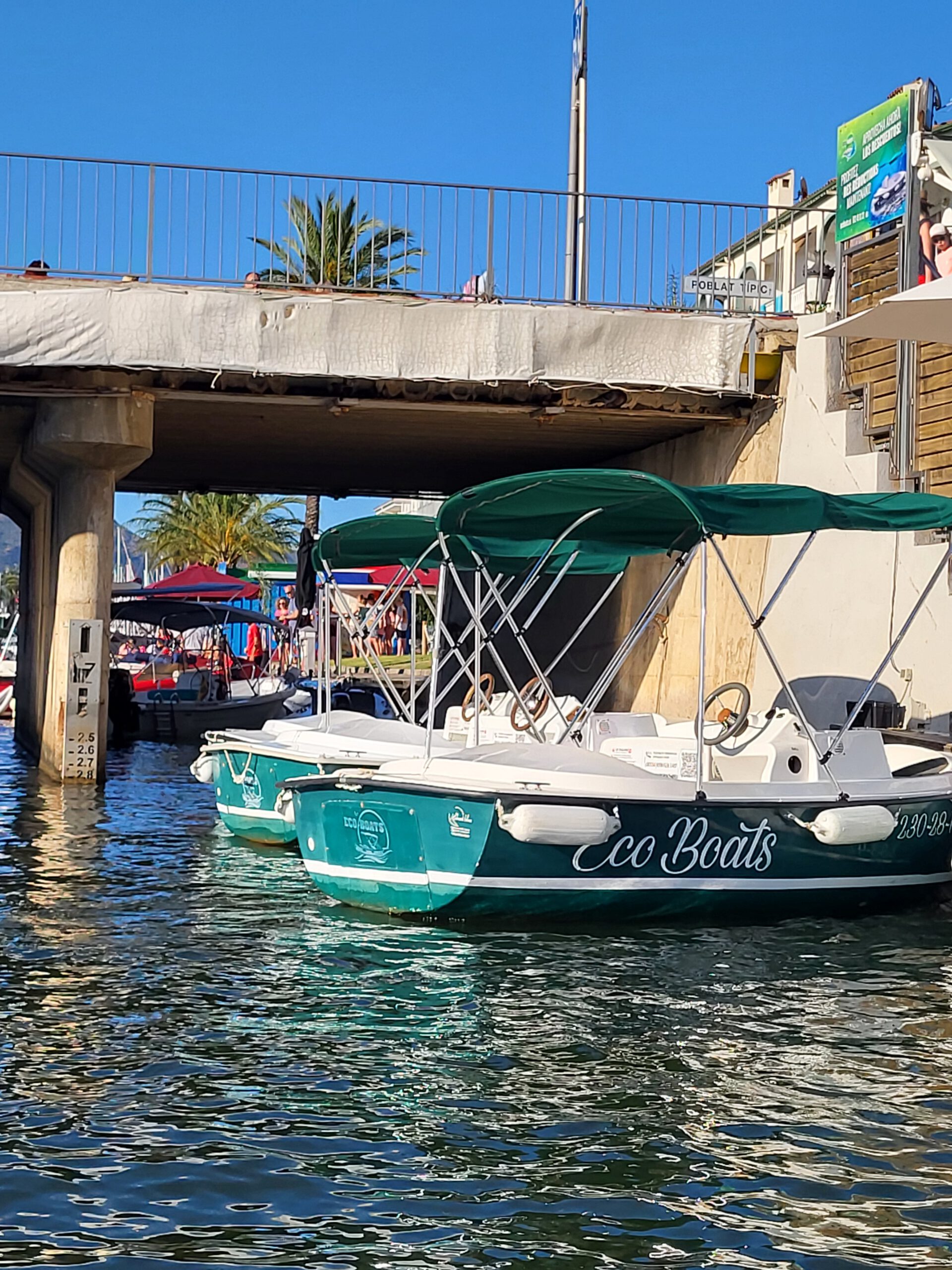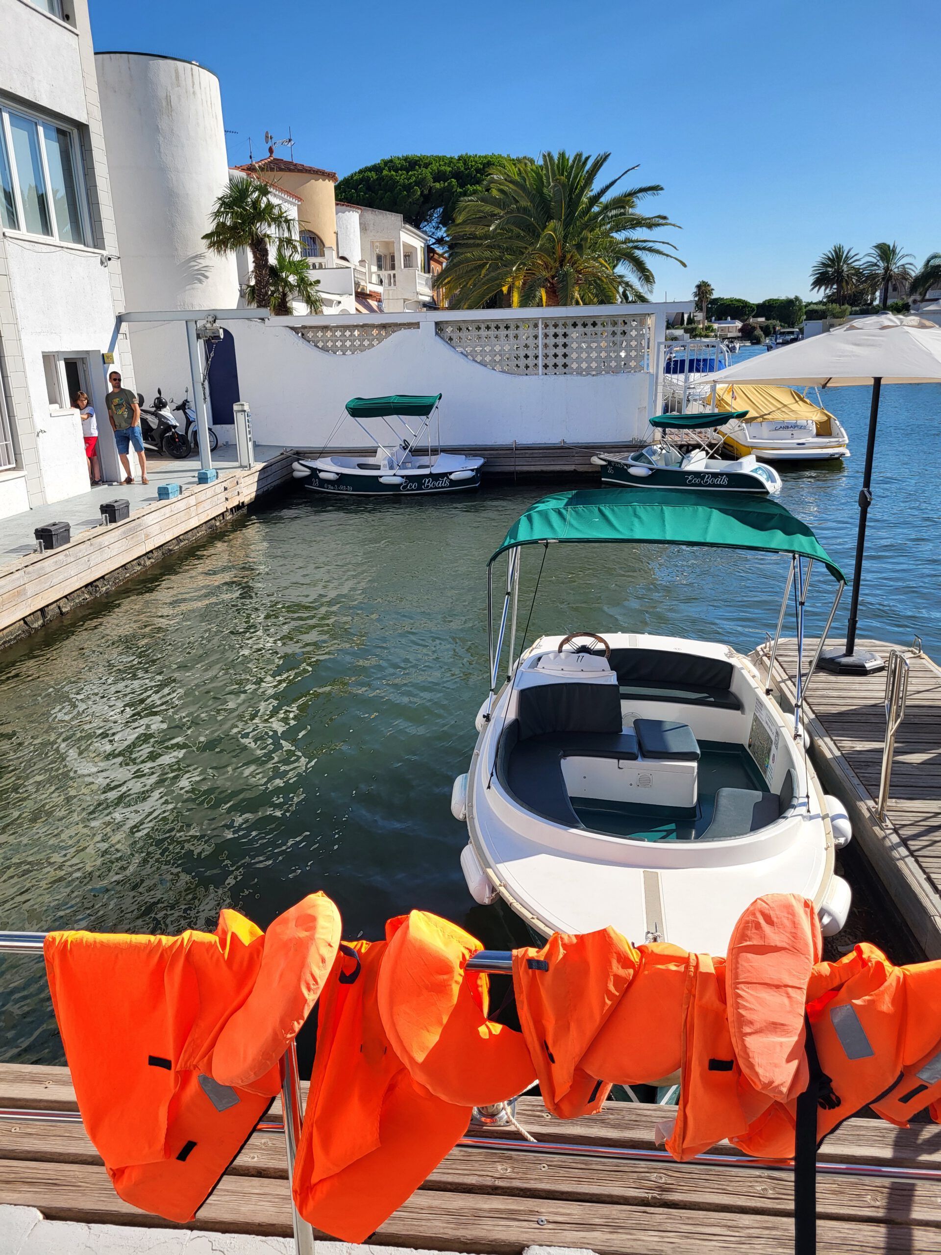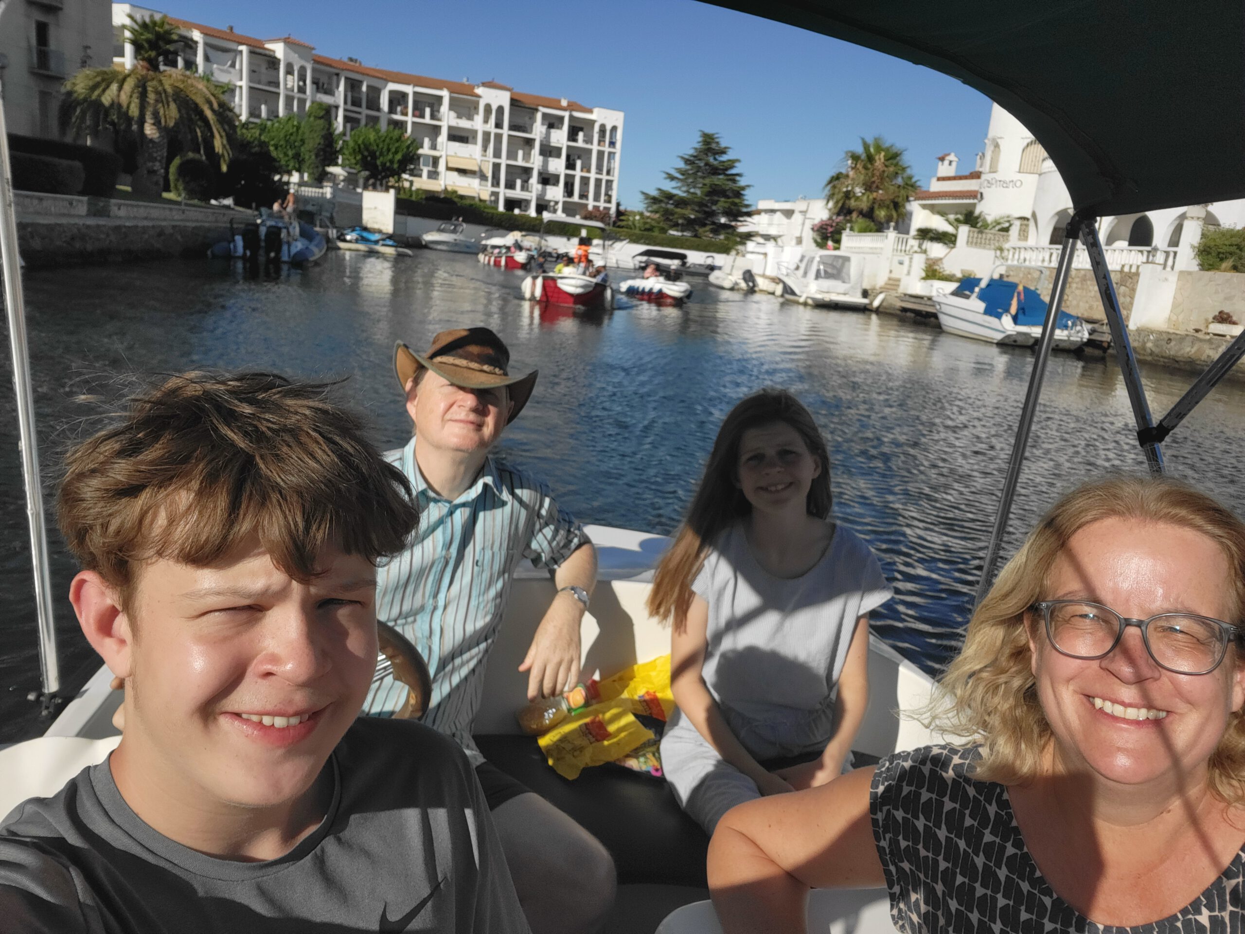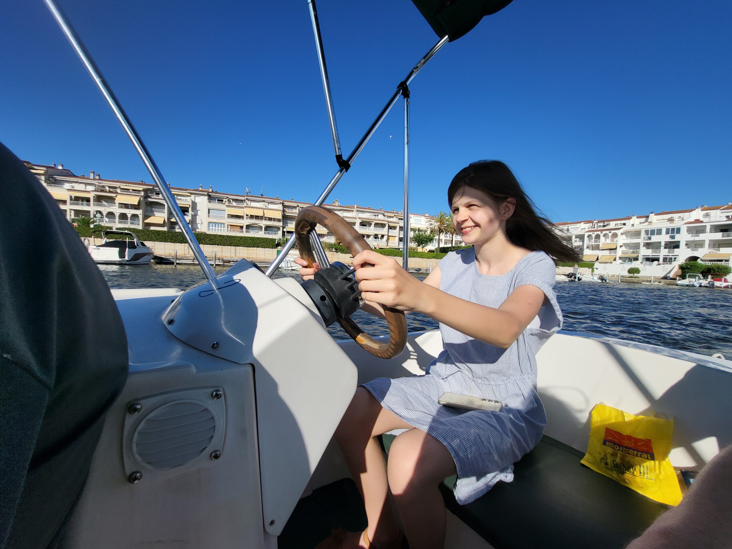 Um 16.45 Uhr ziehen wir wieder los, denn um 18.32 haben wir ein Boot gebucht. Tipp von Eva: Mit dem Elektroboot durch Empuriabrava schippern. Empuriabrava entstand in den 1960er Jahren, als vier Unternehmer - davon drei Besitzer der vorher landwirtschaftlich genutzten Flächen - die Idee hatten, am Reißbrett einen Ferienort zu Zimmern. Das besondere: Es gibt ein enges Netz an Kanälen, angeblich an die 5000 Anlegestellen direkt an den Häusern, die größte Marina der Welt. Das Konzept ging auf und ist bis heute ausgesprochen erfolgreich. Nachdem wir gesichtet haben, wo wir unser Boot abholen können, schauen wir uns erstmal zu Fuß um. Und holen sehr viele eisgekühlte Getränke und etwas Gebäck für die Fahrt.