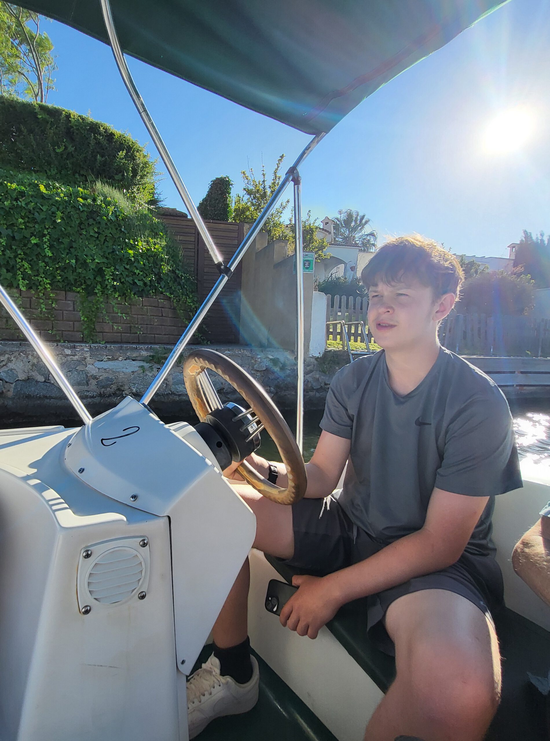 Dann fahren wir los. Der Wind weht uns um die Nase und das ganze ist ein ziemlicher Spaß. Da wären zum einen die drei Boote in der Hand indischer Großfamilien, mit einer Mama mit Sonnenbrille und pinkem Sari am Steuer, die immer wieder unserem Weg kreuzen. Dann gibt es natürlich die Häuser zu bestaunen, traditionelle Steinhäuschen, aber auch sehr moderne Architektur - und natürlich sehr schicke, sehr teure Boote vor der Haustür. Louisa darf ans Steuer und zuckelt strahlend und durchaus souverän durch einen kleine See. Danach übernimmt Kilian ... Und wir wünschen seinem künftigen Fahrlehrer jetzt schon Nerven aus Stahl. Seine Fahrtanteil war auf jeden Fall der spannenste, in jeder Hinsicht. Aber wir haben keine Yacht und auch kein anderes Boot gerammt ("ich fahr doch schon rechts, was habt ihr denn, da ist doch noch viel Platz...") und rechtzeitig vor dem Verleih übernimmt Gerald wieder und parkt ein.