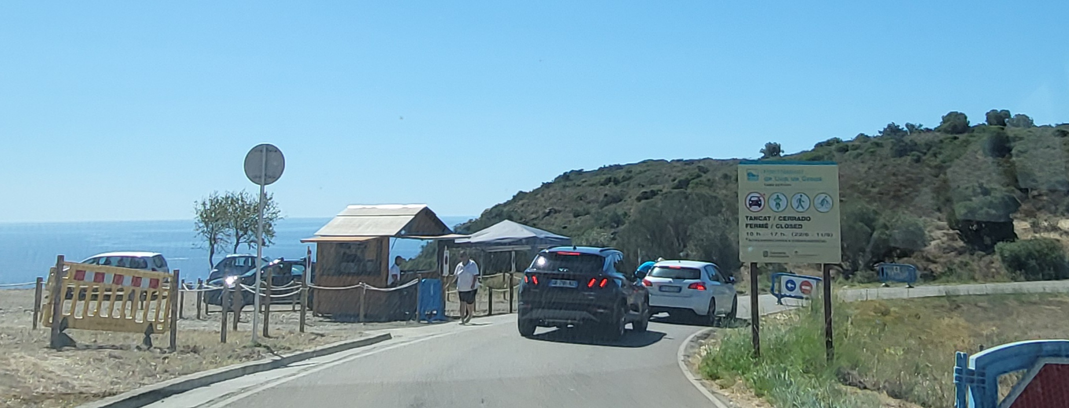 Der Nationalpark Cap de Creus ist während der Sommermonate zwischen 10 und 17 Uhr für Privatfahrzeuge gesperrt, nur dieses Touribimmelbähnchen juckelt durch. Aber genau in diesem Gebiet liegen auch die vielen kleinen türkisfarbenen Buchten... Die Lösung: Man bucht zum Beispiel einen Tisch im Restaurant La Pelosa am gleichnamigen Strand. Dann bekommt man eine Whatsapp, die man am Kontrollpunkt vorzeigen kann. Das hatte uns die Wirtin verraten, als wir vorgestern Abend kurz in der Bucht waren.