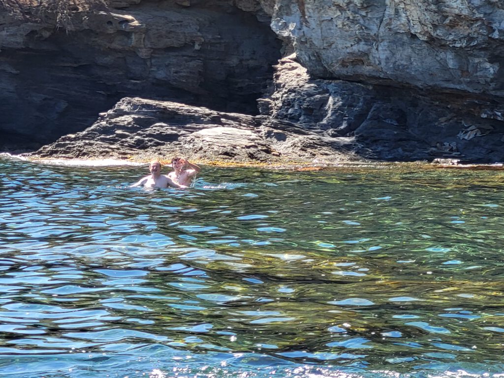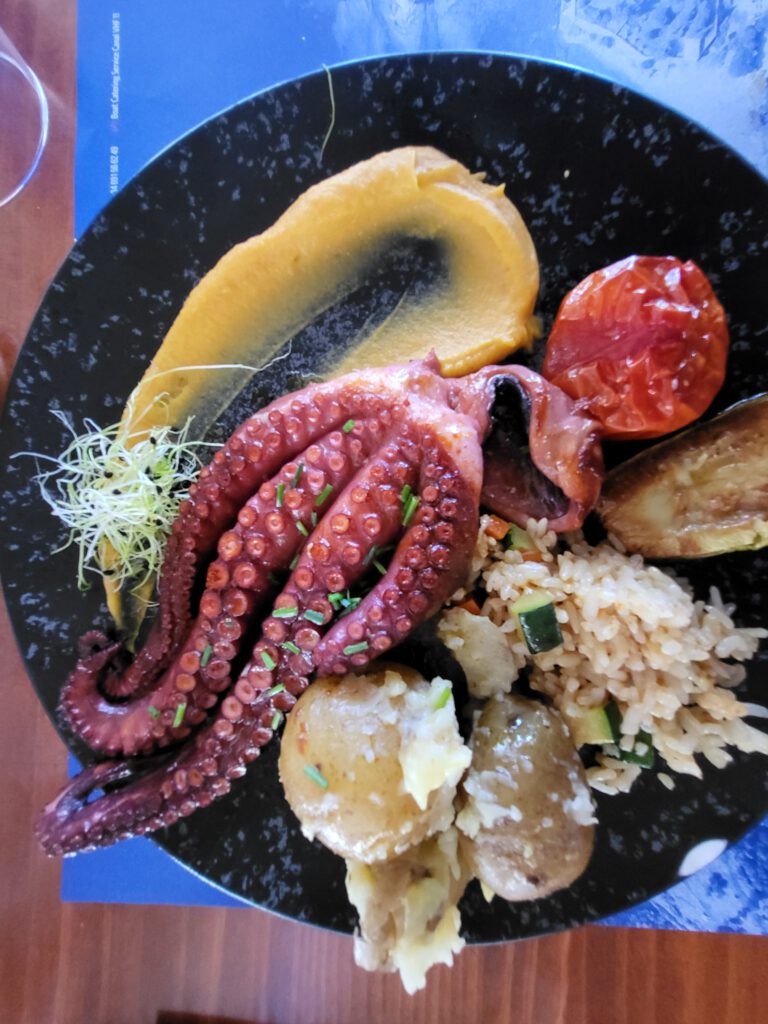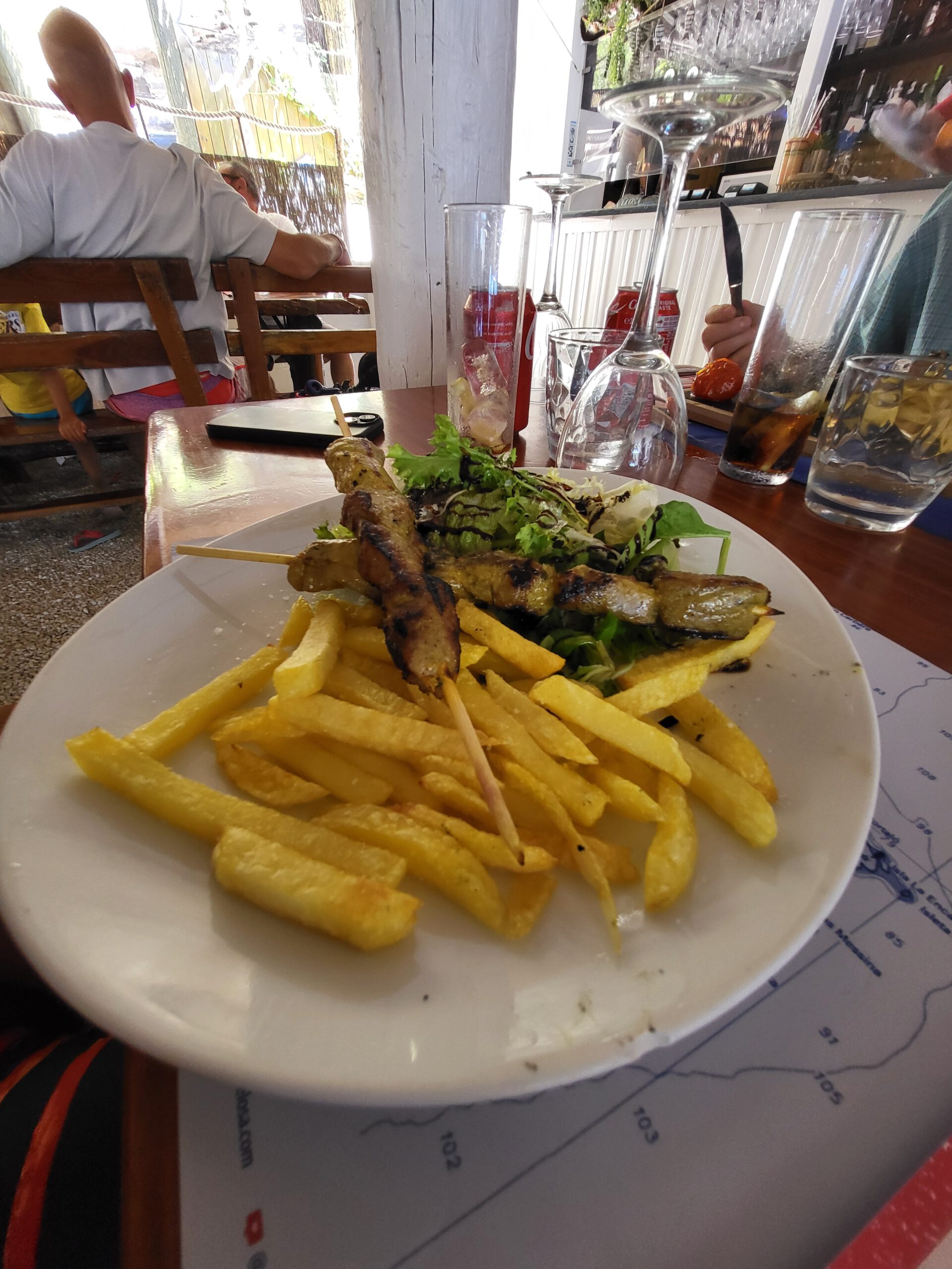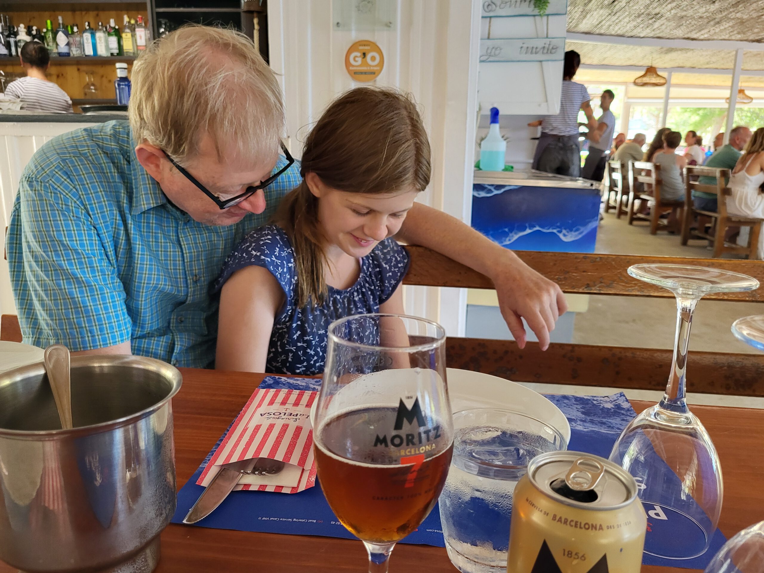 Sandstrand, glasklares Wasser, viel zu gucken. Denn diverse Taxiboote bringen immer wieder Menschen von den Yachten zum Restaurant. Kilian taucht, Louisa hängt in der Ananas ab, Nicole treibt in den Wellen und Gerald schwimmt. Im Restaurant sind um 13.30 Uhr alle Tische belegt, geschätzt mindestens 200 Gäste. Und es mundet, Oktopus, Steak, Spieße, Huhn, alles vom Grill. Sehr witzig die Reaktion der (spanischen) Bedienung auf die Frage, ob wir einen (italienischen) Affogato haben könnten. Affo- was? Naja, also Kaffee und etwas Eis - ein absolut entsetzter Blick! Diese Deutschen wieder! Eis im Kaffee, wer macht den sowas? Sie bietet uns einen Cappuccino mit Sahne an, wenn sowas schon sein muss. Danke, nein. Es gibt dafür zwei hervorragende kleine Kaffee ohne Schnick-Schnack.