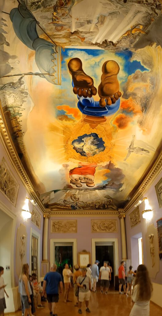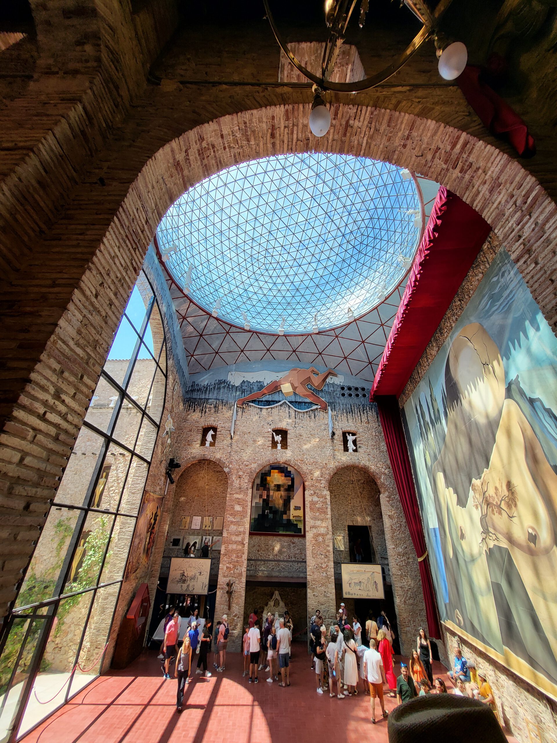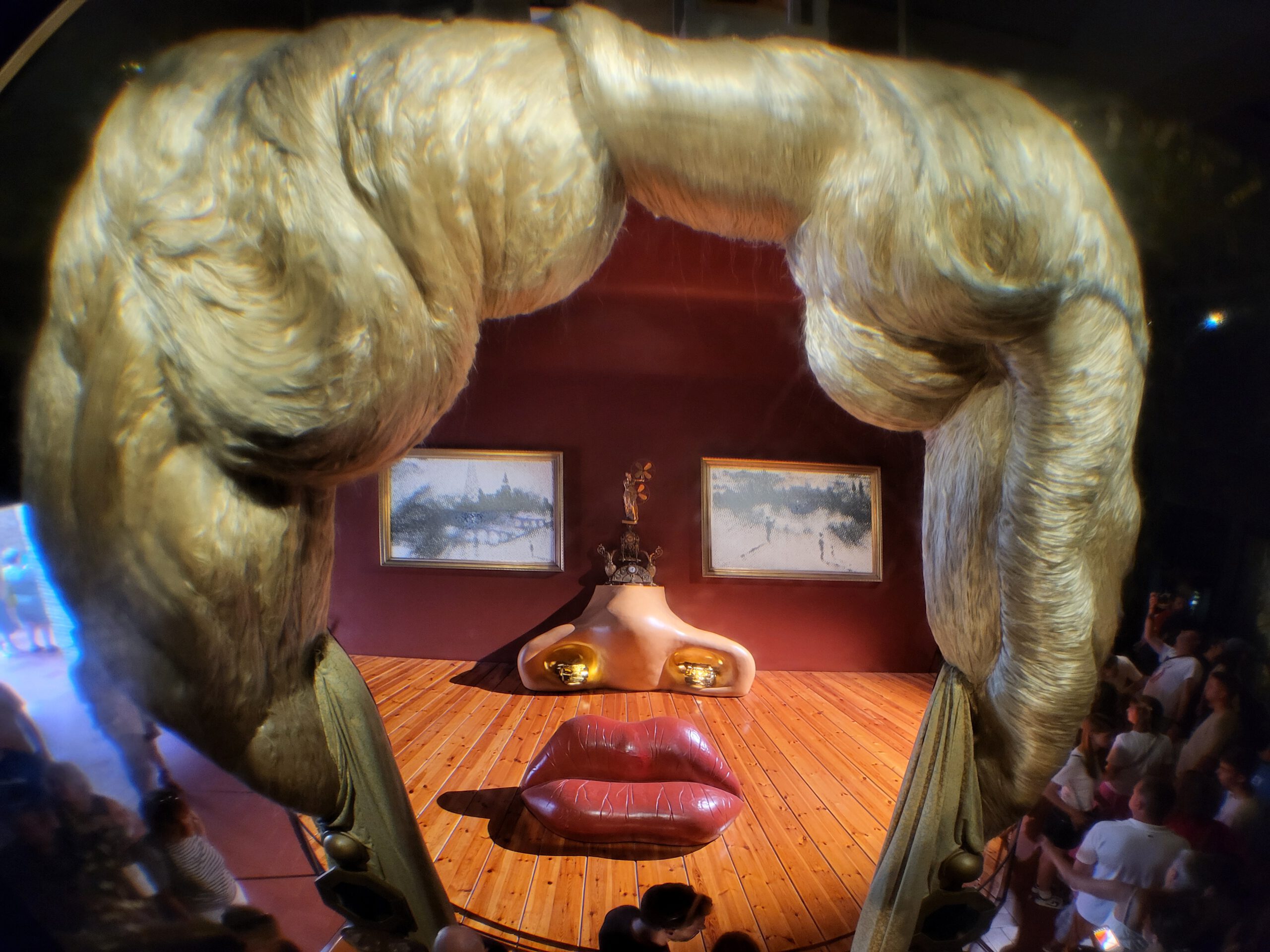 Dali selbst hatte das ehemalige Stadttheater von Figueres, das 1939 durch einen Brand zerstört worden war, zwischen 1961 und 1974 umgebaut. Es gibt keinen Audioguide, es gibt keine vorgegebene Route, barrierefrei ist das Gebäude auch nicht. Allerdings hat es draußen 35 Grad, die Klimaanlage kommt kaum nach und dass die Zeitfenster ausgebucht sind, macht das alles nicht besser. Gerade die kleinen Räume sind knallvoll und stickig, immer wieder muss man anstehen. Merken für ein mögliches nächstes Mal: Nachttour im August buchen.