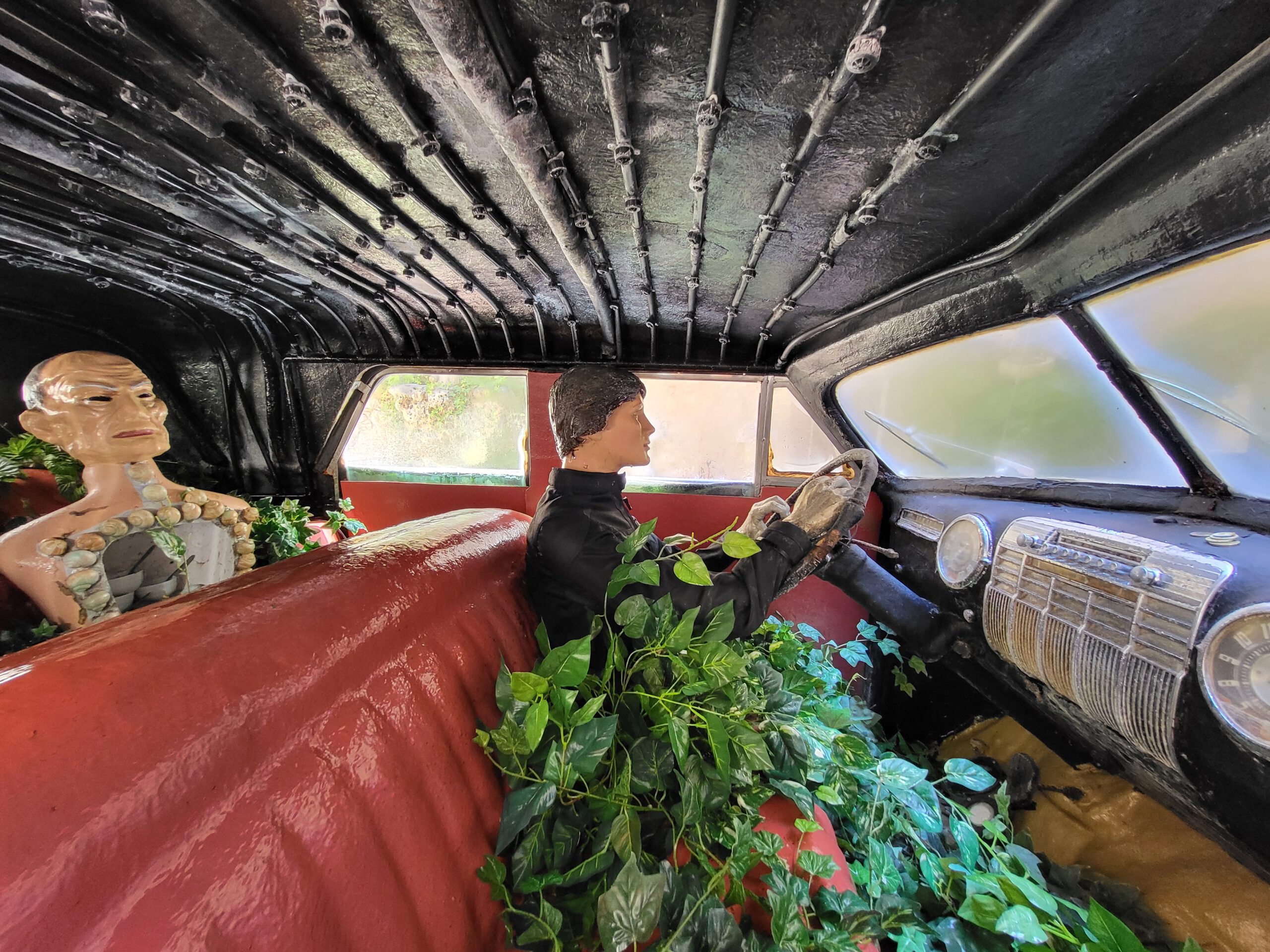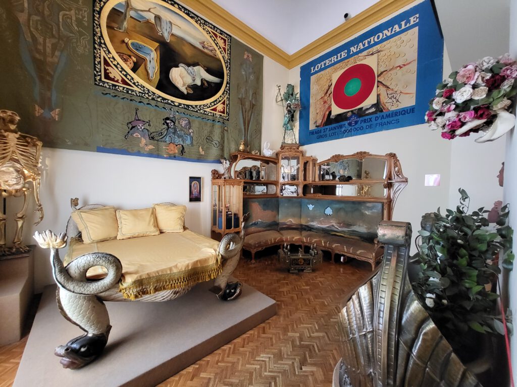 Es gibt so viel zu sehen, beginnend mit dem imposanten Regentaxi im Hof, über eine Mae-West-Installation, in der Möbelstücke ein Gesicht bilden, bis hin zu Frühwerken, späten Grafiken, goldenem Kunsthandwerk aus der Hand des Meisters selbst. Der übrigens unter einer ganz schlichten Grabplatte begraben liegt.