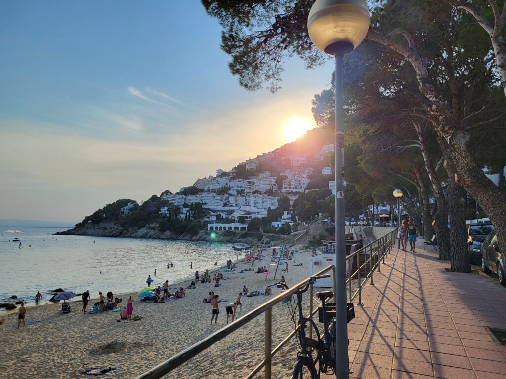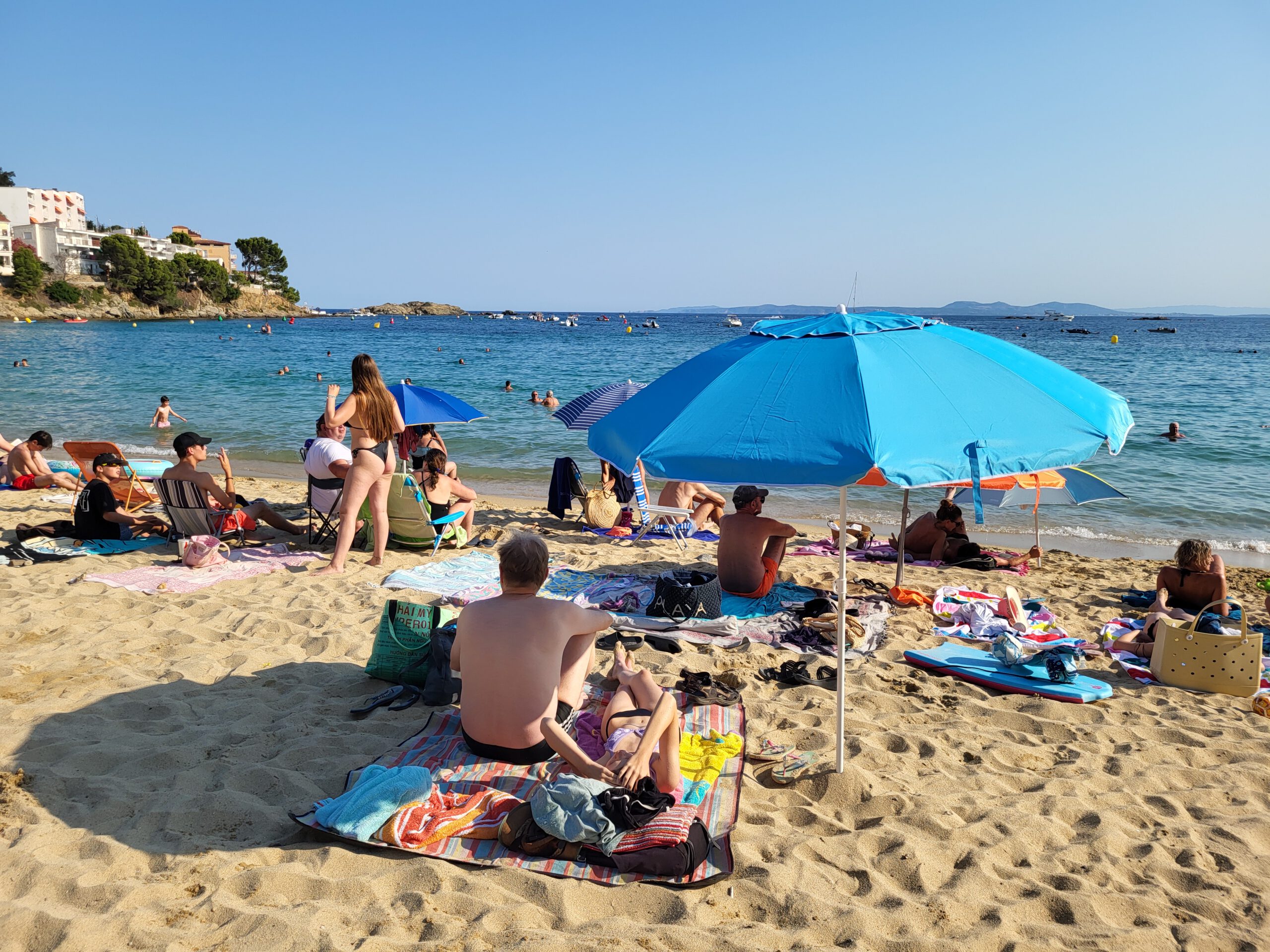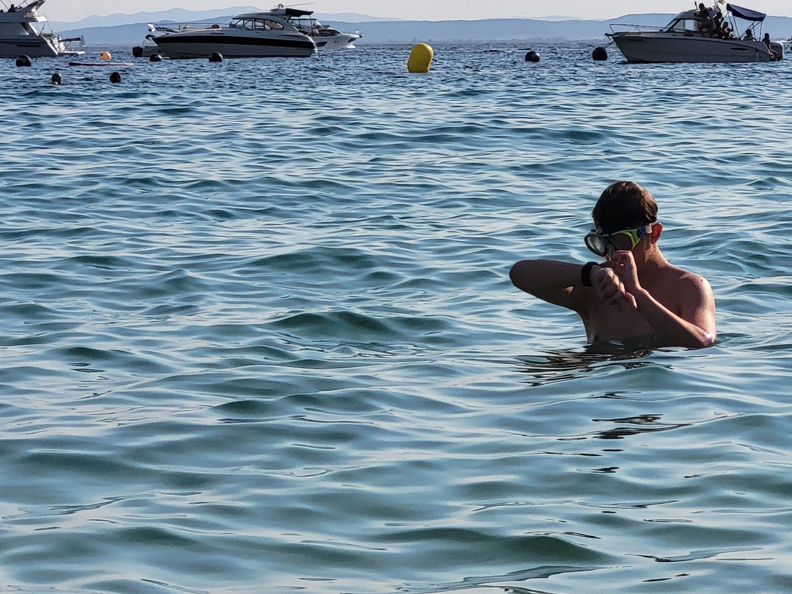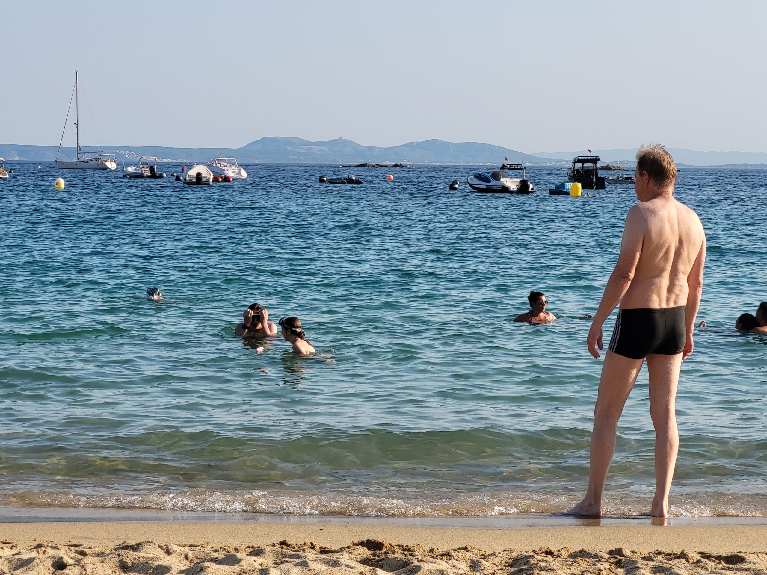 Natürlich gehen wir dann ans Meer, wenn weniger los ist. Dachten wir uns. Und stellen um 17.40 Uhr fest: Diese gute Idee hatten noch ganz viele andere. Aber wir finden noch einen Quadratmeter, die Atmosphäre ist genauso entspannt wie letztes Mal. Tauchen, Treiben, Schwimmen, Plantschen. Gegen 19.20 Uhr machen wir uns wieder auf den Weg. Noch ein Souvenir mit Louisa im Laden holen, noch die letzte Ladung Wäsche aus der Maschine holen. Abendessen in der abgekühlten Abendluft, etwas wehmütig.